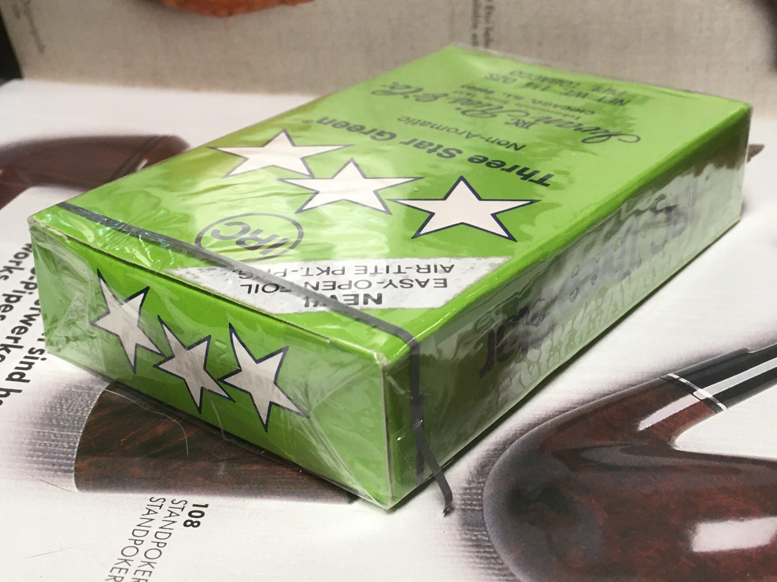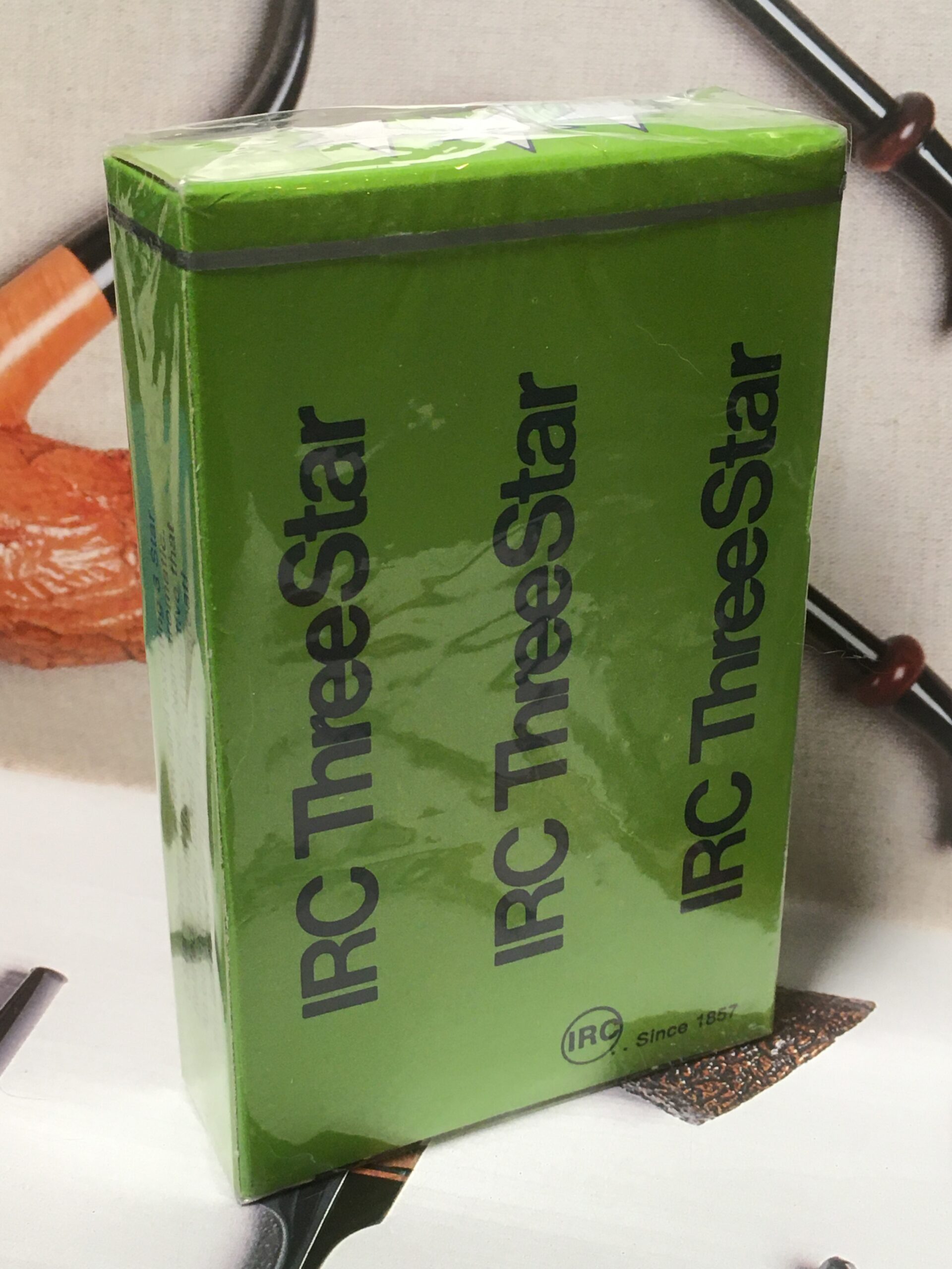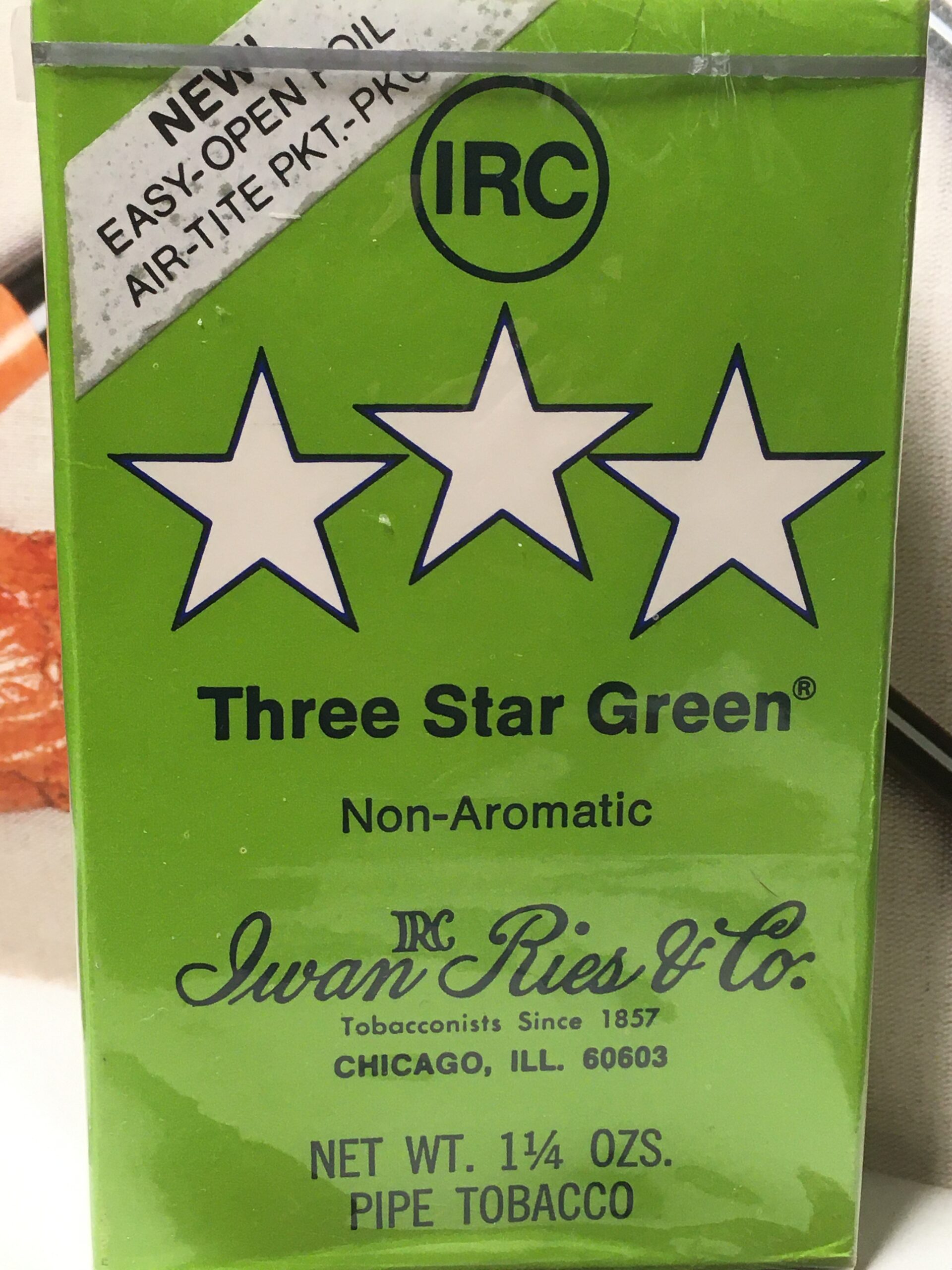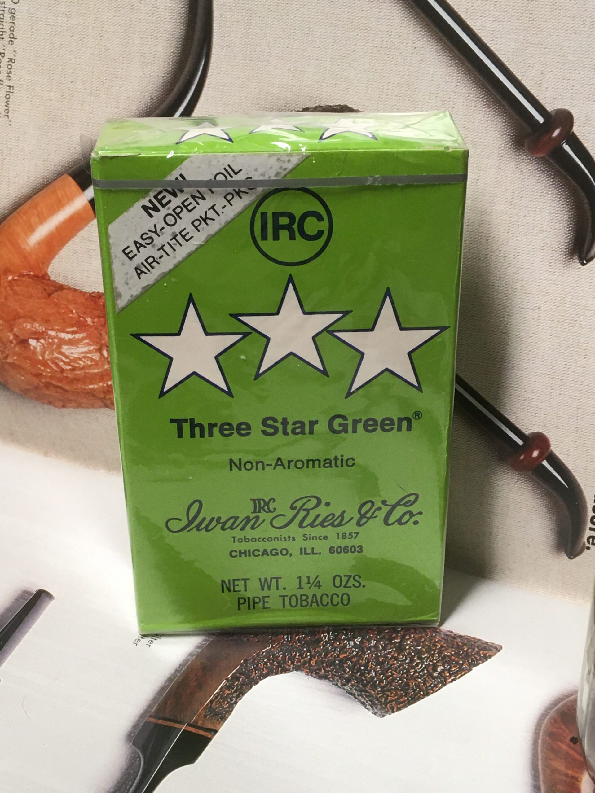 Vintage IRC / Iwan Ries & Co. THREE STAR GREEN Non-Aromatic Pipe Tobacco (1990s) 1 1/4 oz, pouch in clear plastic, factory sealed box.