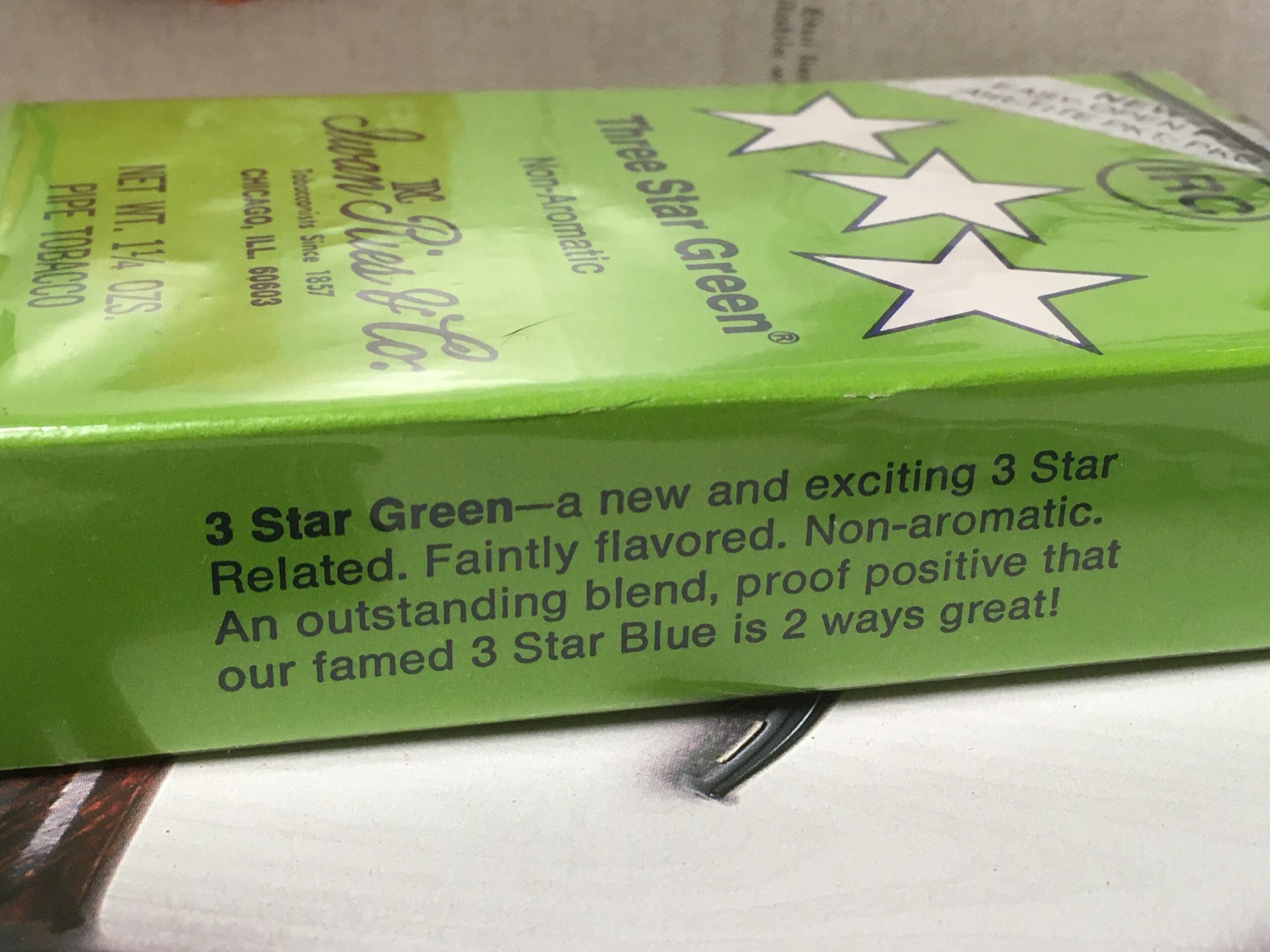 "3 Star Green - a new and exciting 3 Star Related. Faintly flavored. Non-aromatic. An outstanding blend, proof positive that our famed 3 Star Blue is 2 ways great!"