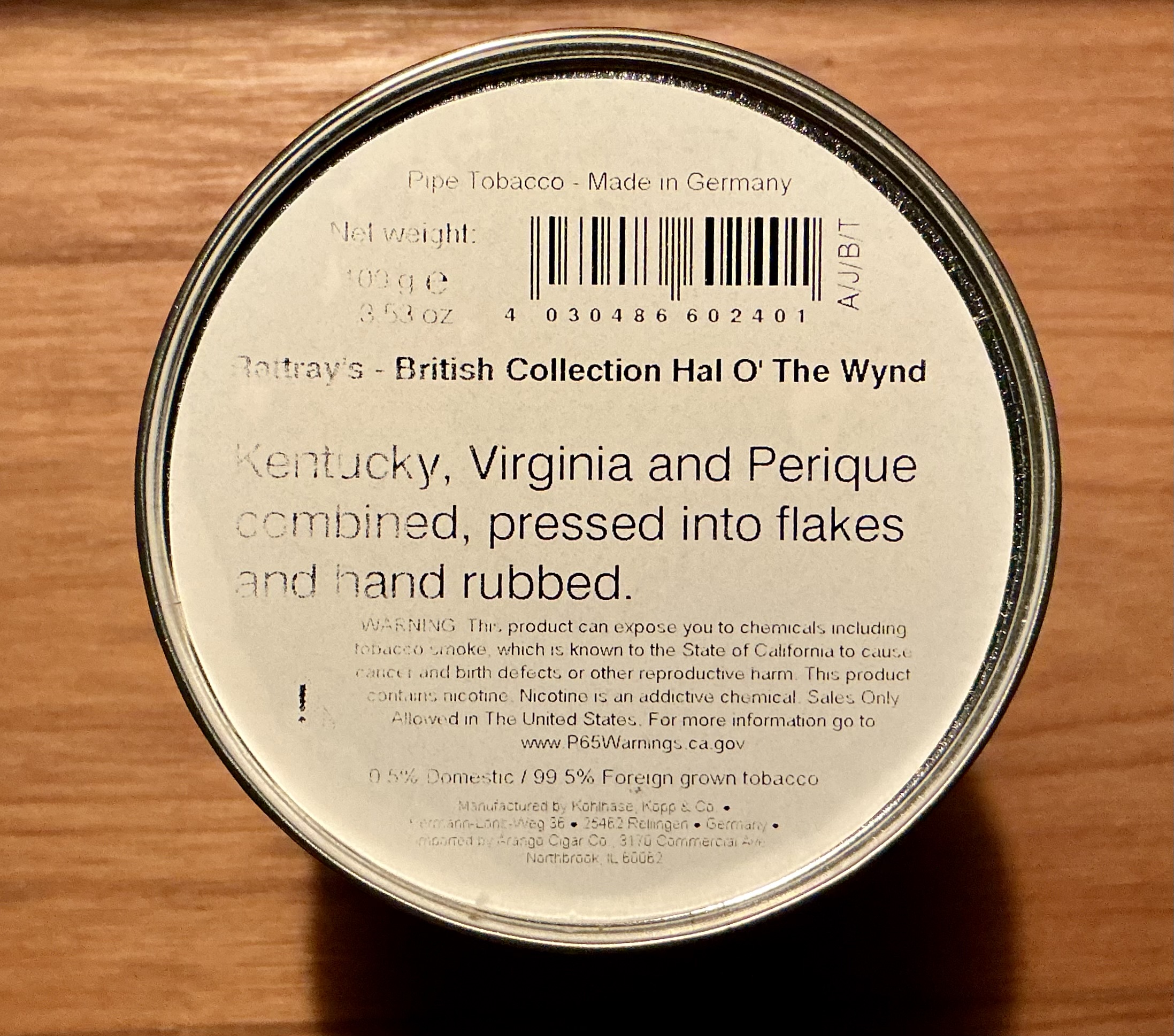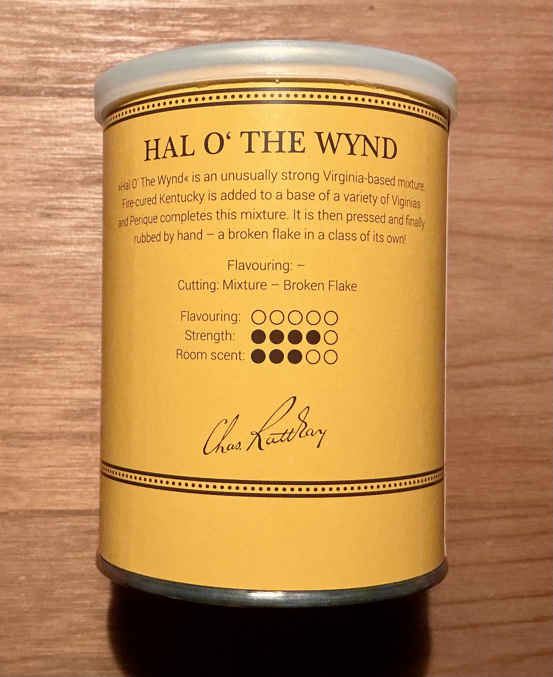 "A pure Virginian tobacco of a most unusual share of strength". This is a strong, sharp aged red Virginia blend that will perk you up quickly. New tin description: "Hal O' The Wynd" is an unusually strong Virginia-based mixture. Fire-cured Kentucky is added to a base of a variety of Virginias and Perique completes this mixture. It is then pressed and finally rubbed by hand.