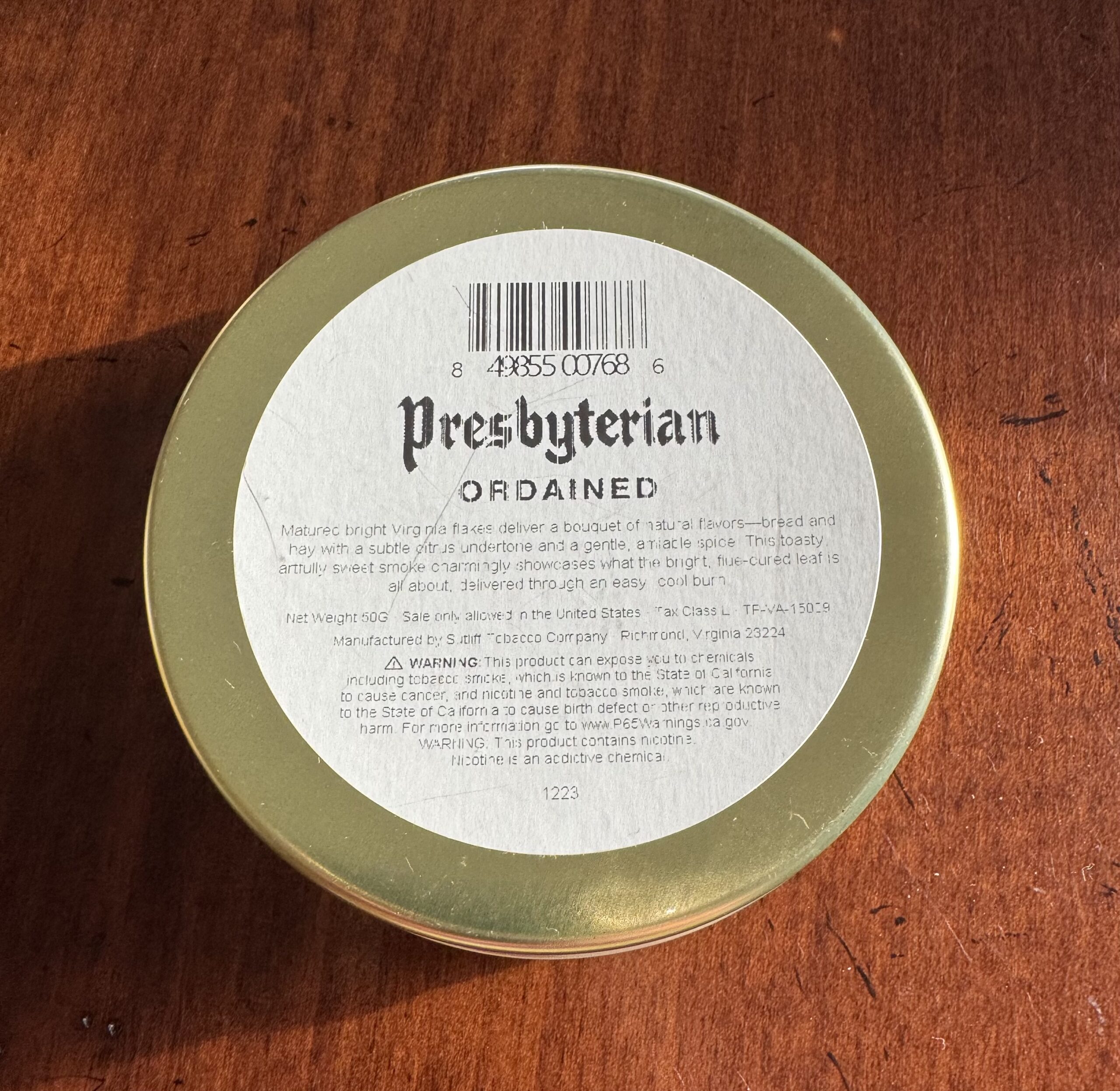 Sealed tin of matured bright red Va flake flue cured. Notes of bread and hay, light citrus, and gentle spice. Delivers an easy, cool smoke.