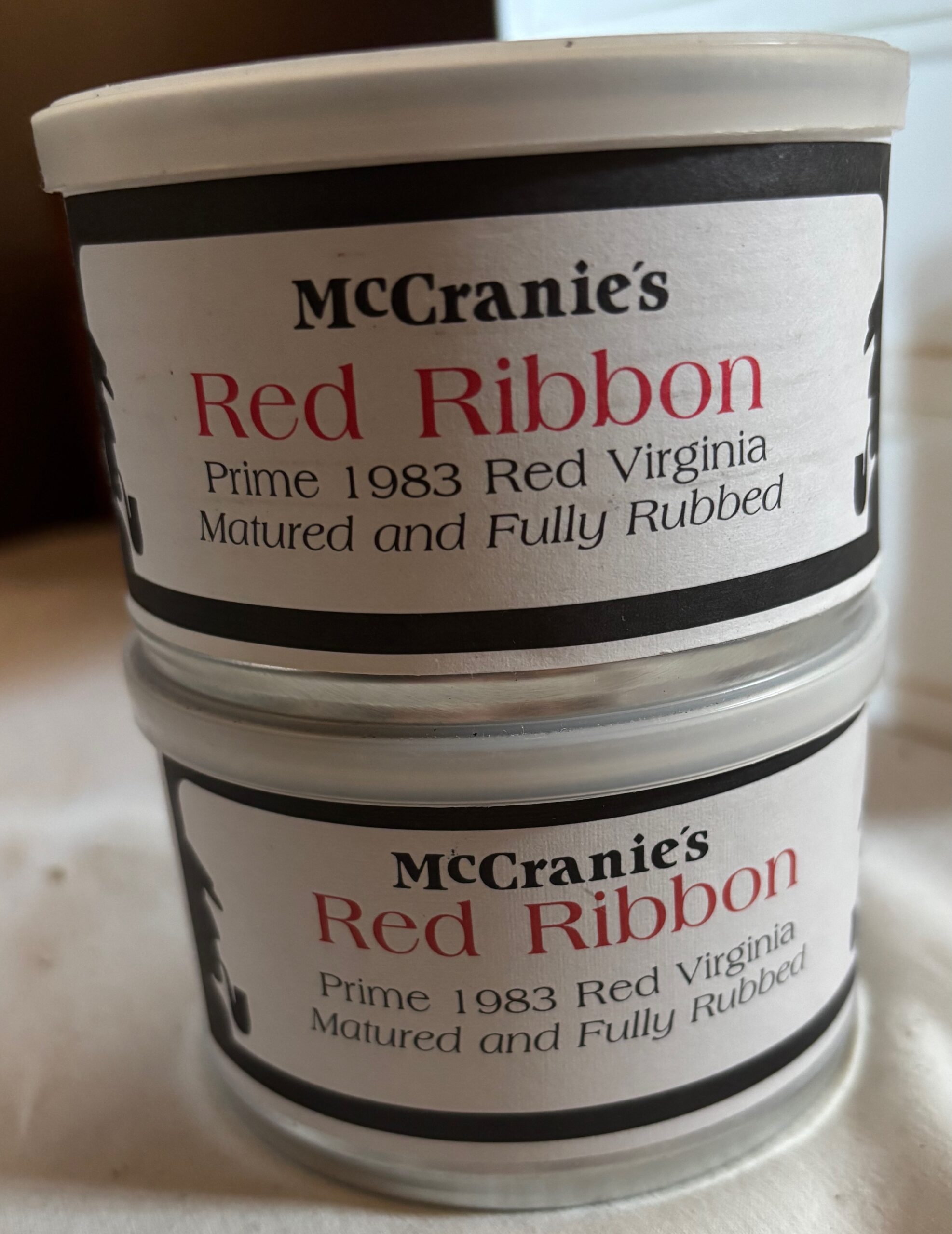 Two unopened 50g tins of McCranie's Red Ribbon 1983 (produced by McClelland). Tinned in 4/99. Original purchaser and stored in cool, dry, dark strorage.
