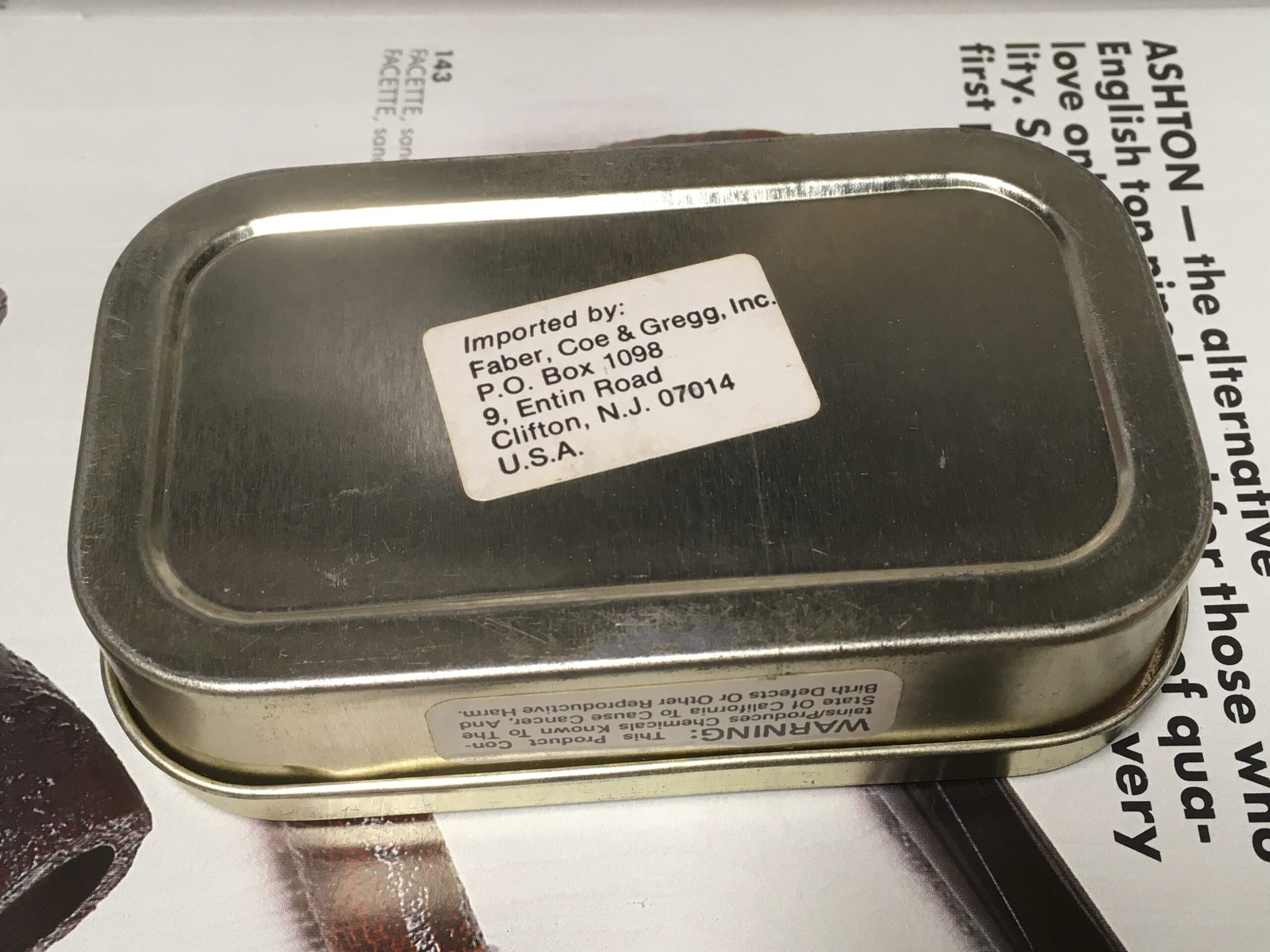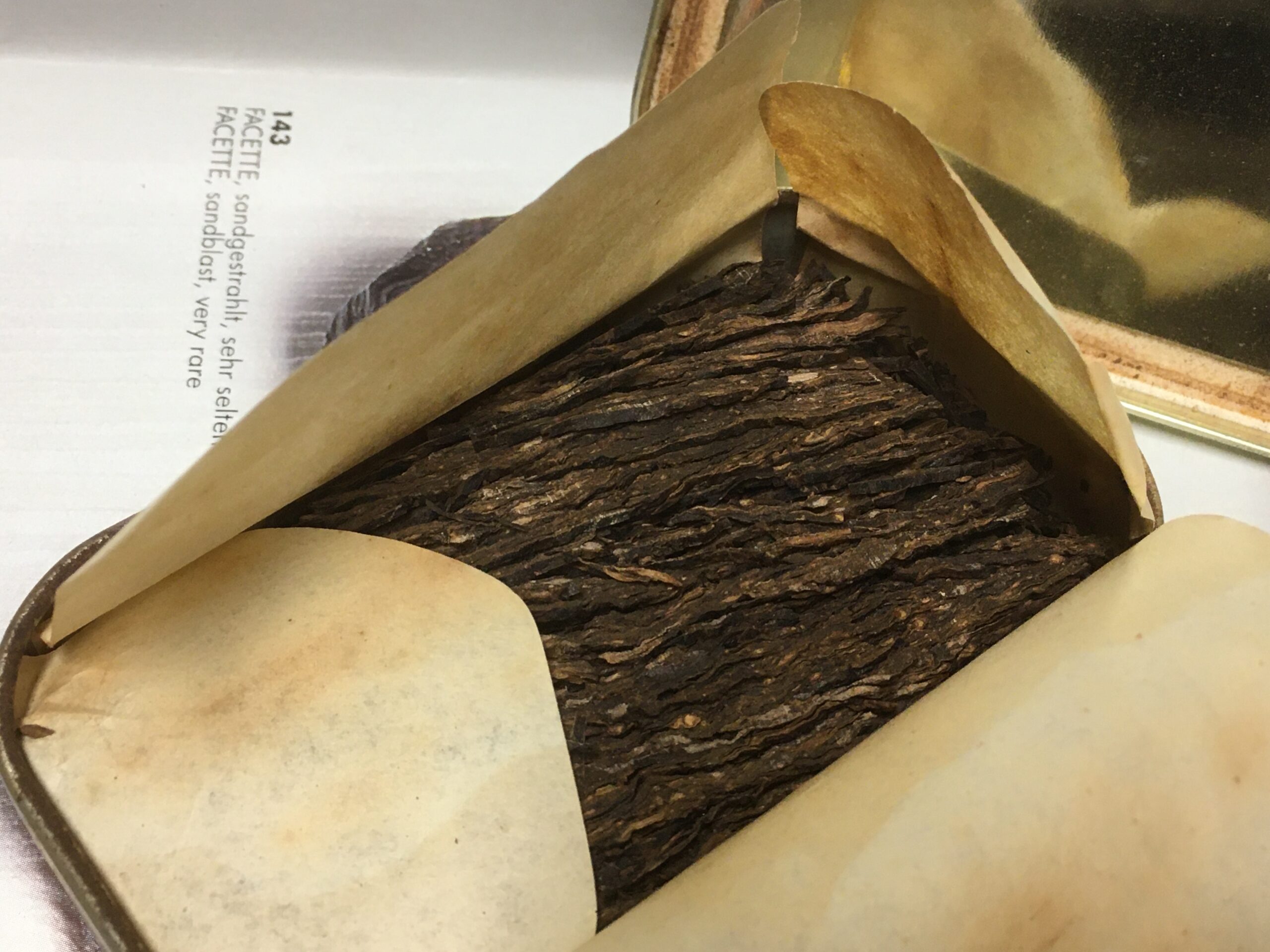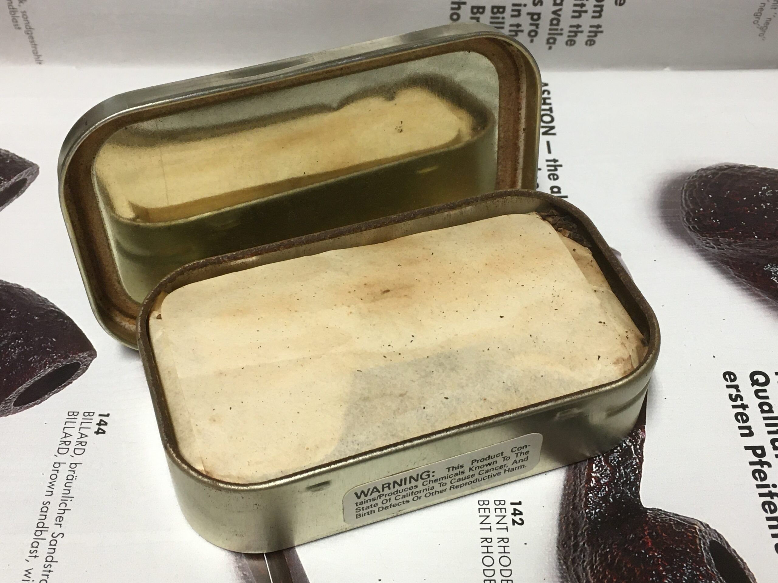 Tin lost its seal, likely long ago, but the contents appear to be undisturbed. Liner paper was carefully lifted open to show its fullness in pics.