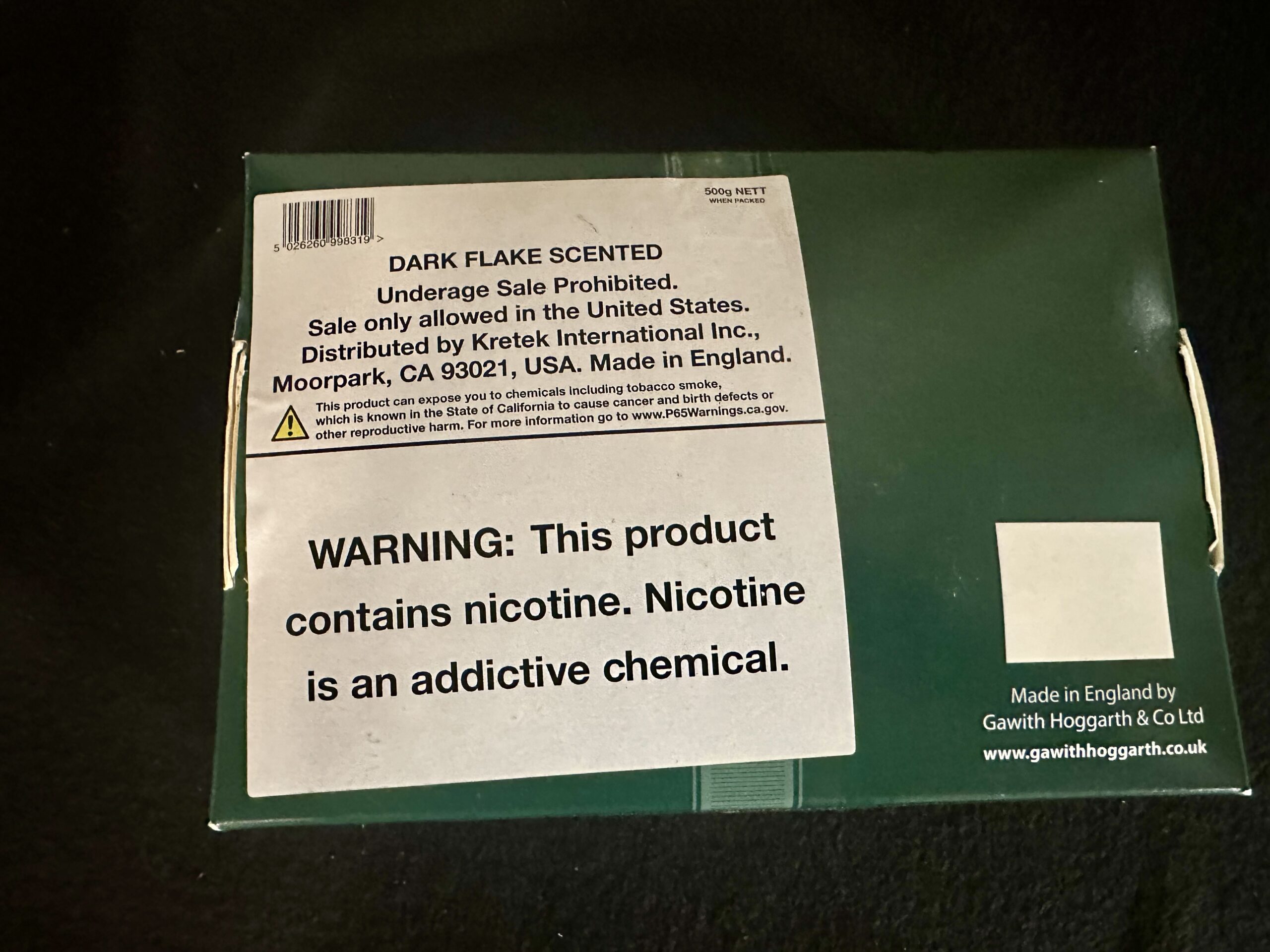 This auction is for a 500g box of 2019 Gawith Hoggarth Dark Flake Scented.
