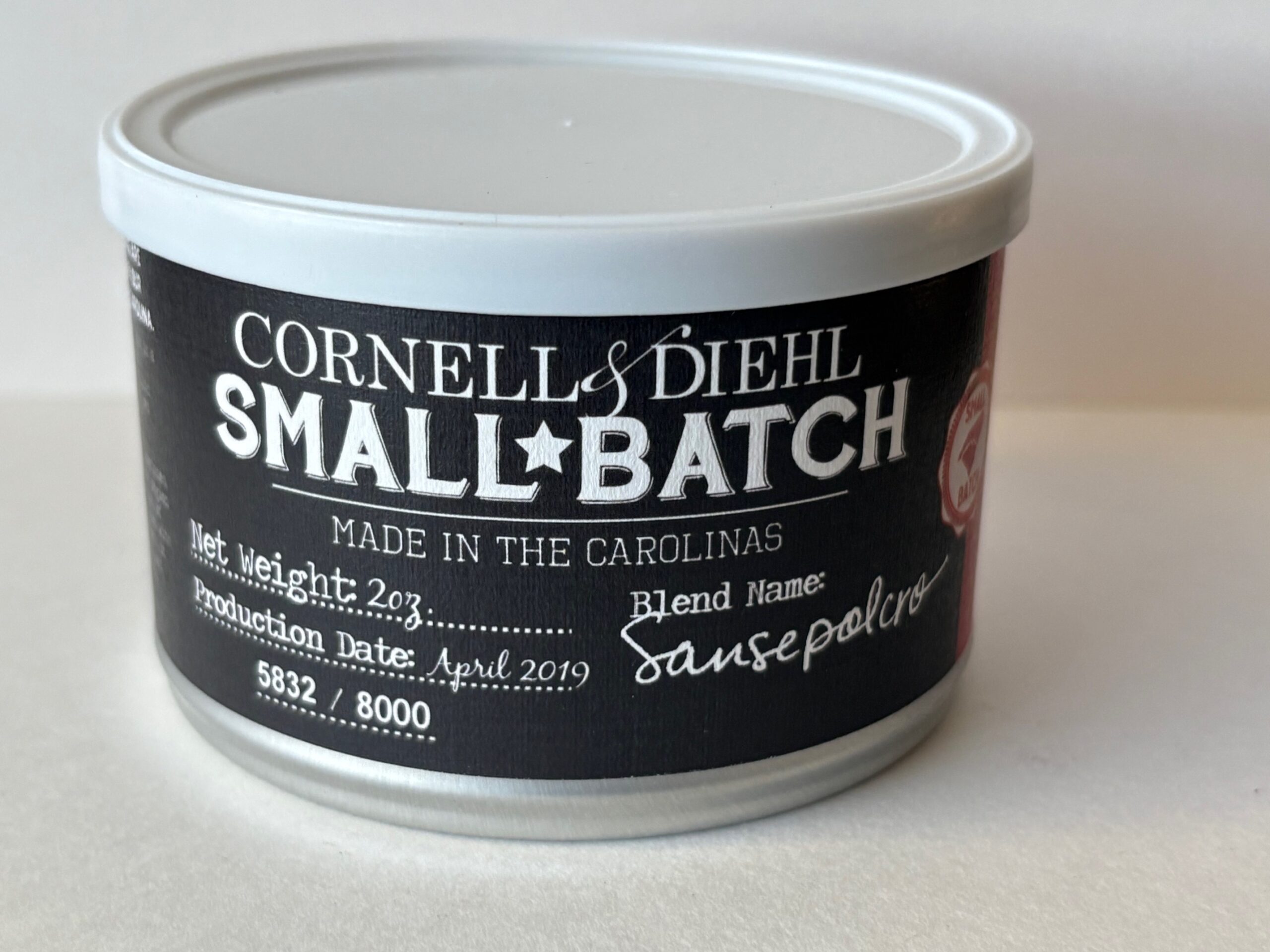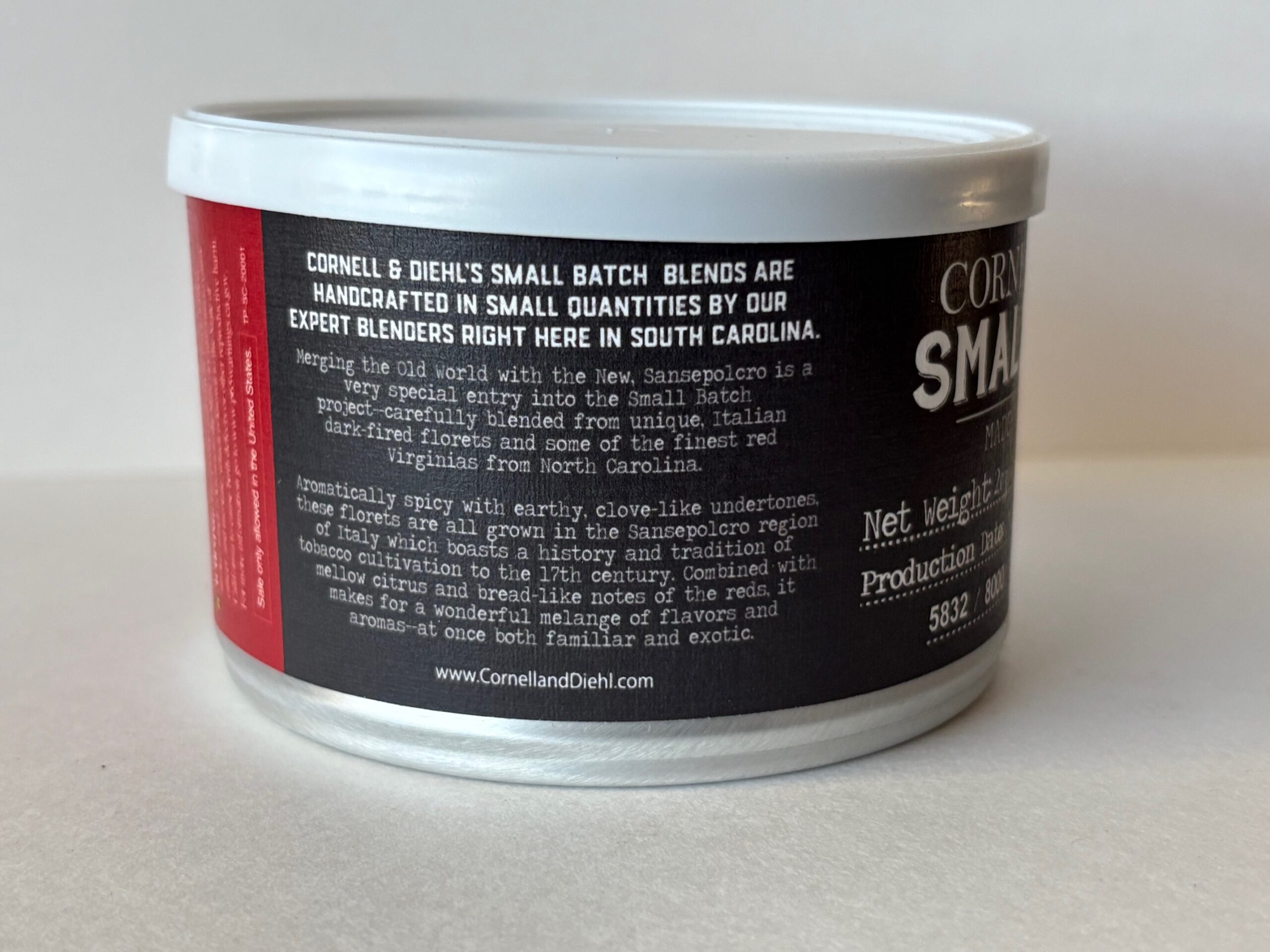 Unopened 2 ounce tin of 2019 Cornell & Diehl Small Batch Sansepolcro. Tin 5832/8000.