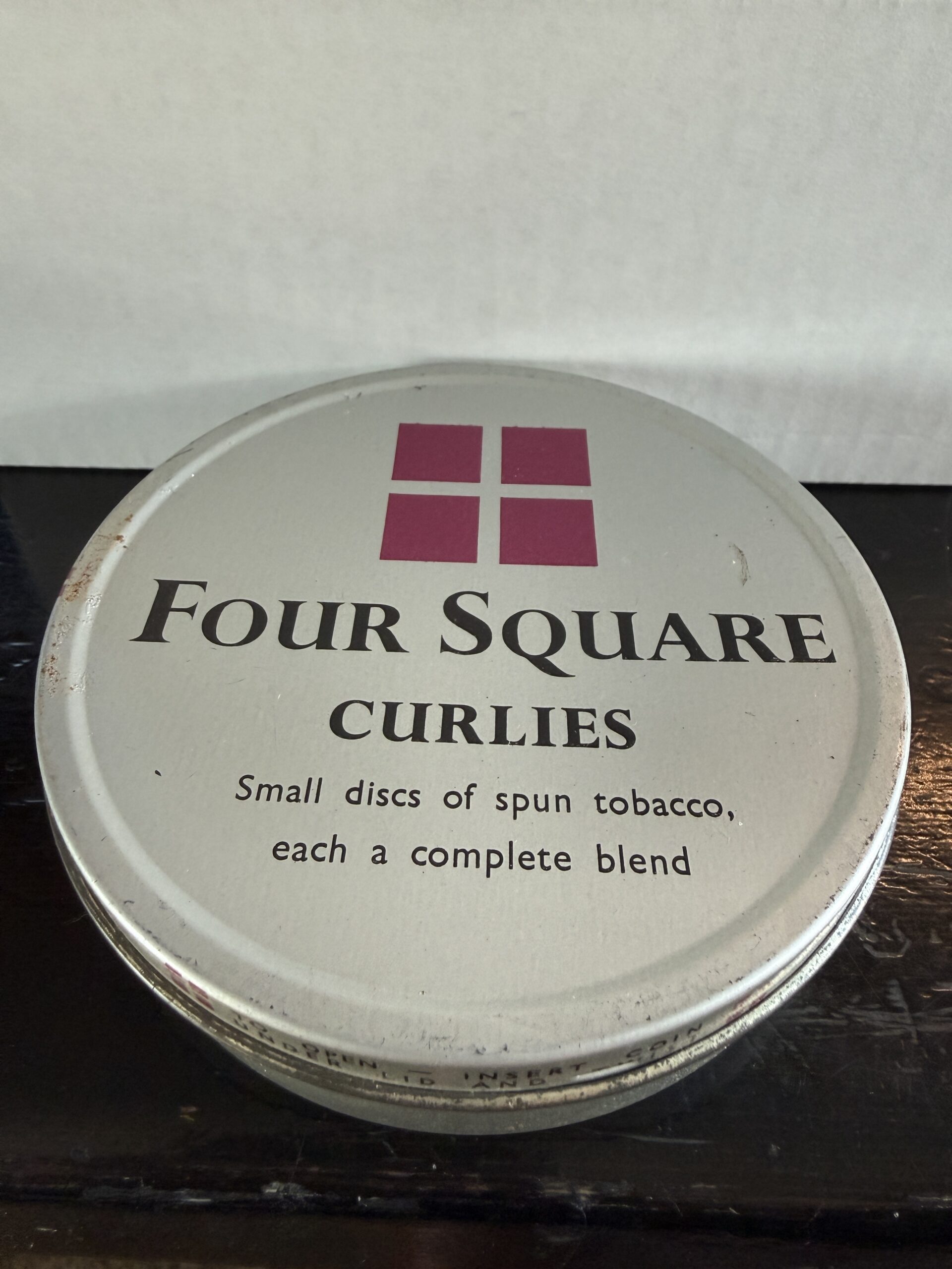 Up for auction is a 1960's era Dobie's Four Square Curlies full tin. Made in Great Britain. weight is 3.6oz on my digital scale. The tin has shelf wear. The seal is compromised, but contents are undisturbed. Will require rehydration.