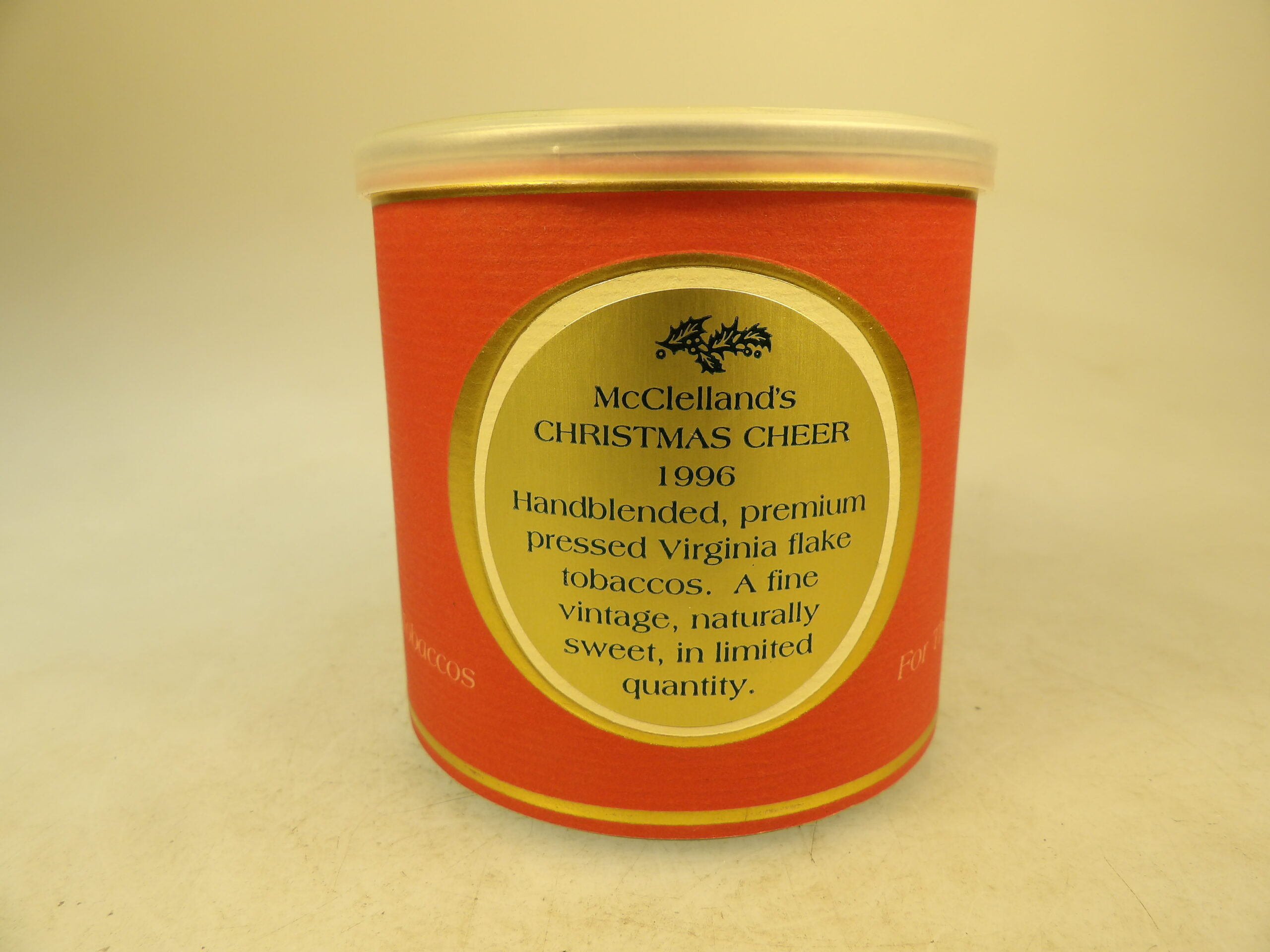 DESCRIPTION: Here is a Vintage Collectible McClelland’s Christmas Cheer 50g Sealed Pipe Tobacco Tin 1996 Edition. This is a gentile smoking blend McClelland Christmas Cheer from 1996 Pressed Virginia Broken Flake from a 1993 crop of orange flue-cured Virginia. Sealed and stored indoors. Good Luck Bidding and Thanks for Stopping by.