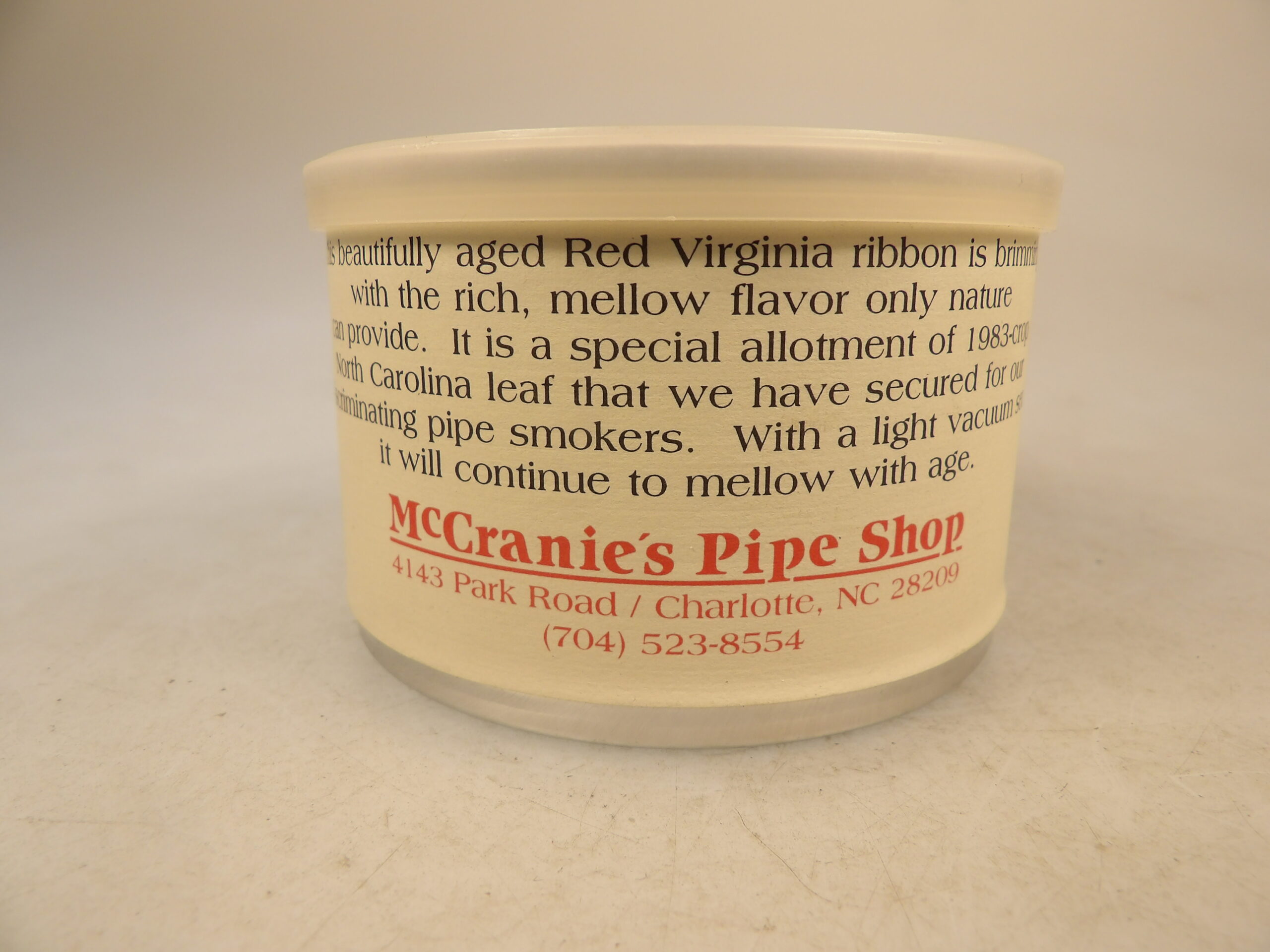 DESCRIPTION: Here is an auction for sale. It is a Vintage Collectible 26 yrs old McCranies Red Ribbon 1983 Red Virginia 50g Sealed Pipe Tobacco Tin ‘99. This tin is sealed and has never been opened. This beautifully aged red Virginia is brimming with the rich mellow flavor only nature can provide. It is a special allotment of a 1983 crop North Carolina leaf that we have secured for our discriminating pipe smokers. Available in flake or fully rubbed. Good Luck Bidding and Thanks for Stopping by.