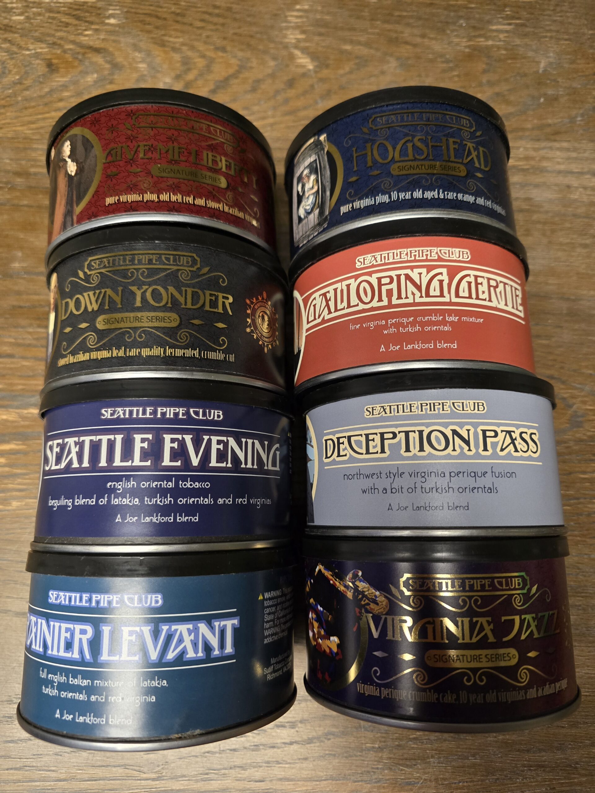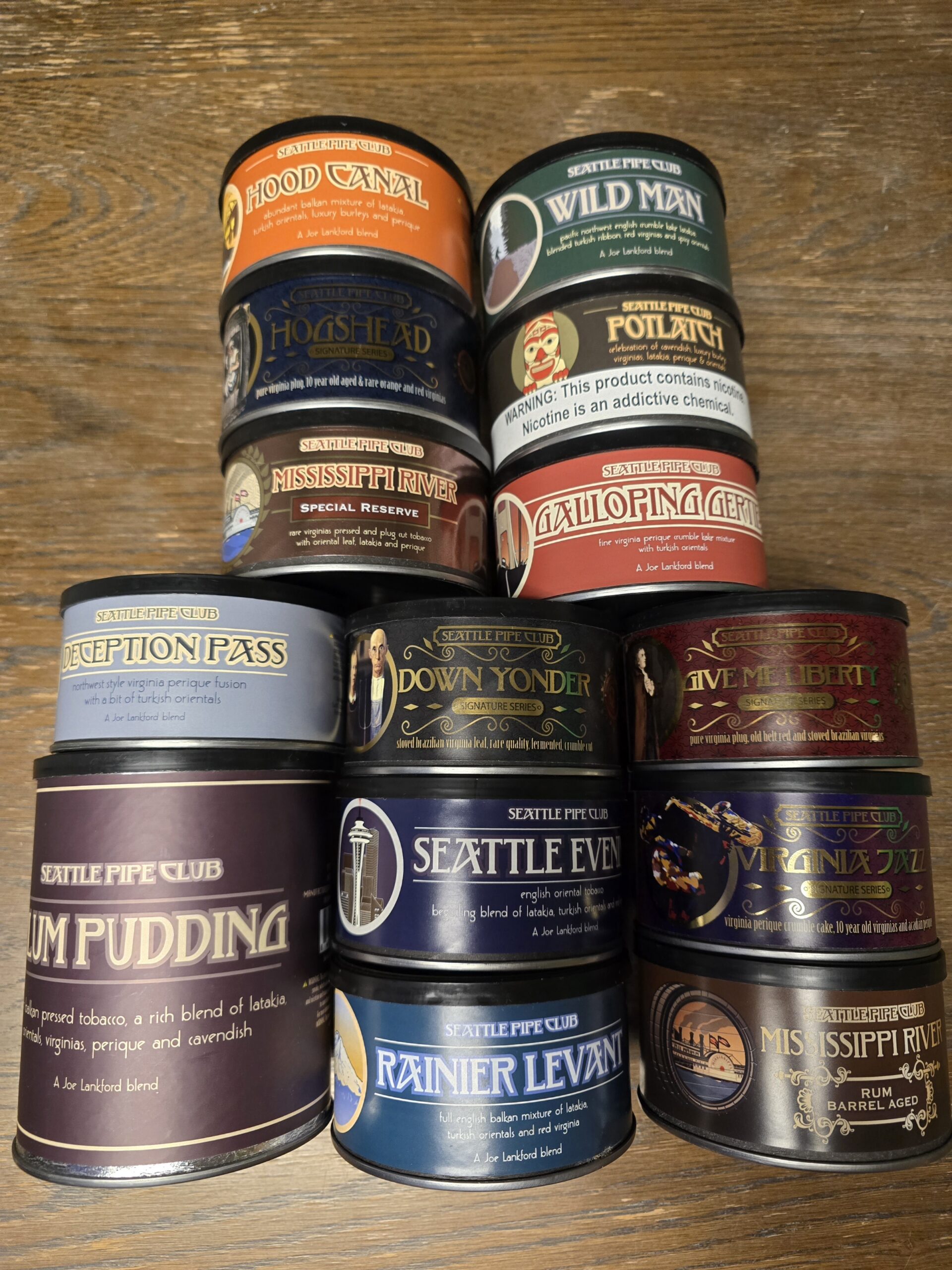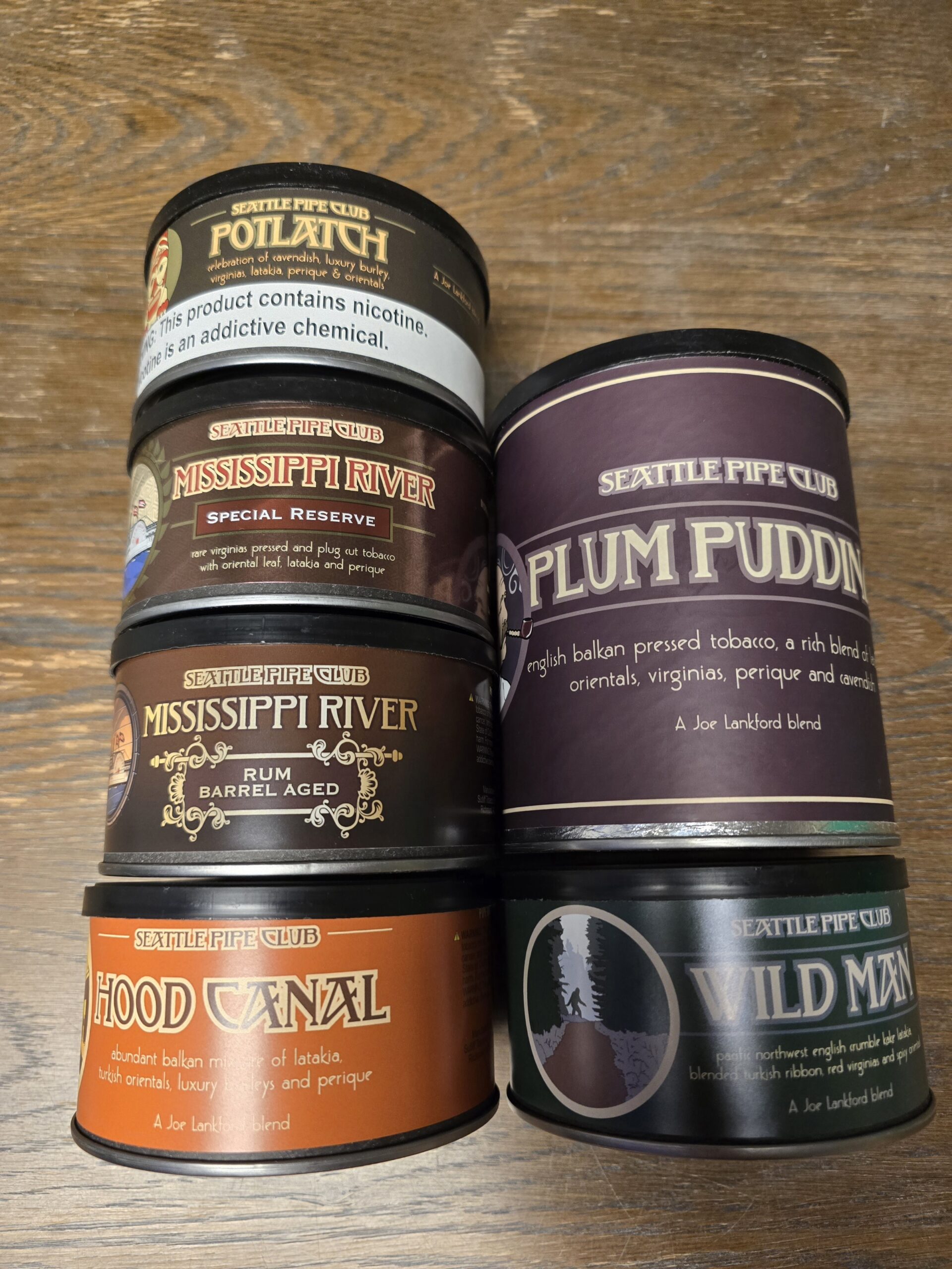 Hood Canal (2 ounce 2024), Hogshead (4 ounce 2024), Mississippi River Special Reserve (4 ounce no date but purchased in 2024), Wildman (2 ounce 2024), Potlatch (2 ounce no date but purchased at end of 2024/early 2025), Galloping Gertie (2 ounce 2024), Deception Pass (2 ounce 2024), Plum Pudding (8 ounce 2024), Down Yonder (2 ounce 2023), Seattle Evening (2 ounce 2023), Rainier Levant (2 ounce 2023), Give Me Liberty (4 ounce 2022), Virginia Jazz (2 ounce 2024), Mississippi River Barrel Aged (2 ounce 2024)