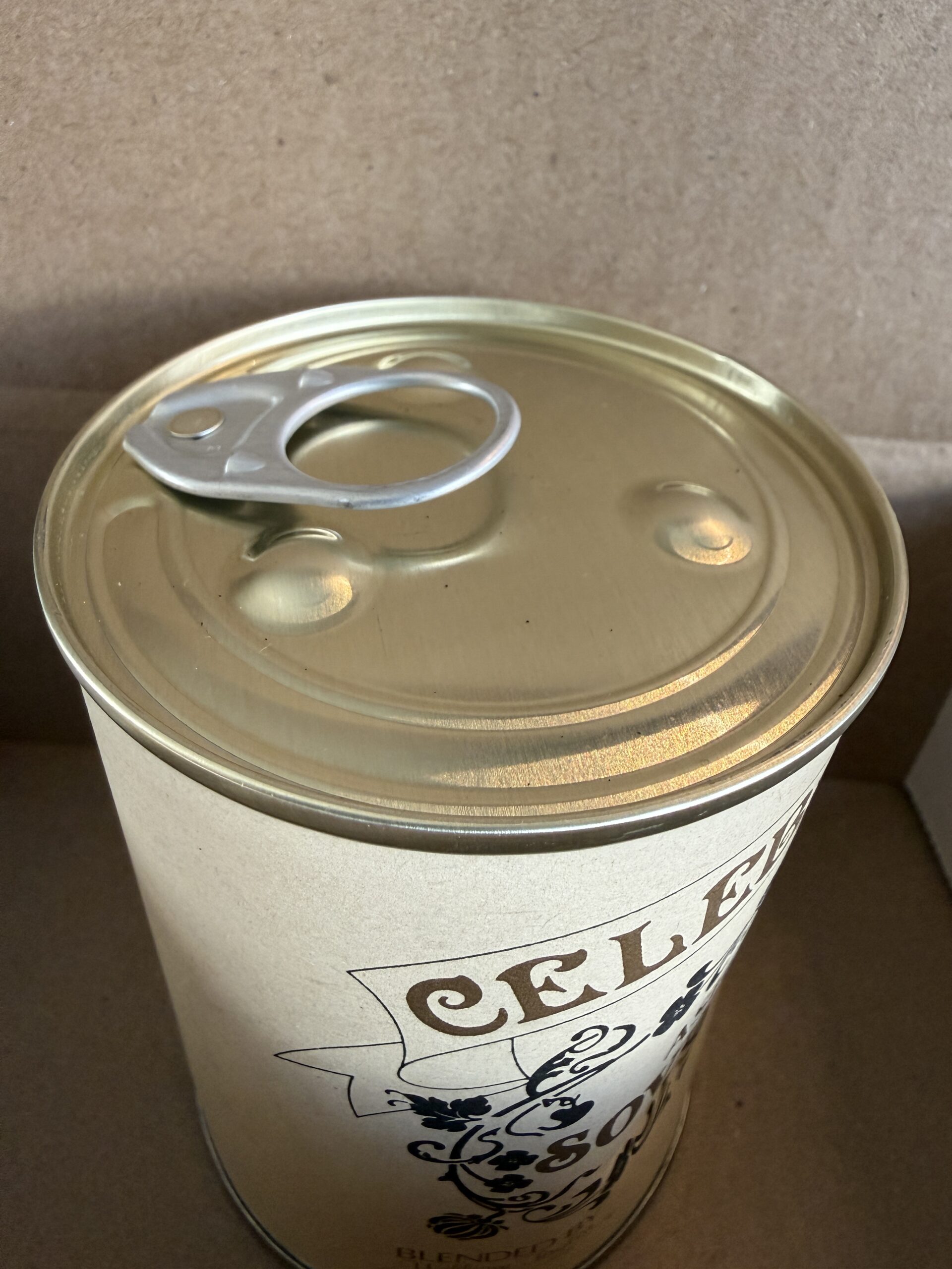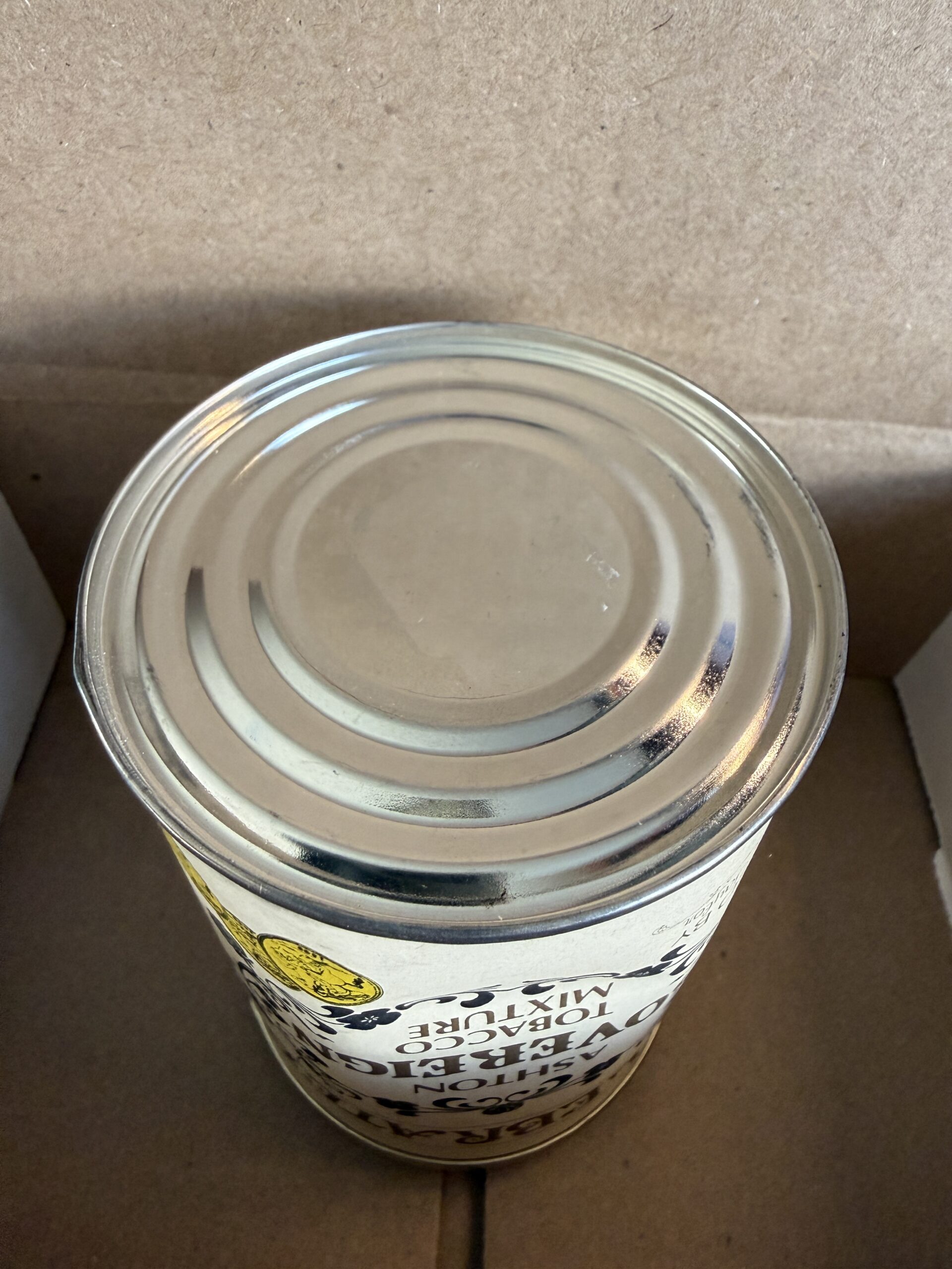 Tin is in excellent condition, no rust spots, contents are quiet, no rattling, seal is intact. Tin is puffed out. one small dent.
