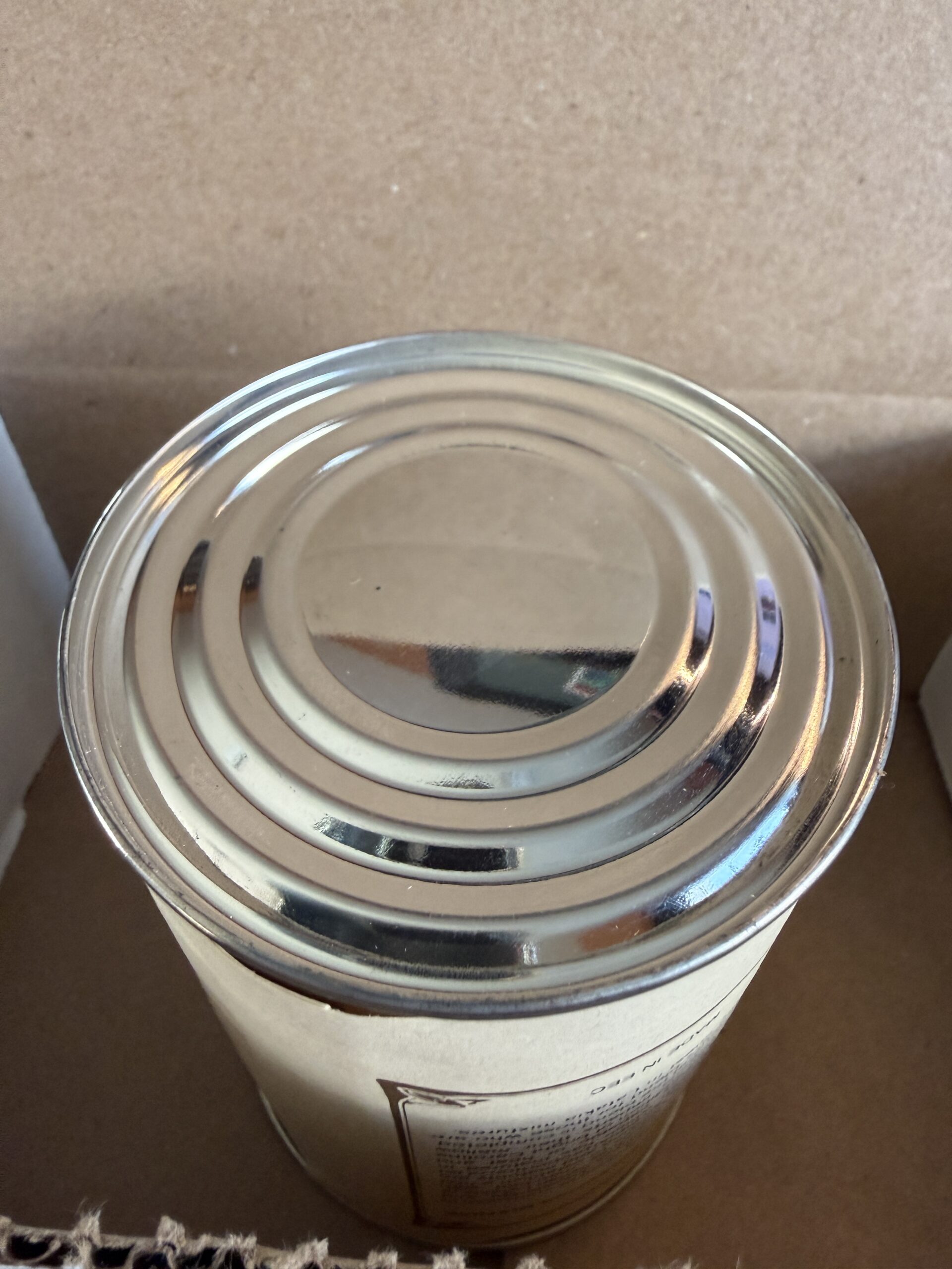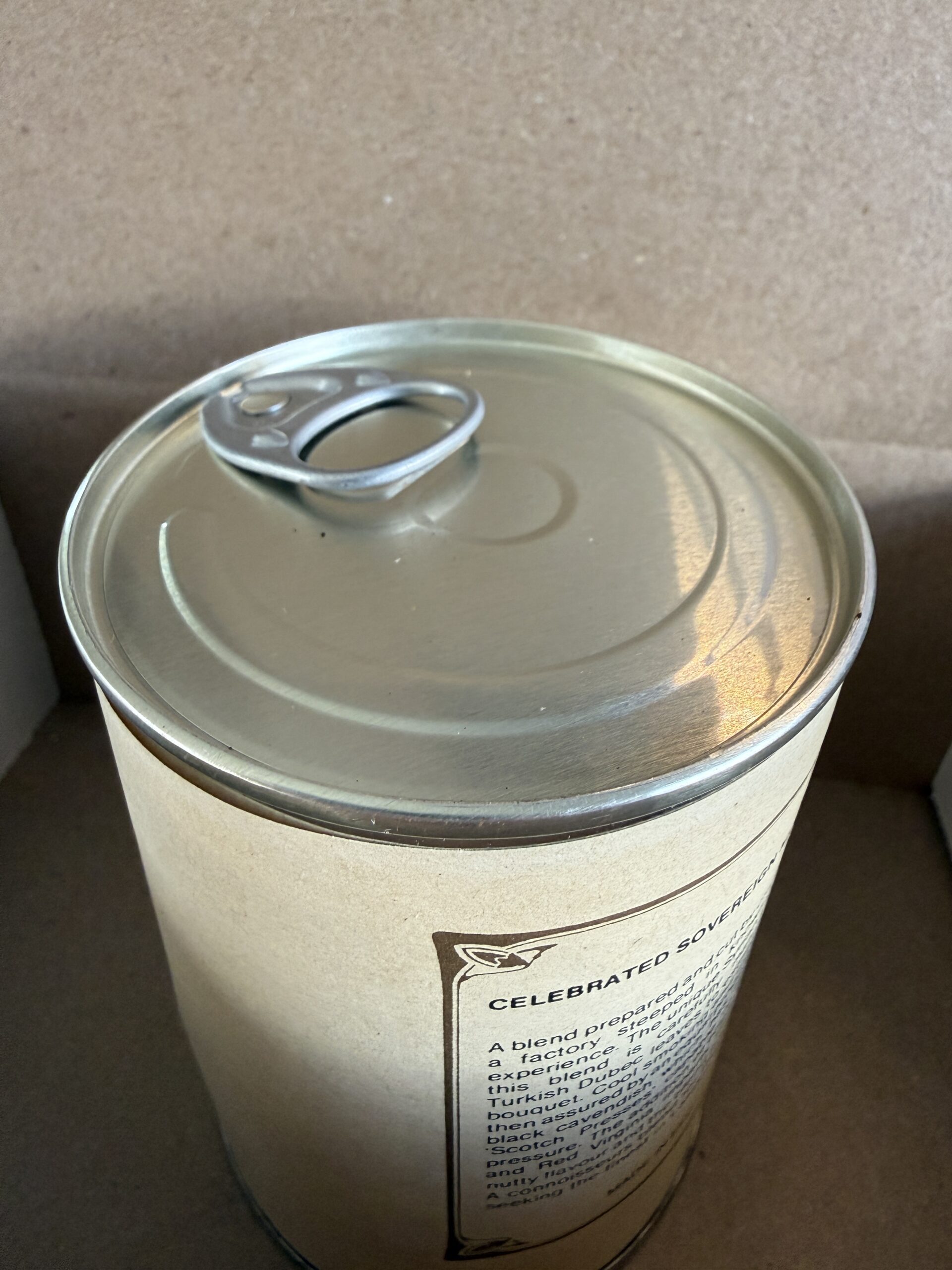 Tin is in excellent condition, no rust spots, contents are quiet, no rattling, seal is intact. Tin is puffed out. Small dent.