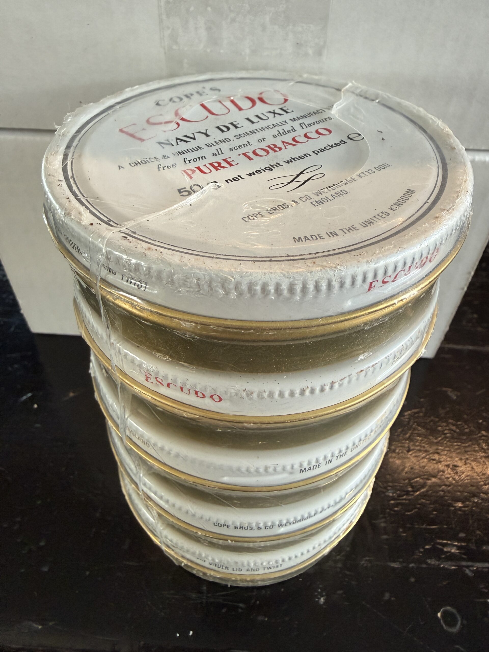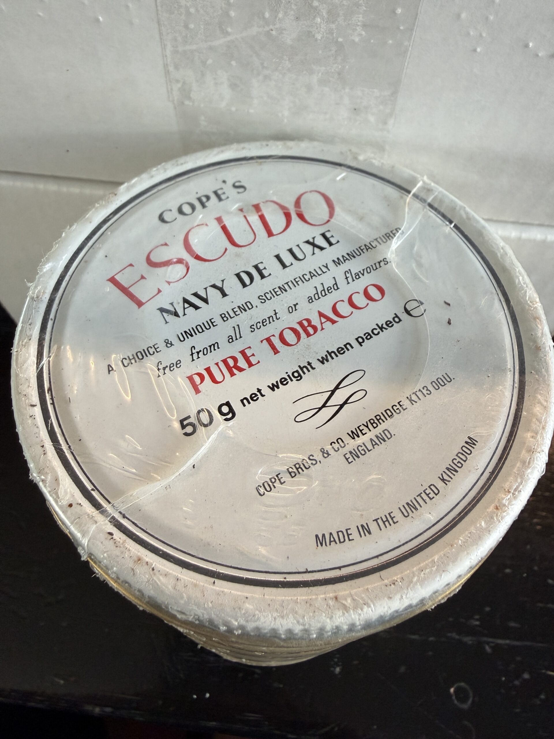 Up for auction is a 5-tin sleeve of Cope's Escudo. Made in the United Kingdom. Undisturbed shrink wrap. Seals may be compromised. May require rehydration. Nice opportunity, here.