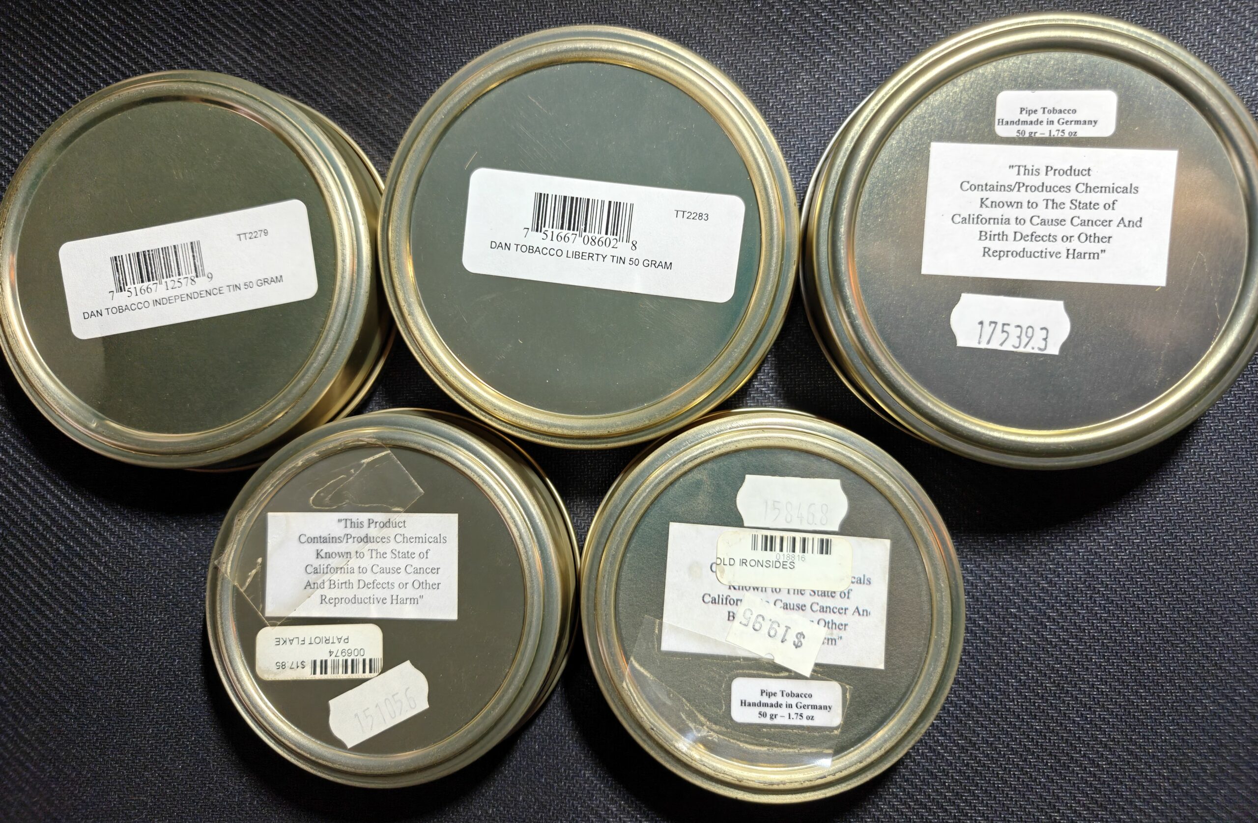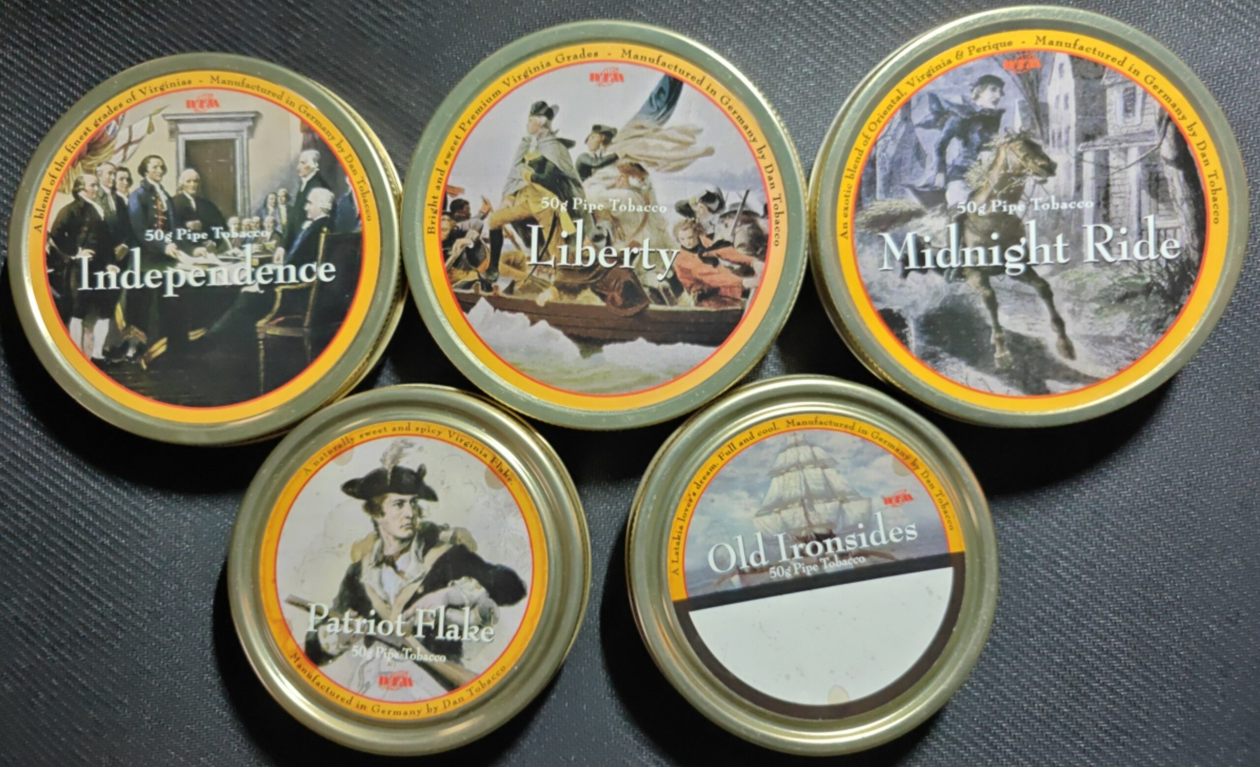5 tin set Dan Tobacco Revolutionary War series includes Ol Ironsides (2015), Patriot Flake (2015), Midnight Ride (2017), Independence (2017), Liberty (2017). All tins are 50g, and unopened.