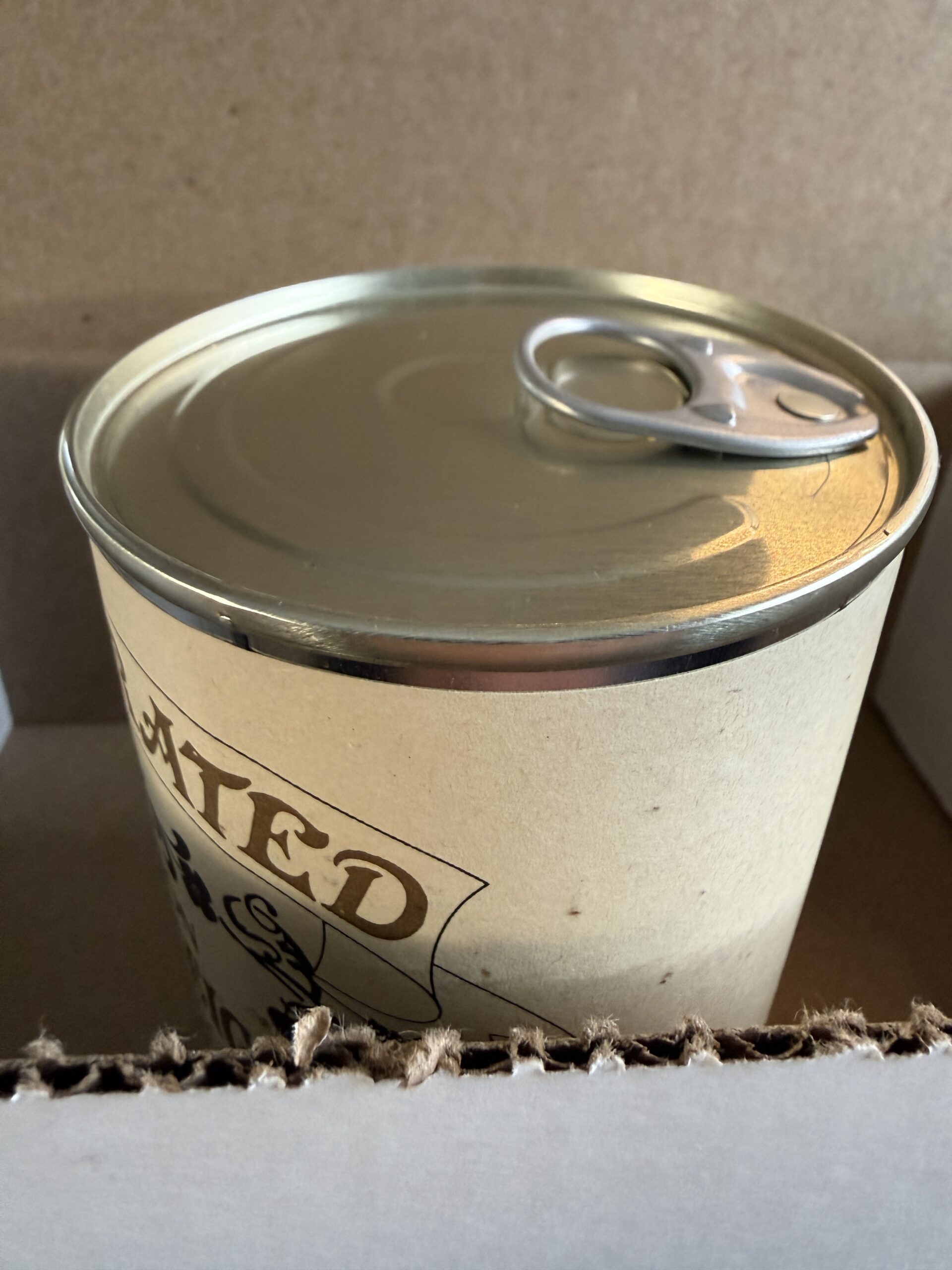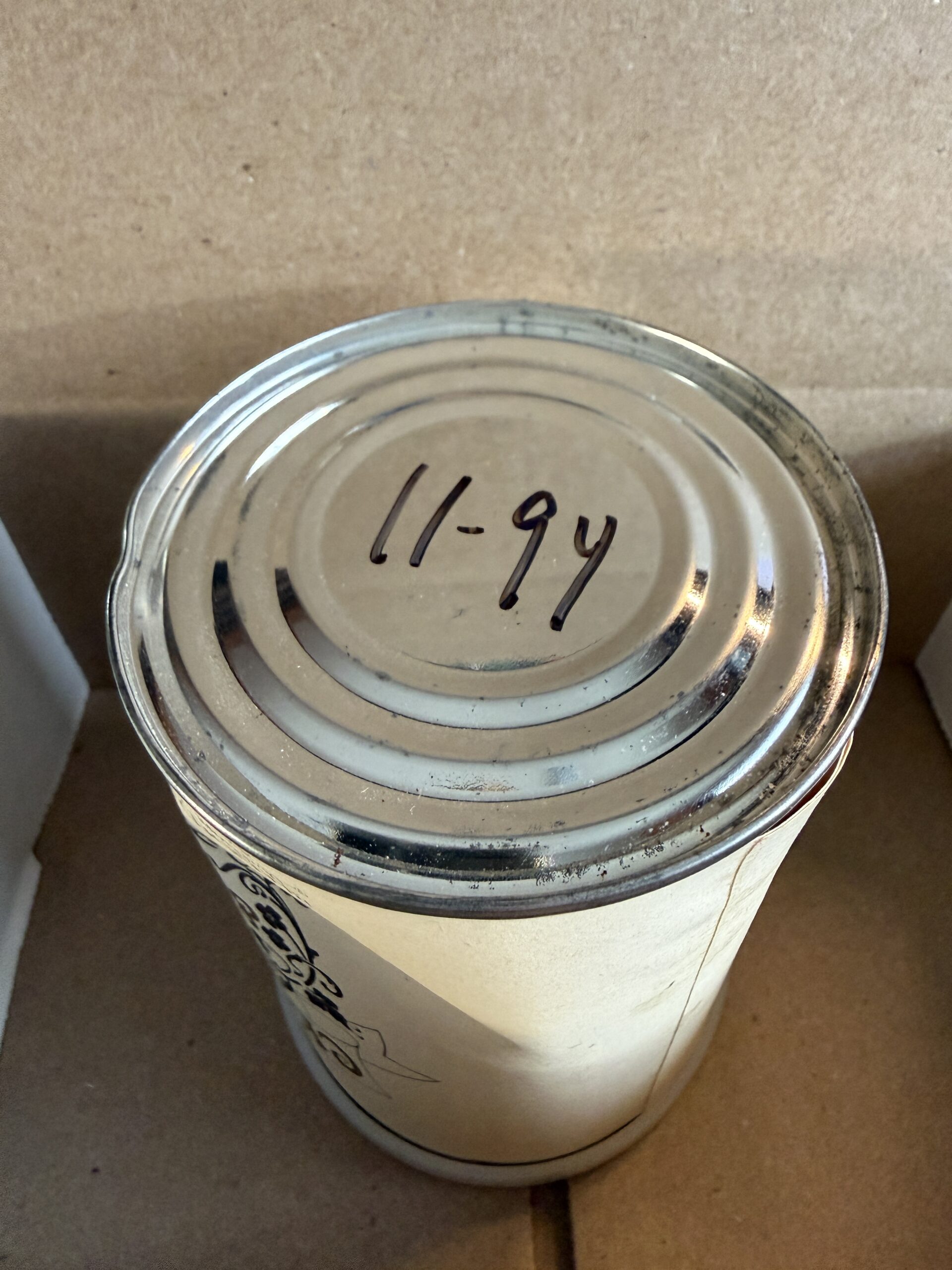 Tin is in excellent condition, no rust spots, contents are quiet, no rattling, seal is intact. Tin is puffed out. Small dents.
