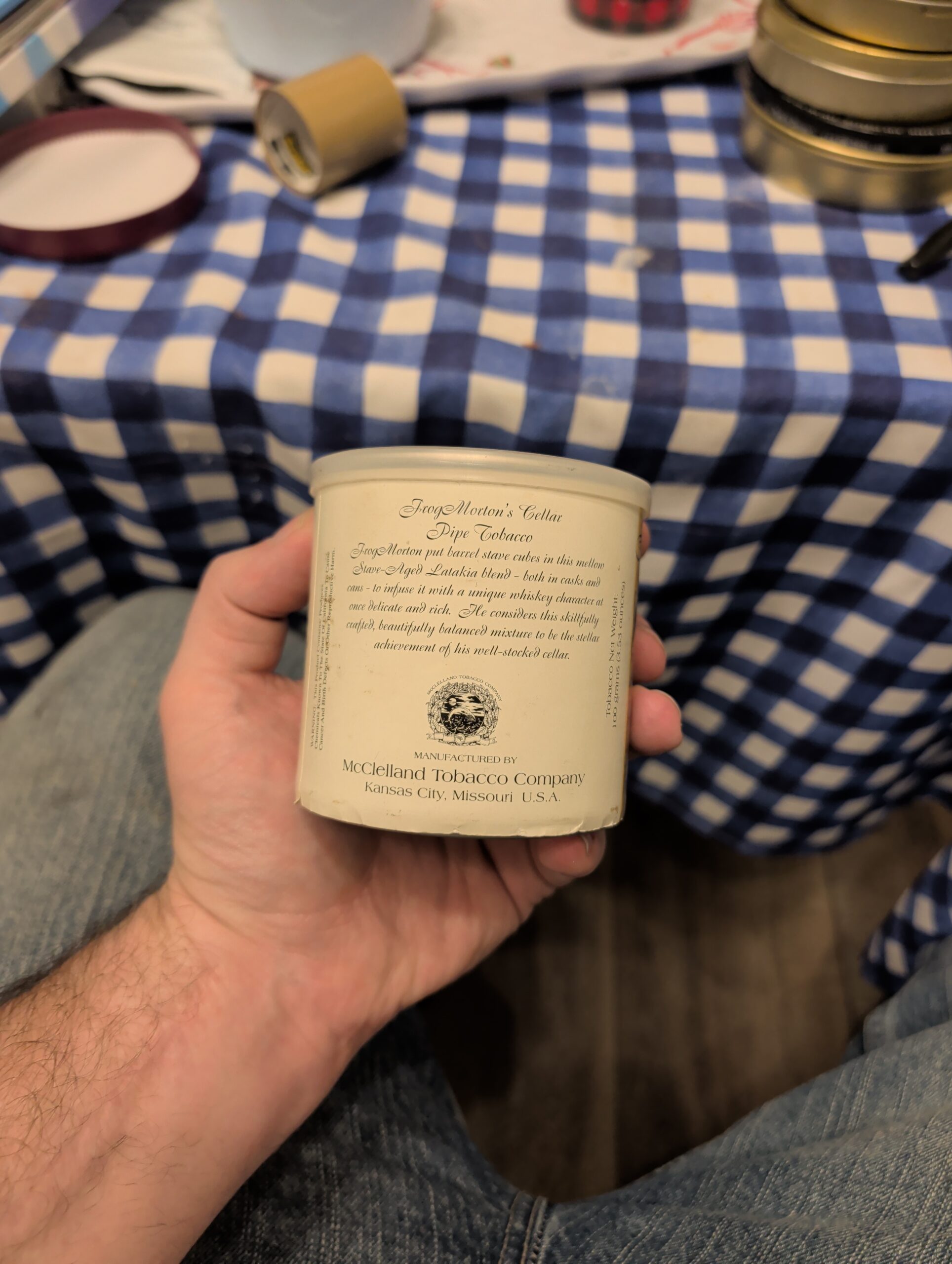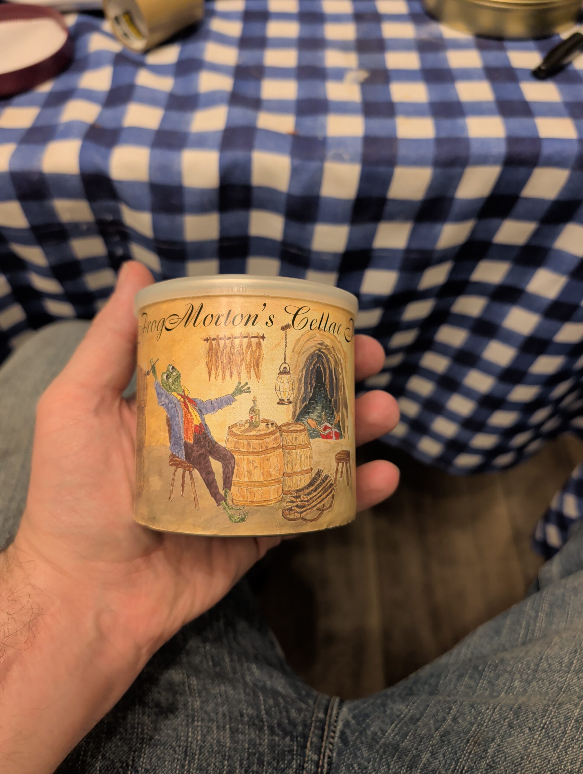 Frog Mortons Cellar 100 gram Tin. Tin code 472018. Was bought from JR Tobacco where it had been stored in a walk in humidor for many years. Label completely loose. I pulled it down as much as I'm willing to dare in the picture.
