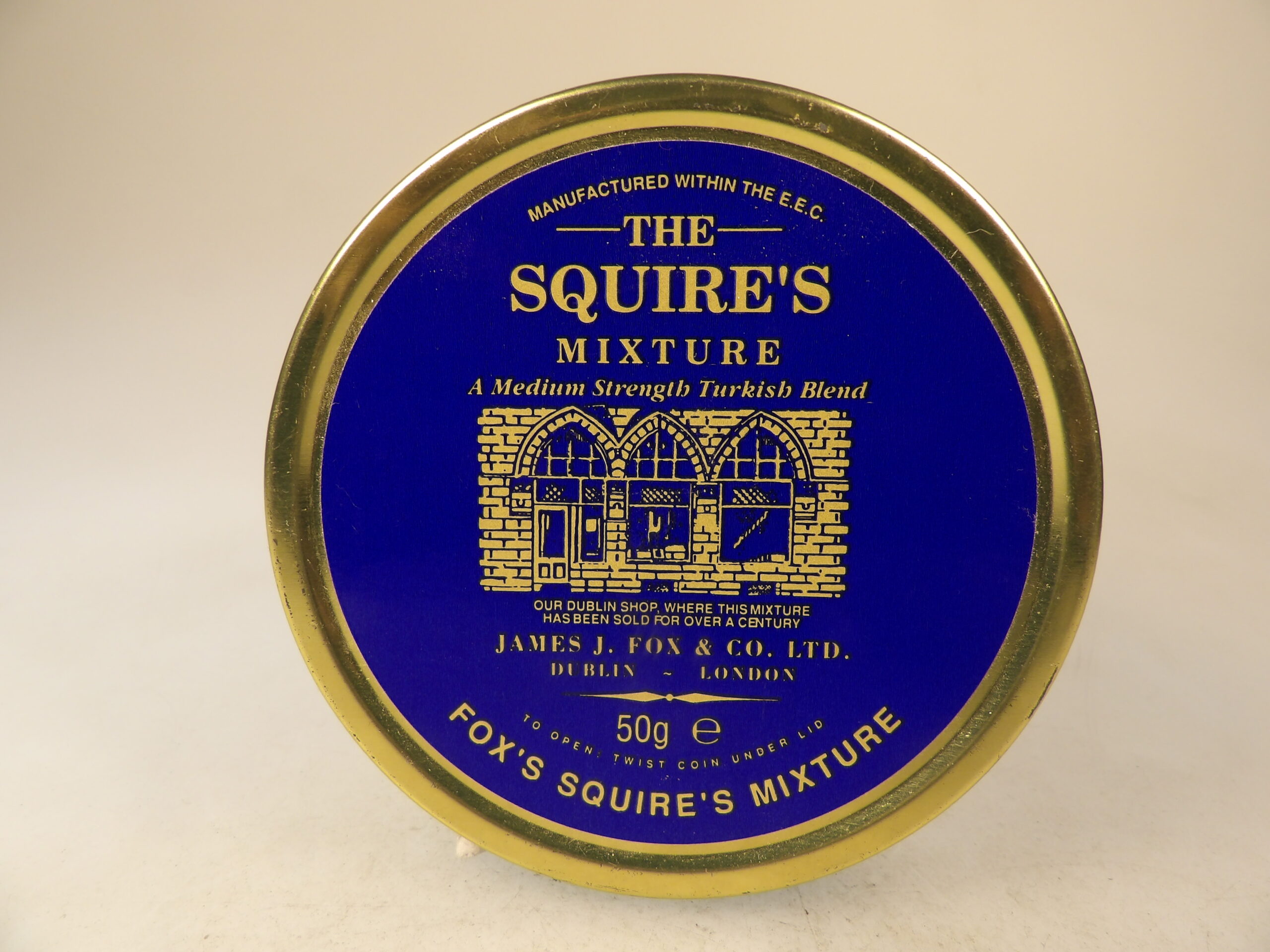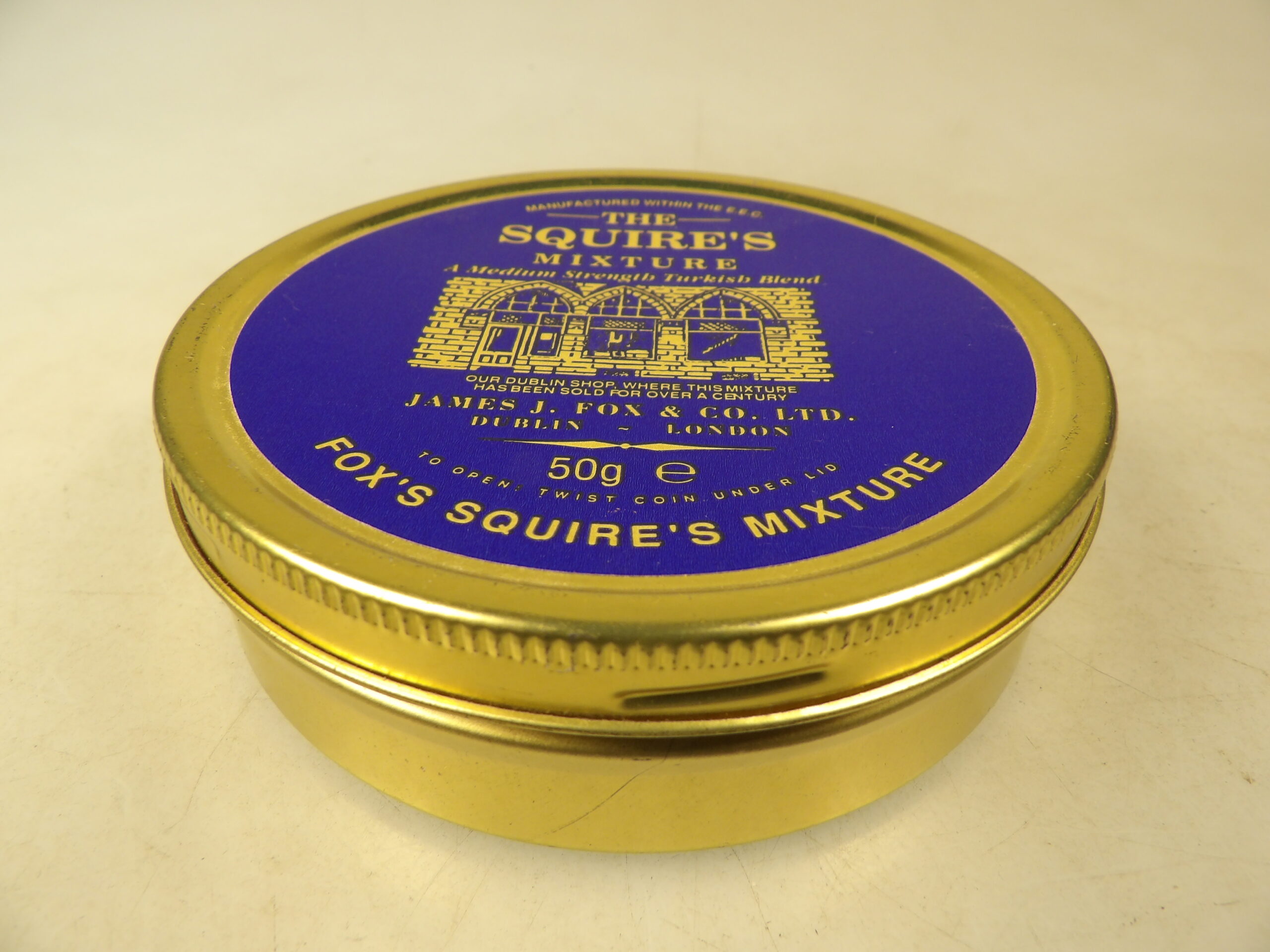 DESCRIPTION: Here is an auction sale. It is an old highly 40 Years + Aged Collectible James A. Fox “The Squires Mixture” 1.75 oz’s Sealed Pipe Tobacco Tin ’99. For over a century blenders have added the aroma and flavor of Turkish and latakia tobaccos to Virginian and cavendish leaf, giving this blend its distinction. Good Luck Bidding and Thanks for stopping by.