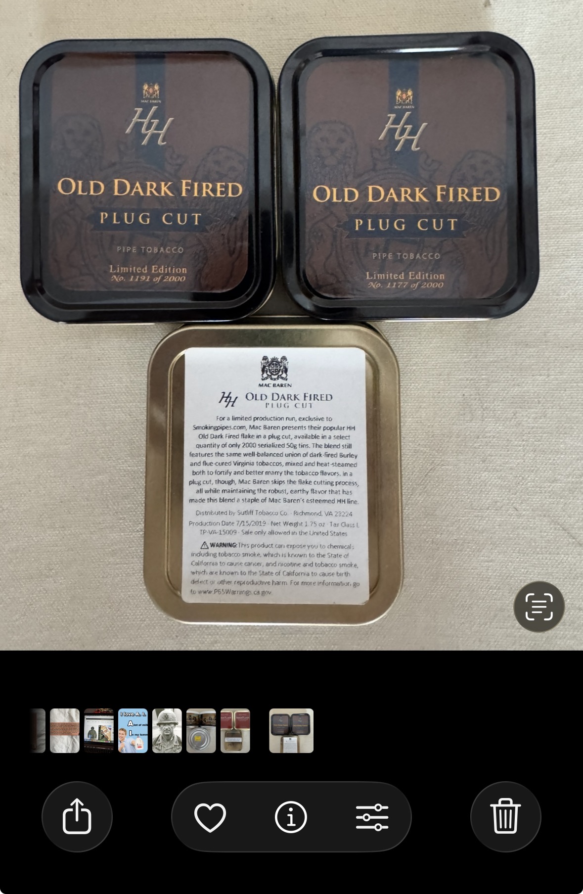 Three tins of now discontinued H & H Old Dark Fired Cut Plug. They have been stored in a cooler since 2019. Wonderful tobacco!!!