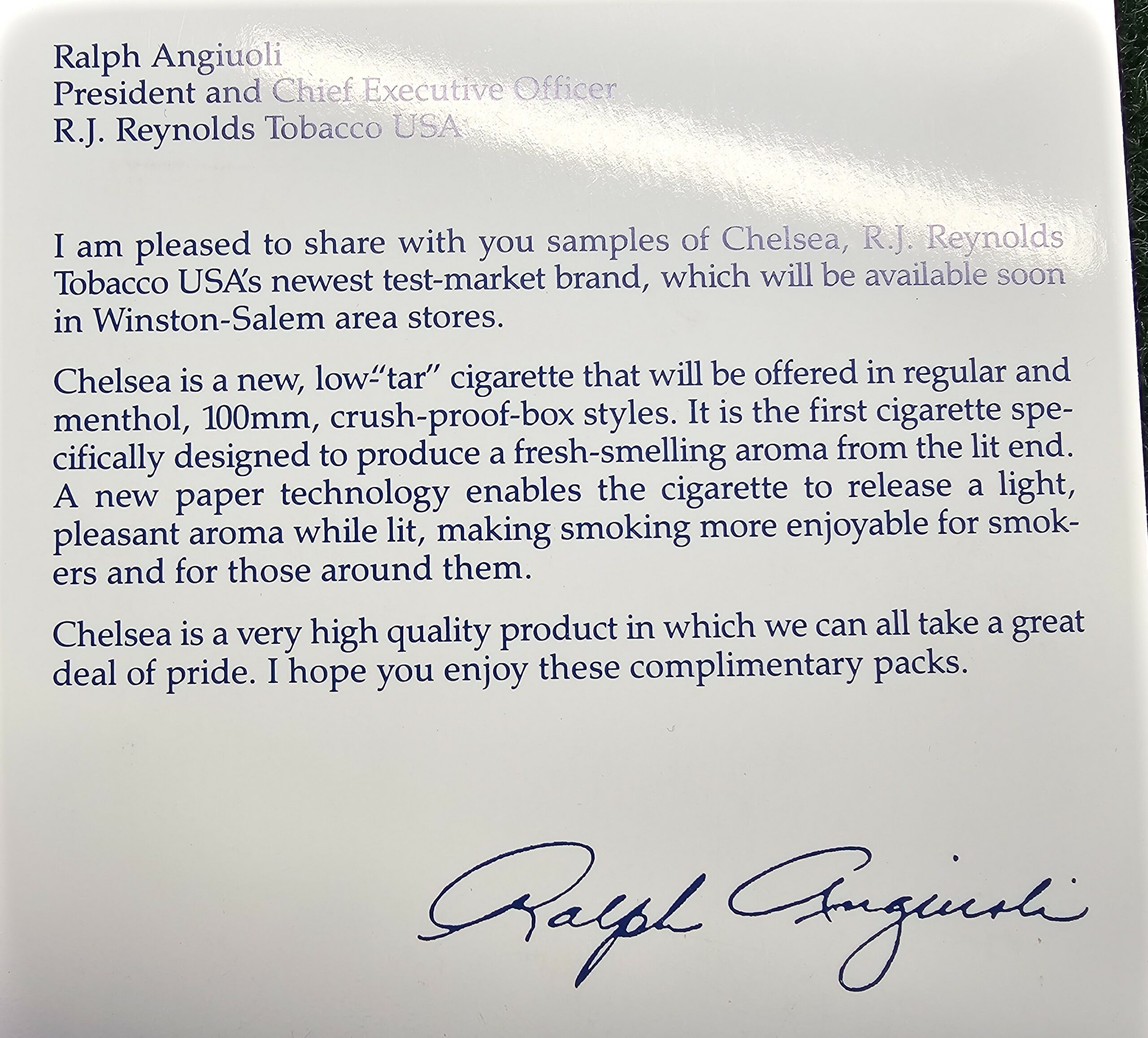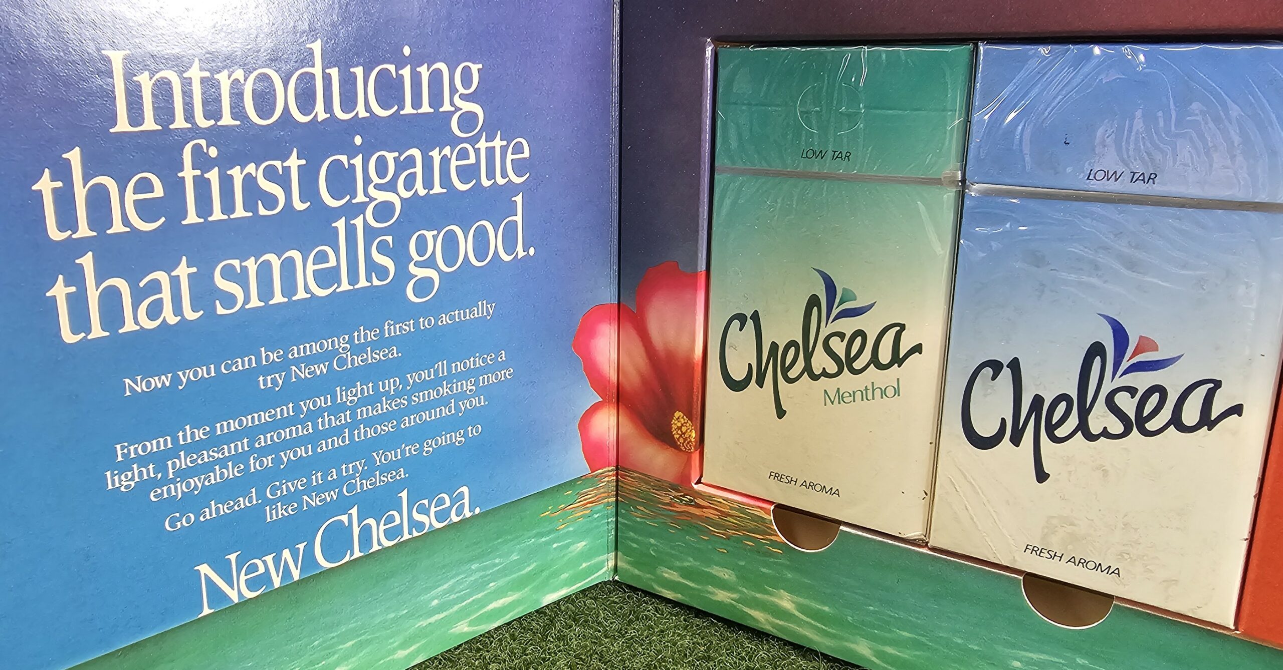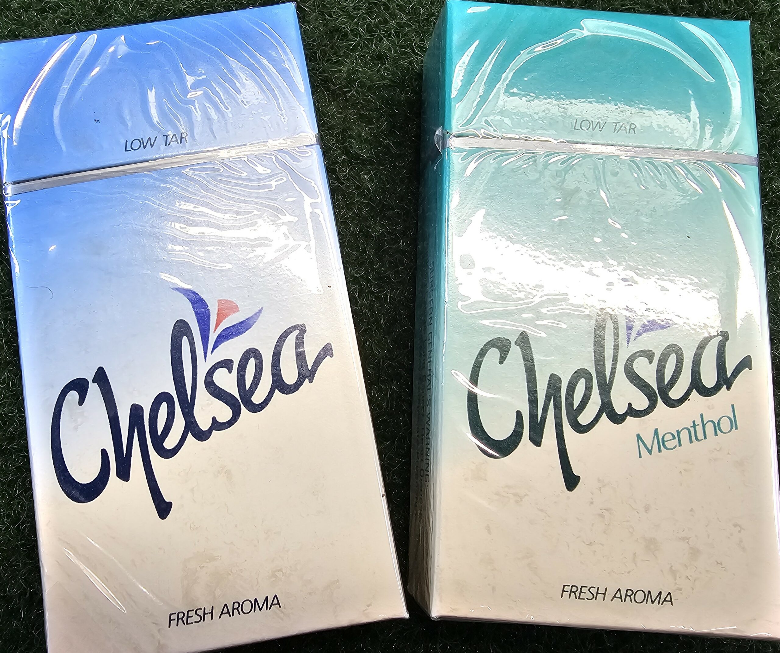 This is a promotion pack from the early 90s for Chelsea cigarettes, a cigarette that was advertised as giving off a pleasant aroma from the lit end. Includes the promotional package along with two sealed packs.