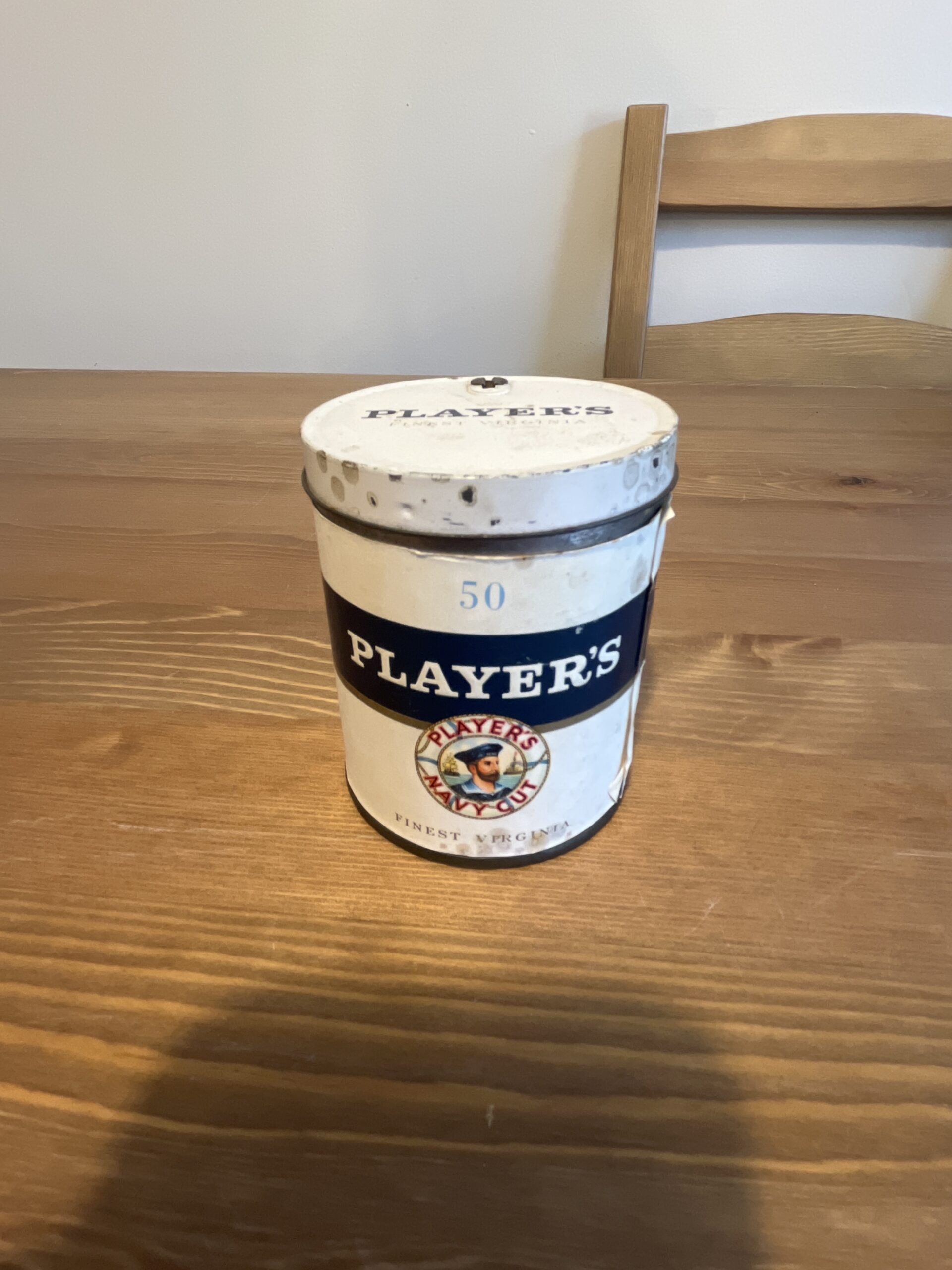 Player navy cut finest Virginia’s round 50 cutter top cigarettes. Tin is likely from the 60’s-70’s and has some good pressure to it so tin should be in good standing ready to smoke.