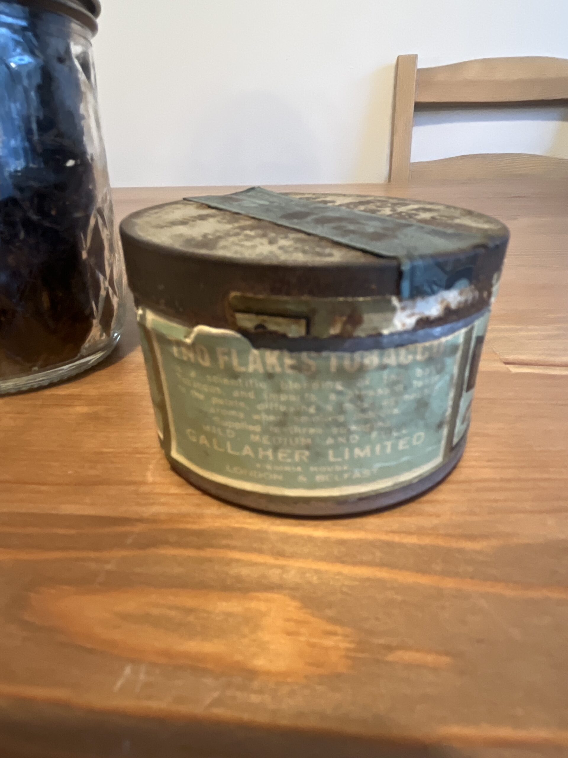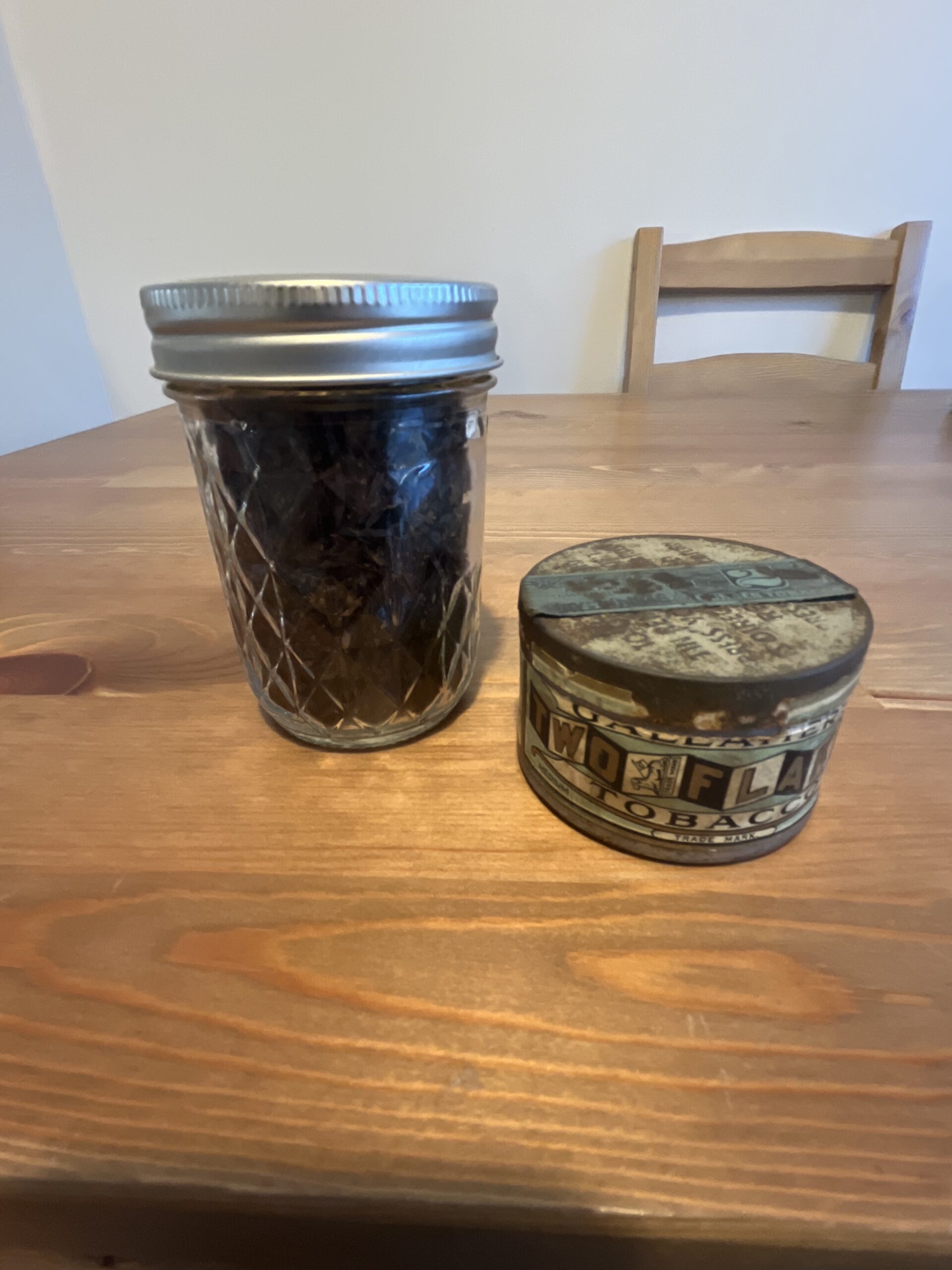 2 ounces of gallahers two flake tobacco. I opened the puffing tin a few months ago and the tobacco was great but not my style which is why I’m selling. Amazing fruity very fermented tobacco I immediately put the tobacco in a mason jar to preserve it. Series number 116 which makes this tobacco from 1946.