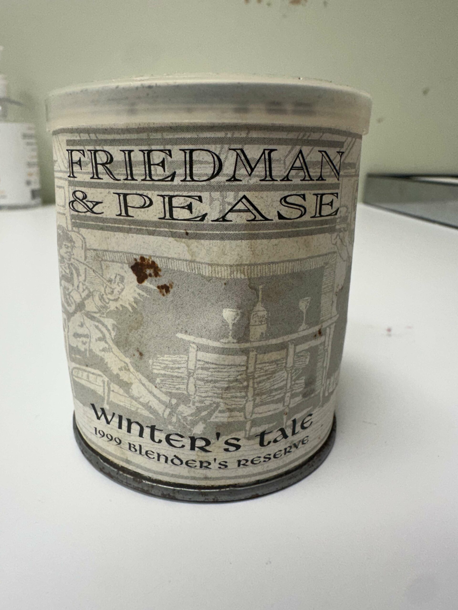 Here is a dented- but intact -50g tin of Winter's tale, the 1999 holiday limited release by a true blending master, Gregory Pease. this was the final and limited release of the short lived (but beloved) collaboration between Greg Pease and Irwin Friedman about a year and a half before Greg started his better known GLPease tobacco brand. This was one of the blends that put Greg Pease on most people's radar as a master blender and the first time a tin of this has been available on tinbids (at least according to my searching)