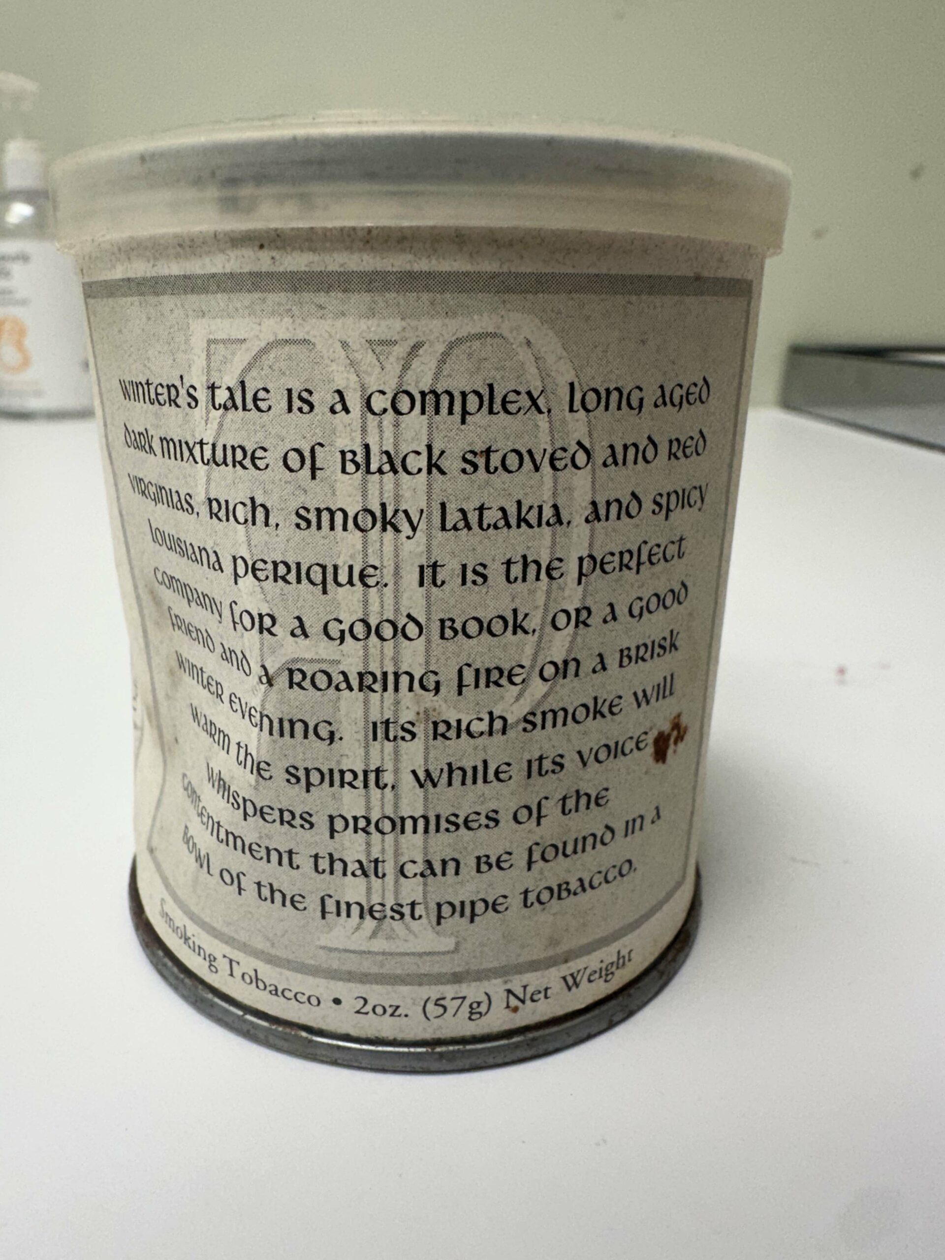the highly praised Winter's Tale is a special English style blend with a mix of black stoved and red Virginias with some smoky latakia and a touch of spicy perique - the result is magnificently complex with a rich and comforting depth - I can only imagine how 25+ years of age has improved this unique and hard to find limited release blend.
