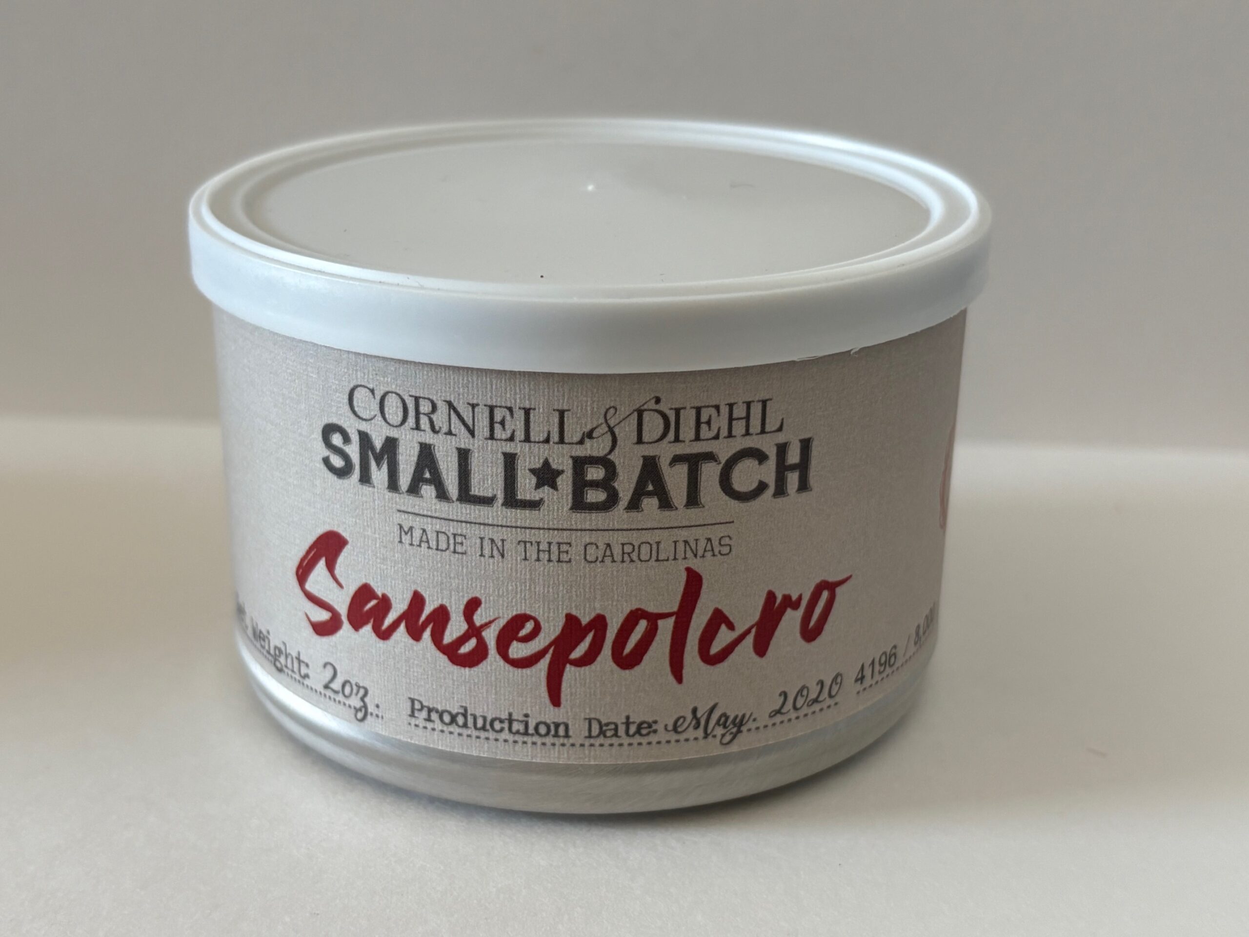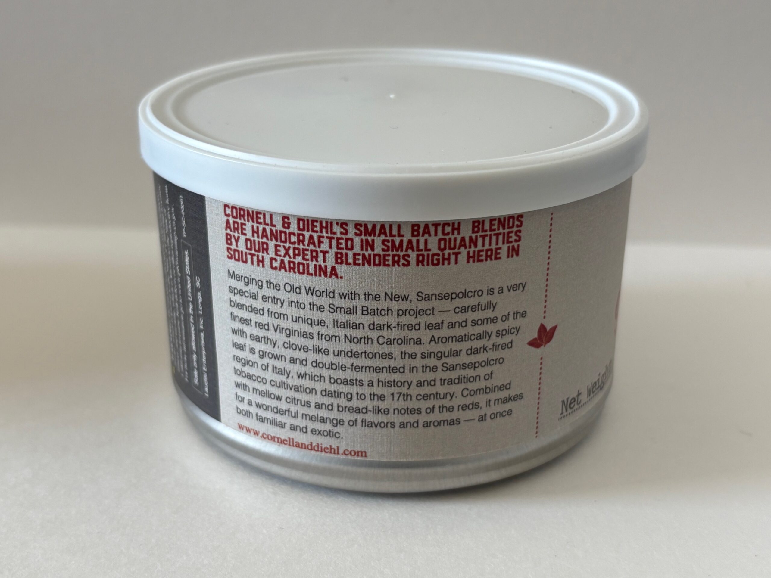 Unopened 2 ounce tin of 2020 Cornell & Diehl Small Batch Sansepolcro. Tin 4196/8000.