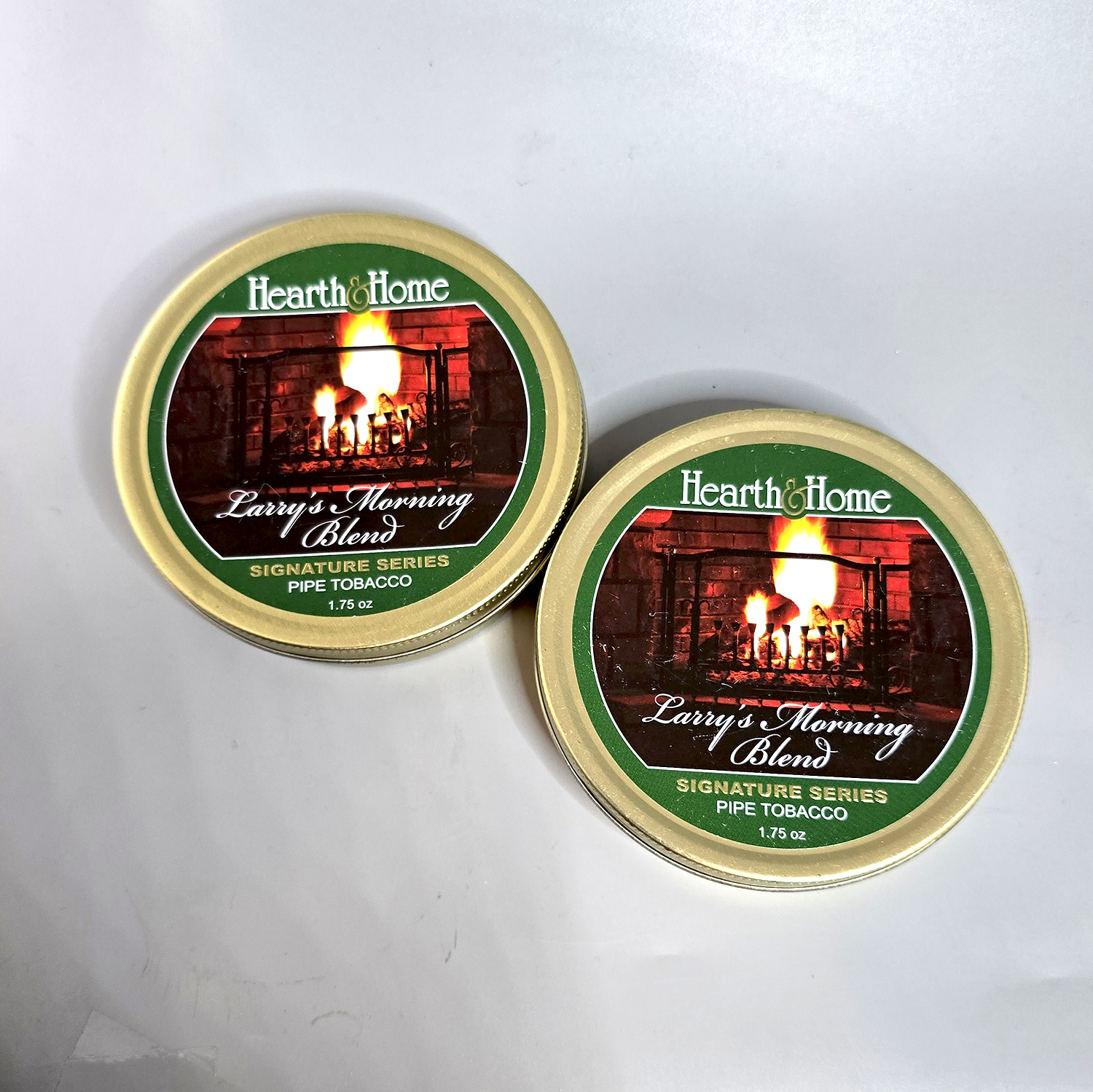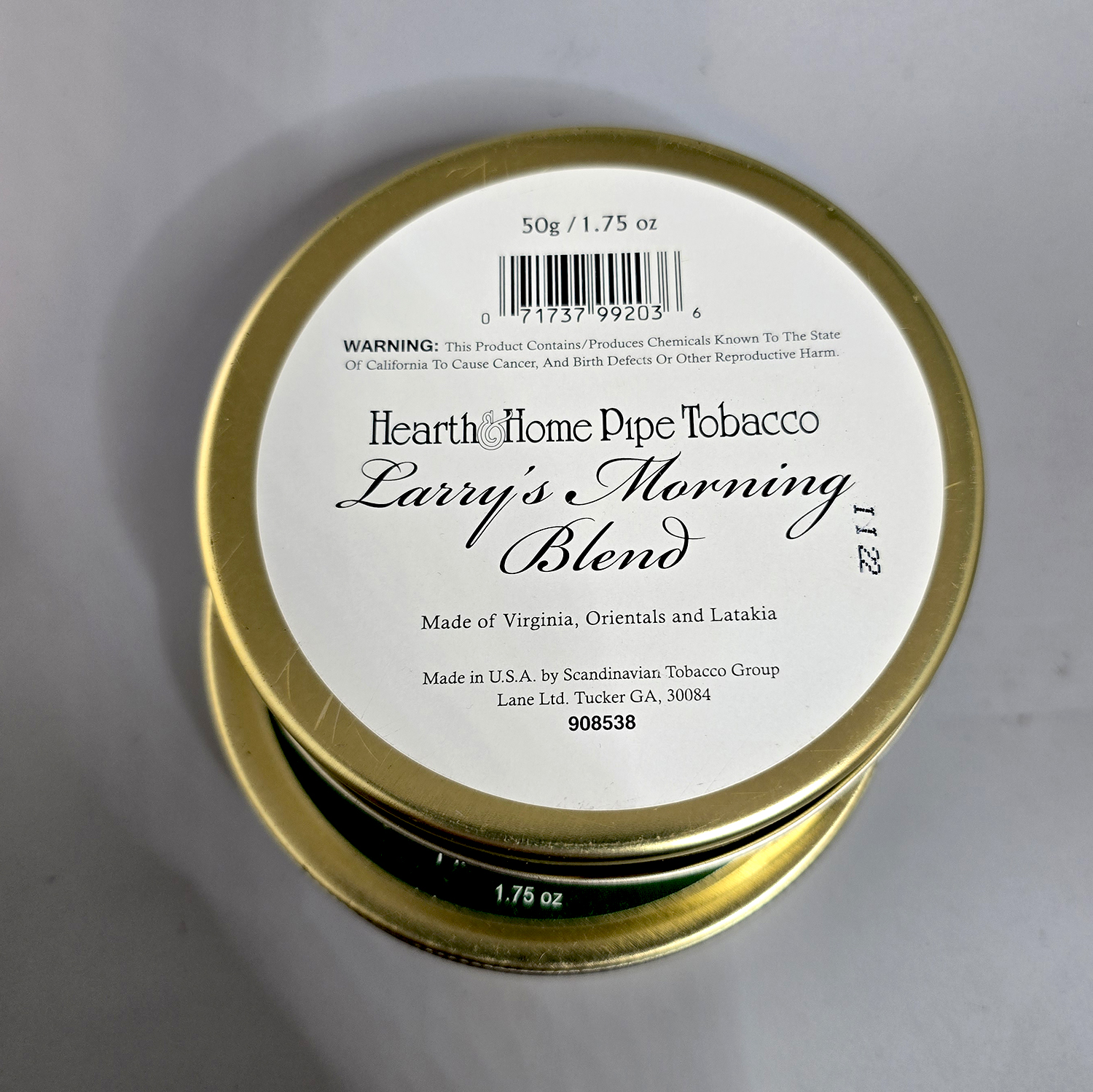 Larry's Morning blend a very rich, Latakia-laden pipe tobacco. If you love your blend with lots of smoky leaf, you now have a little more subtle choice - Hearth & Home Signature Larry's Morning Blend. The name might indicate that this is low in Latakia, but that's not the case. There's still lots of Cyprian leaf here, but the Virginias are brighter, along with the Orientals, so the flavor is a touch softer, but it's still bold and robust. It has been discontinued. These tins are likely 6+ years old with no smoking warning signs on the tins.