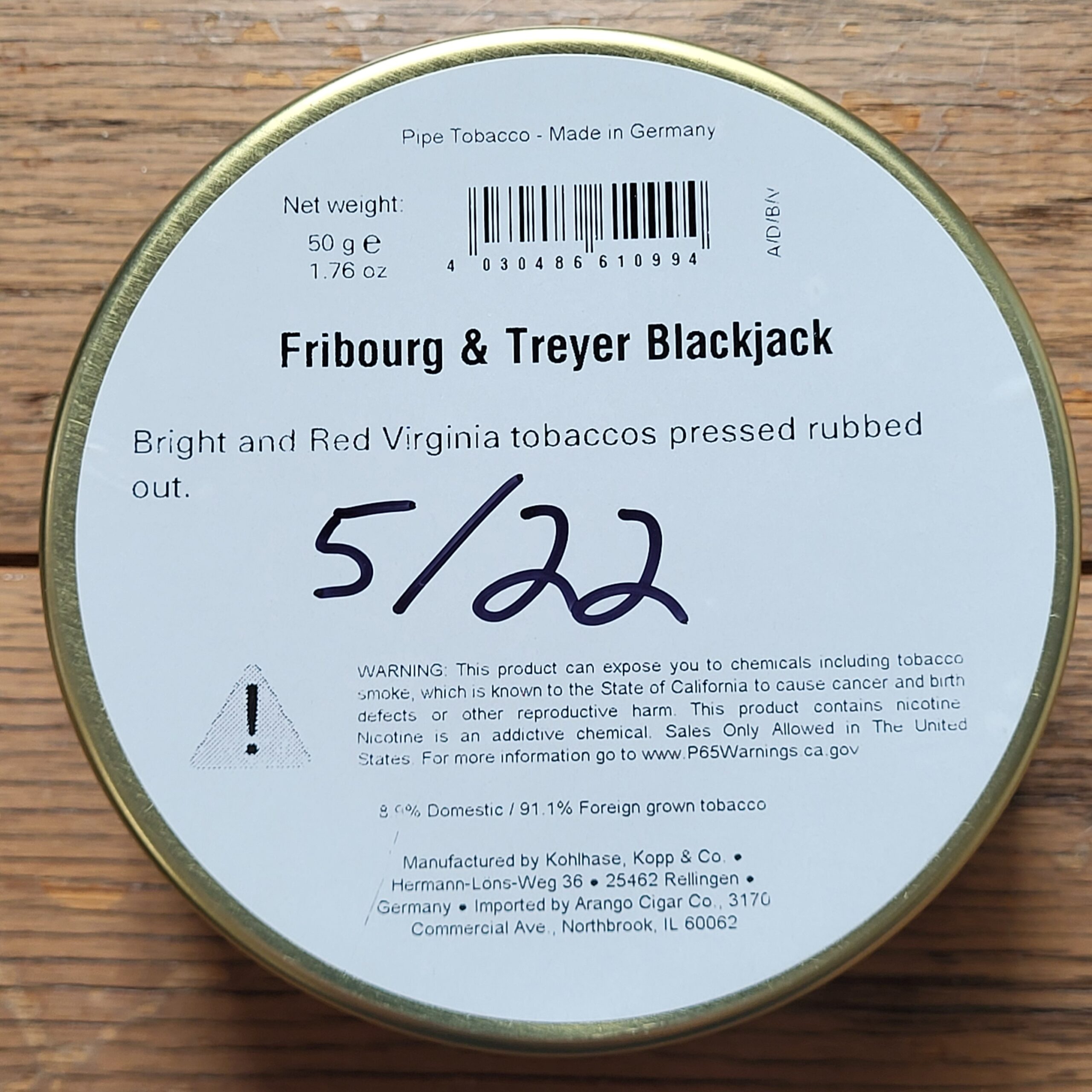 Fribourg & Treyer Blackjack 50g Sealed 2022 Tin. This tin has been safely stored in a climate controlled environment and its seal remains strong and intact. Made in Germany.