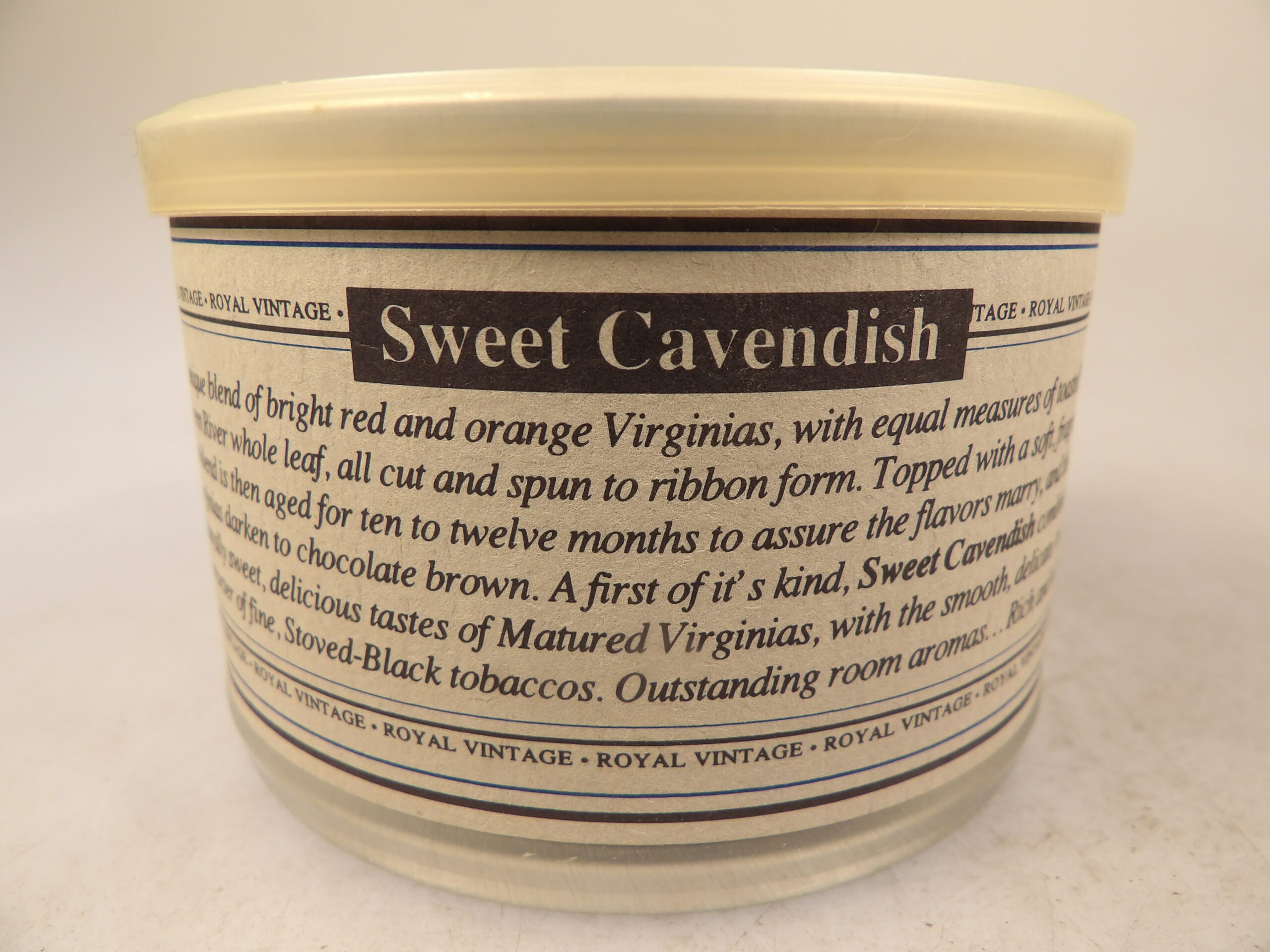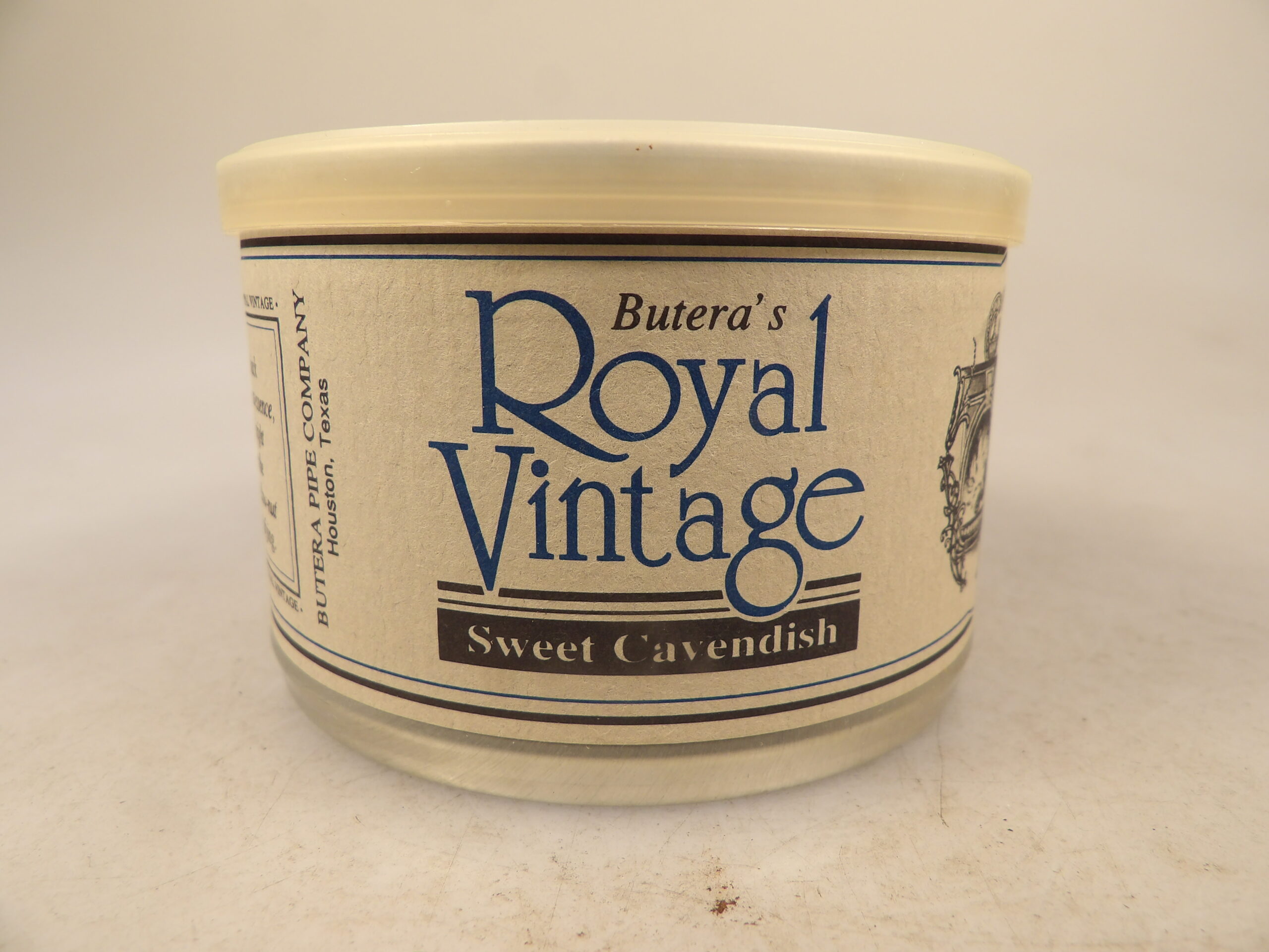 DESCRIPTION: Here is an auction sale. It is a Collectible 2005 Butera’s Royal Vintage Sweet Cavendish Sealed 50g Pipe Tobacco Tin. A unique blend of Bright Red & Orange Virginia's with equal measures of Toasted Black Green River whole leaf, all cut and spun to ribbon form. It’s easy to pack and light for an even cool white ash burn and taste on the tongue. Good Luck Bidding, Thanks for stopping by.