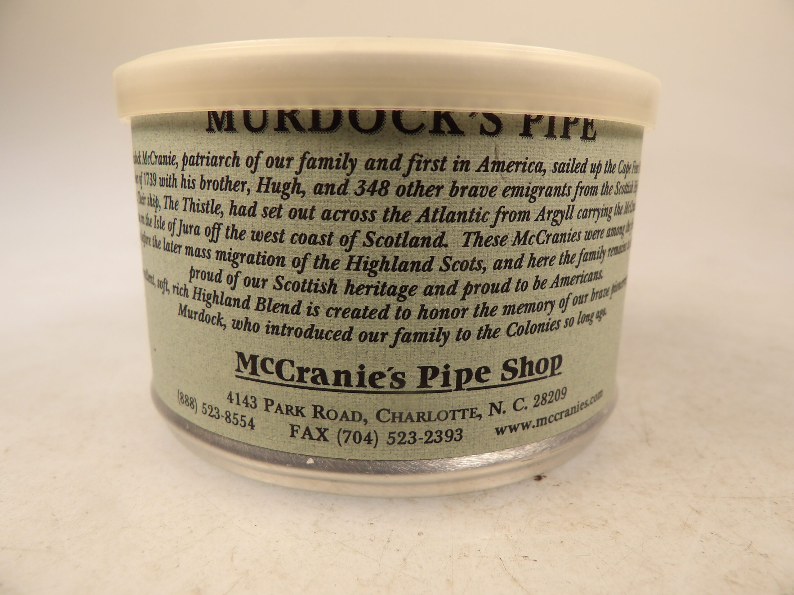 DESCRIPTION: Here is an auction for sale. It is a Vintage Collectible 2000 McClelland for McCranies Pipe Shop Murdock’s Pipe Blend 2 oz’s Sealed Pipe Tobacco Tin. This soft but rich Latakia, Oriental, Turkish, Virginia Highland mixture is for the seasoned smoker. Fine matured Virginia base. Notes: Named for Murdock McCranie, who sailed for America in 1739 along with his brother, Hugh, and 348 others aboard The Thistle. This tin is sealed and has never been opened. Good Luck Bidding and Thanks for Stopping by.