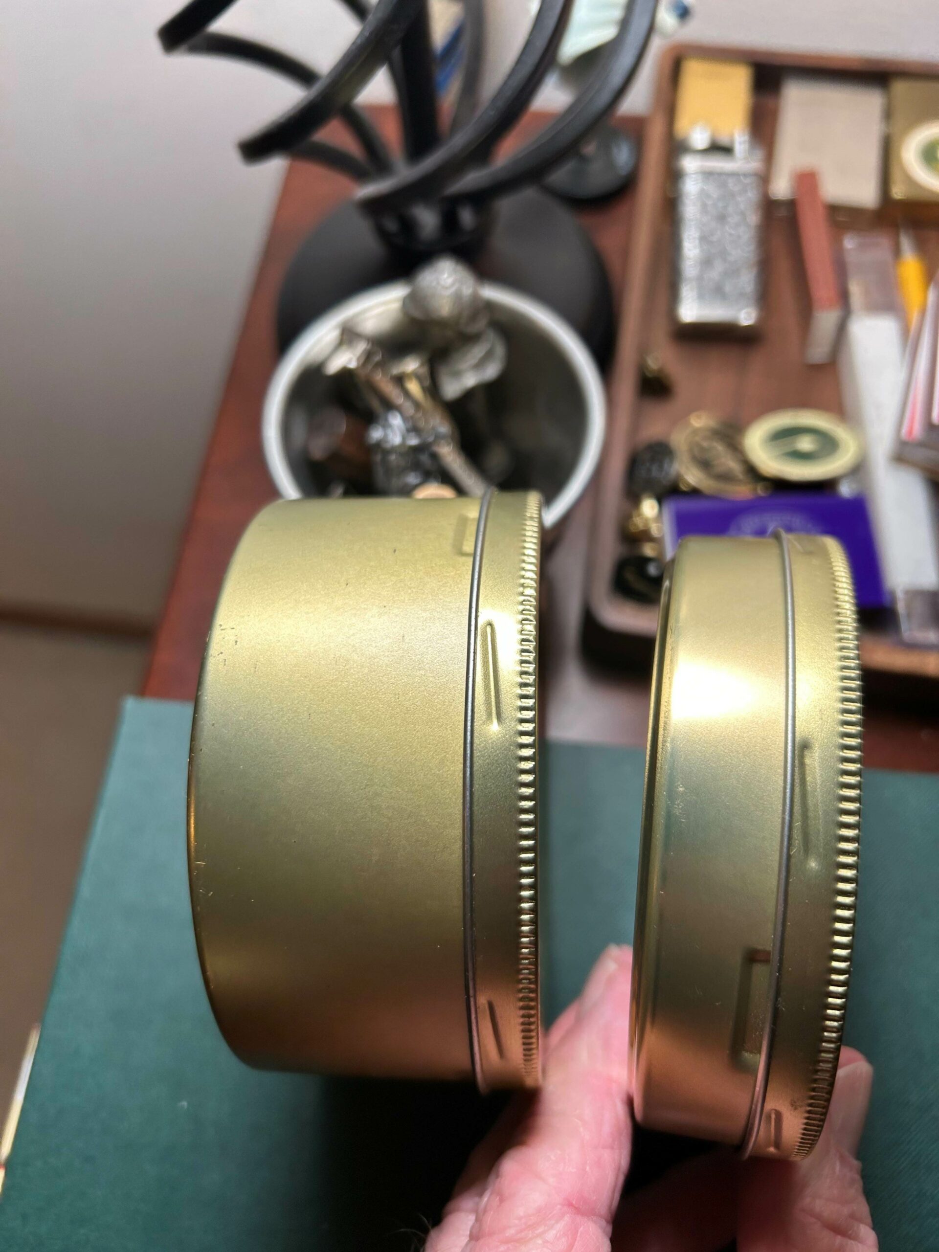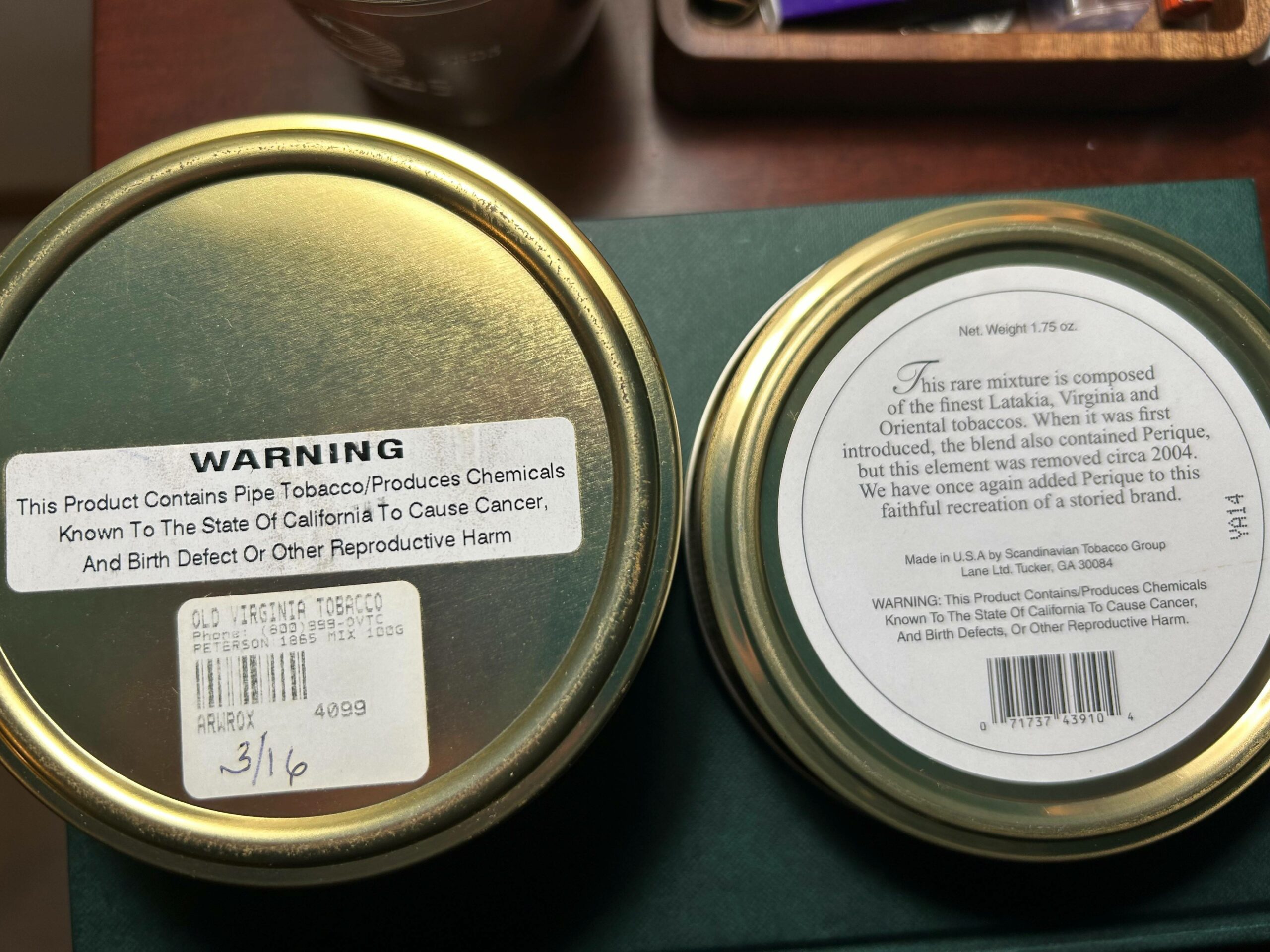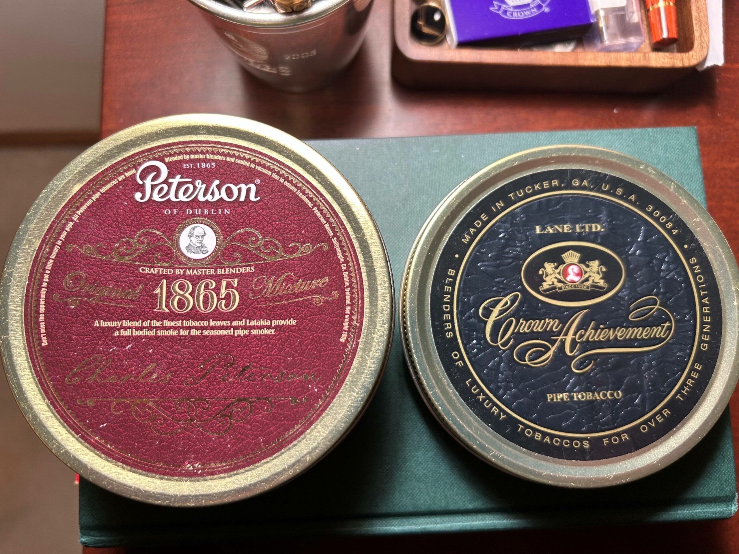 Two doggone good Englishes! The Peterson is a 350gm tin (the thick one in the picture), the Crown Achievement is a return to the original formula - with Perique! One of the best Lane's blends in the universe! I'm not sure how long it has been aging to be honest.