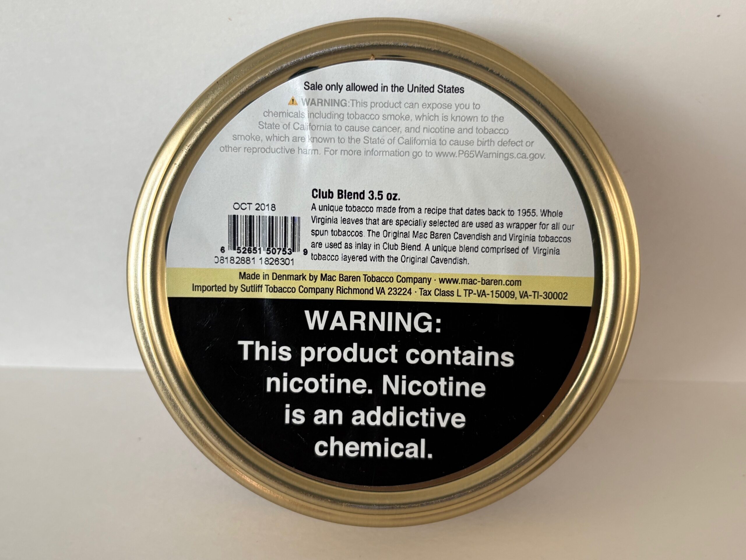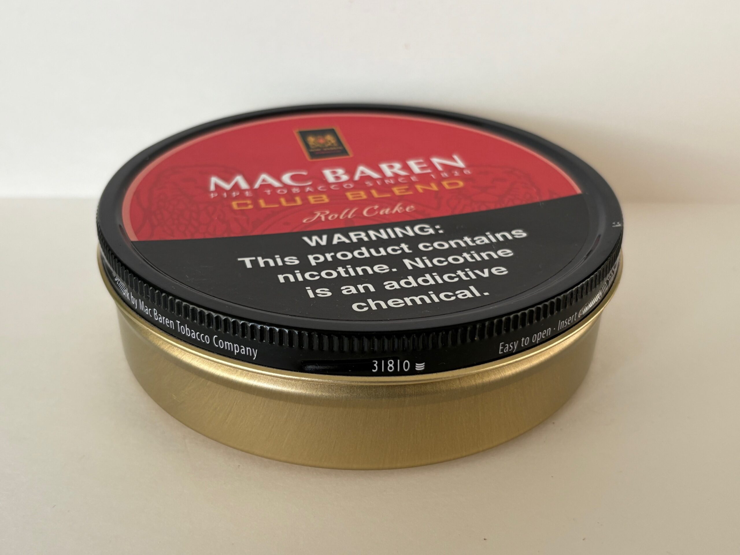 Unopened 3.5 ounce tin of 2018 Mac Baren Club Blend Roll Cake.