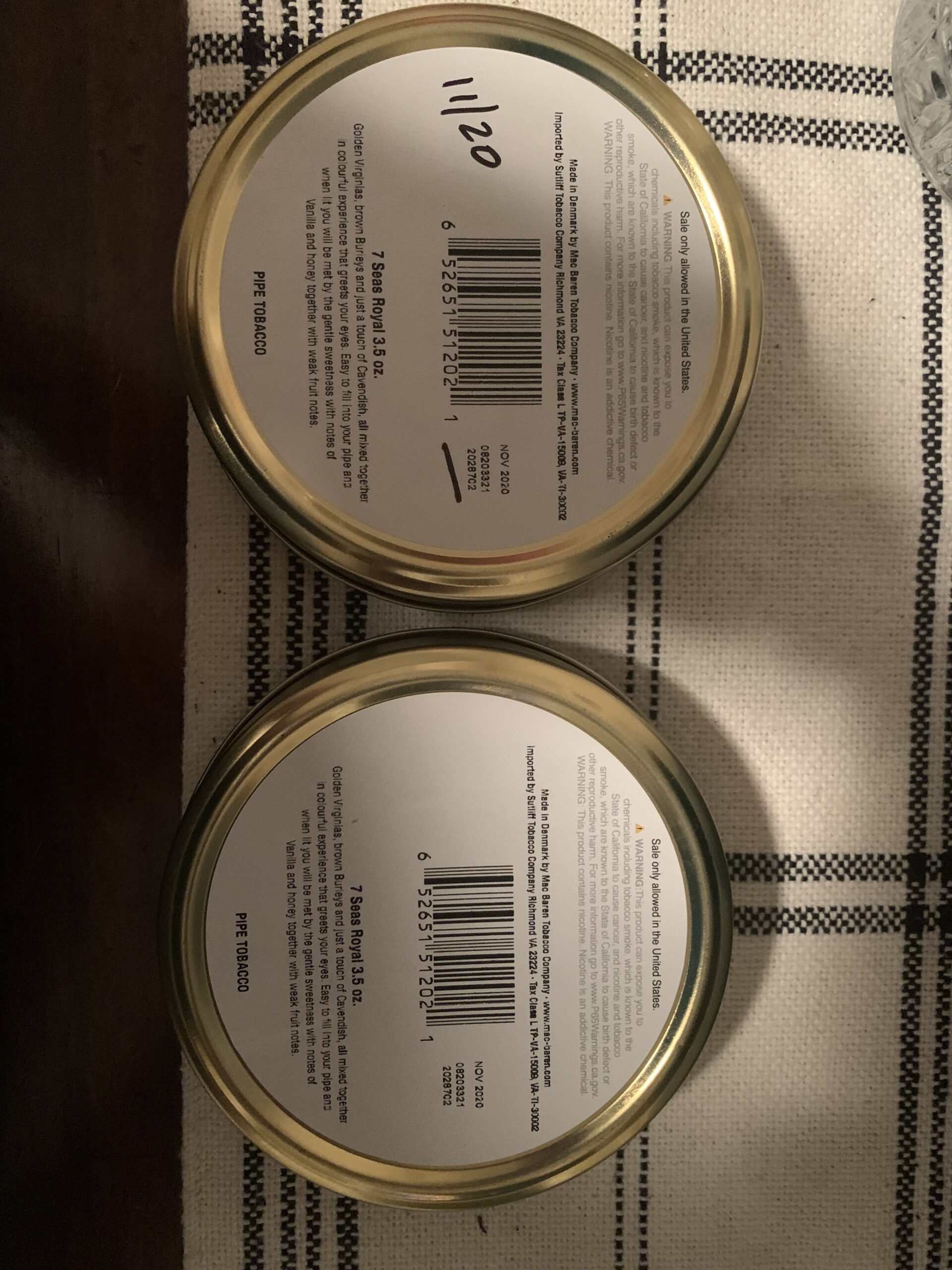 2- 3.5oz tins of Mac Baren 7 Seas Royal Blend from 2020. All tins factory sealed and stored in a climate controlled cellar.