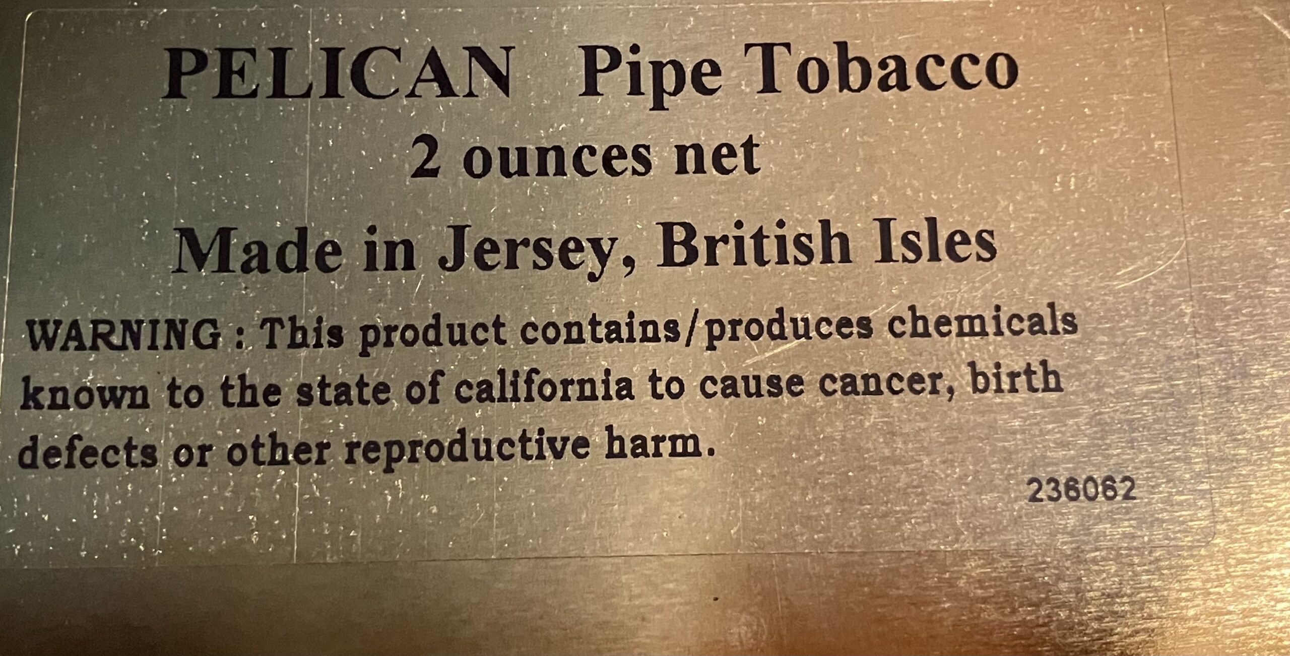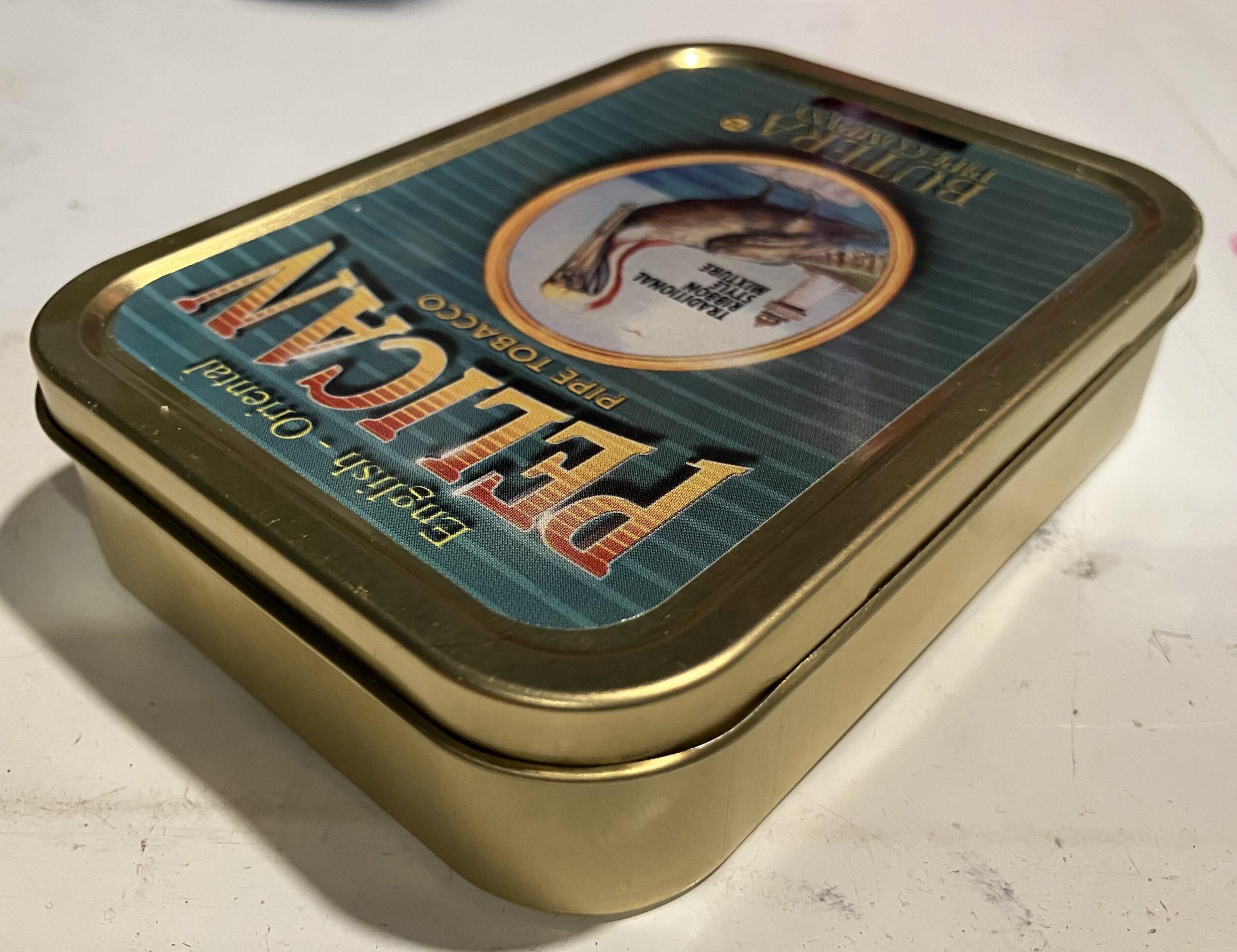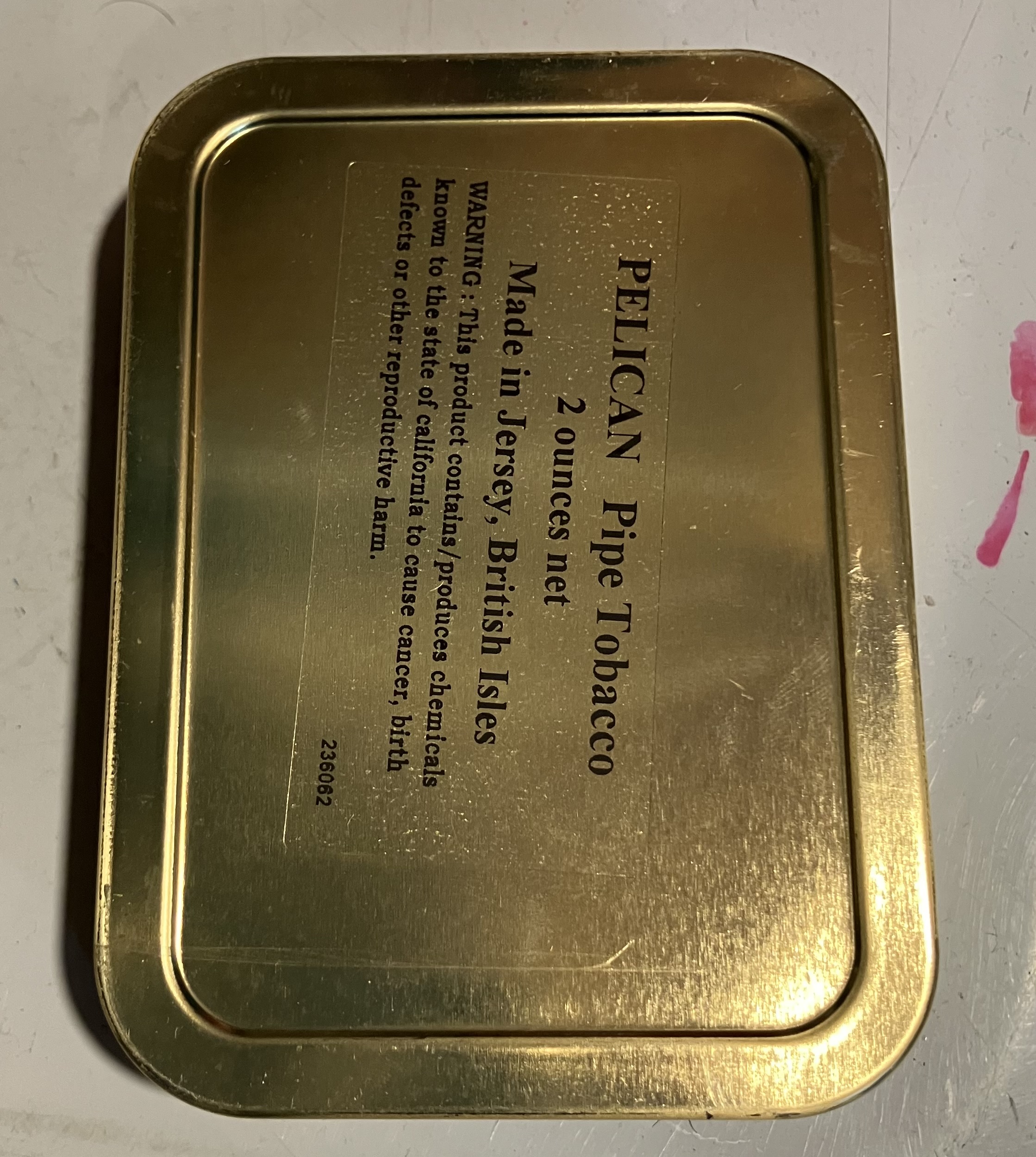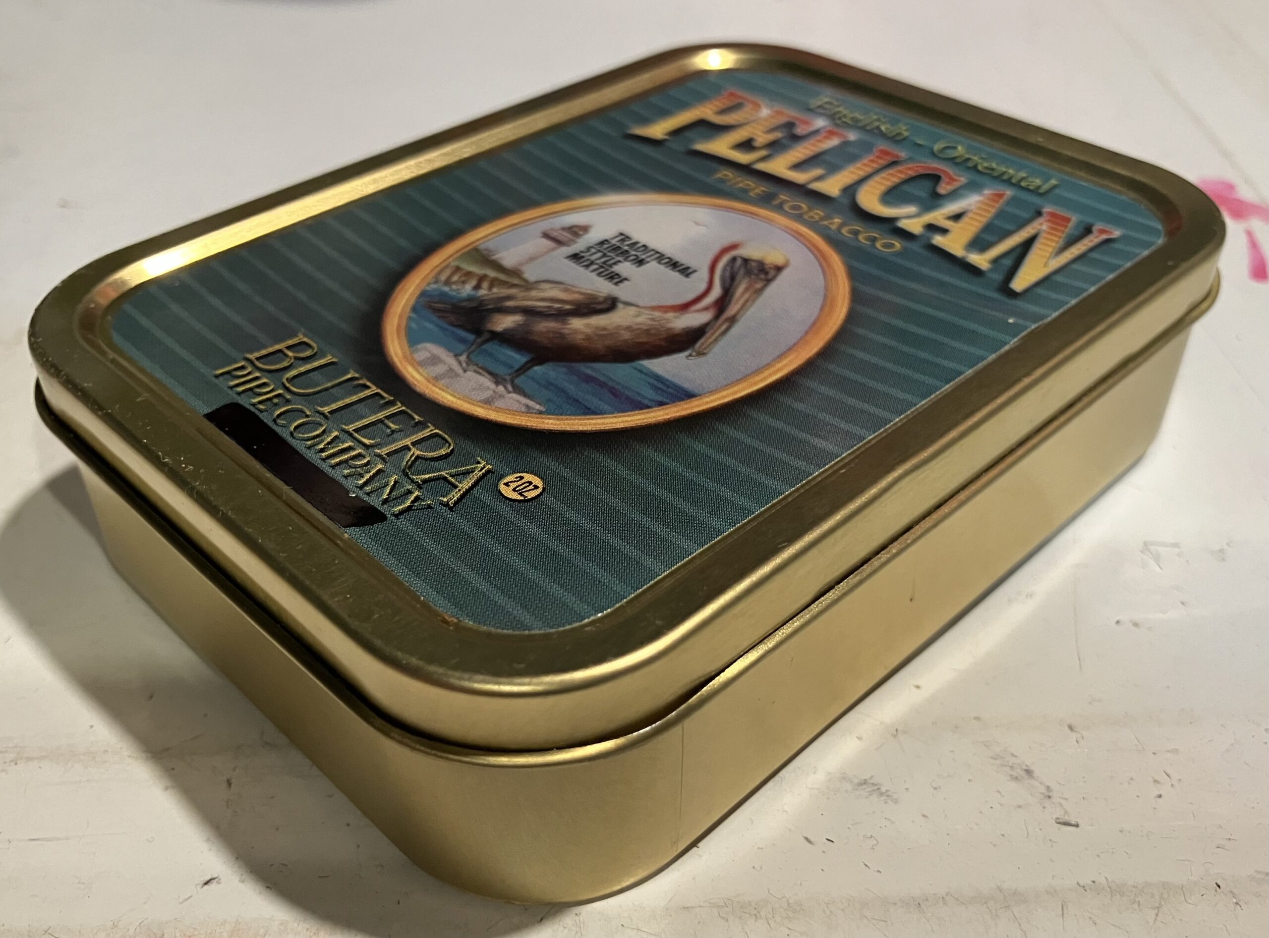 A sealed tin of Pelican pipe tobacco Bottom tin stamp is “236062” 2 oz net.