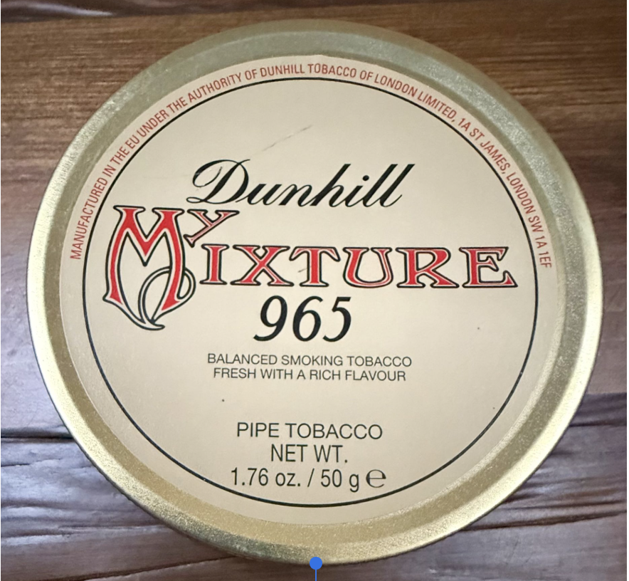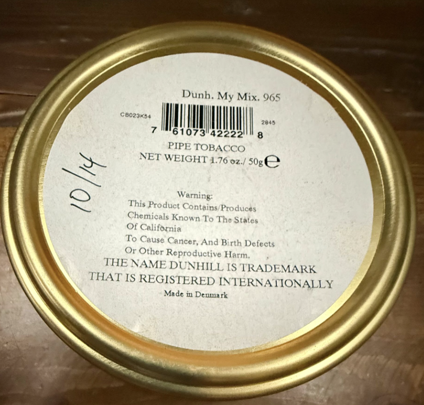 Purchase date: October 2014. Dunhill 'My Mixture 965' is a classic, full-bodied English/Scottish blend known for its harmonious balance of smoky, rich, nutty, and subtly sweet flavors. It is now sold under the Peterson brand name using the original recipe.