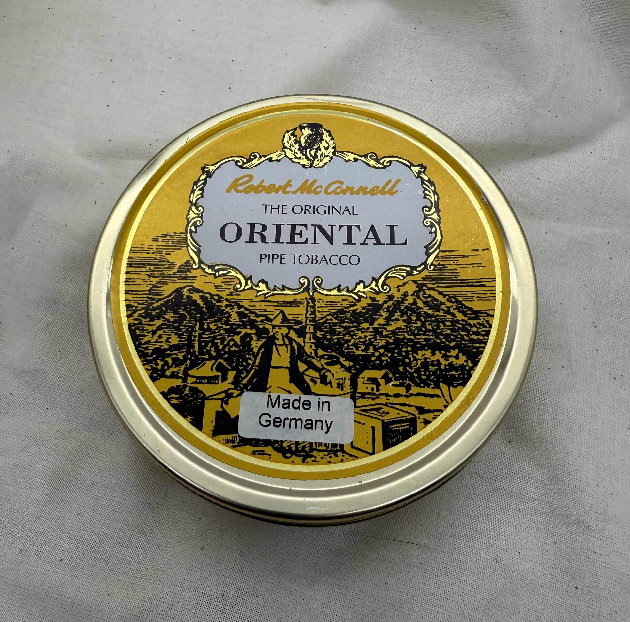 Unopened 50 gram tin of Robert McConnell Original Oriental pipe tobacco. 8/01 purchase date.