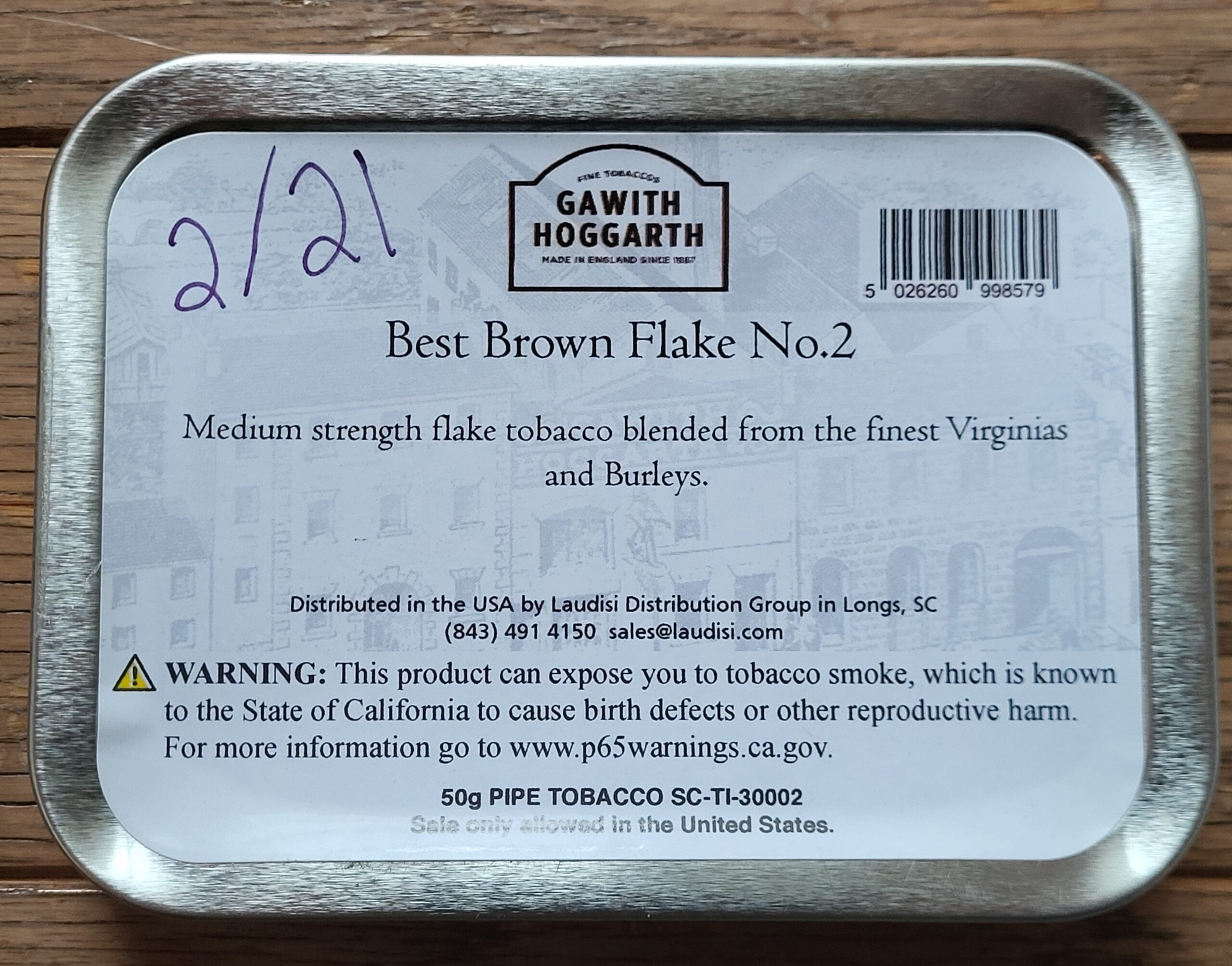 Gawith Hoggarth & Co. Best Brown Flake No.2 50g Sealed 2021 Tin. This tin has been safely stored in a climate controlled environment and its seal remains strong and intact. Made in England.