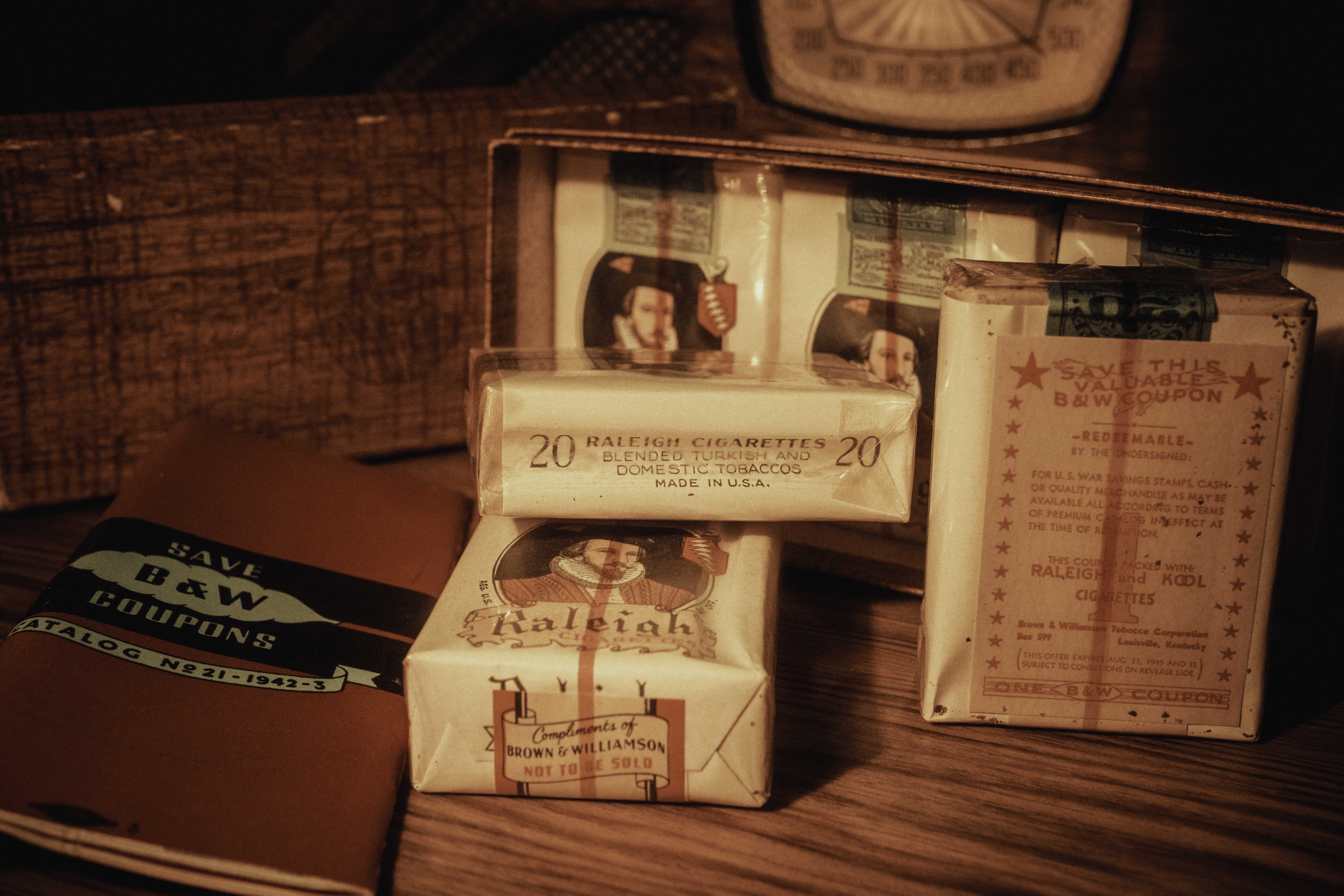 This is a genuine wartime Raleigh Cigarettes carton set from 1942, consisting of six unopened packs with 20 cigarettes per pack, preserved together with the original Brown and Williamson coupon catalog. The carton, packs, and accompanying material present with a level of sharpness and cohesion that is rarely encountered today. The paper, printing, folds, and overall presentation retain the unmistakable look and feel of the early 1940s.