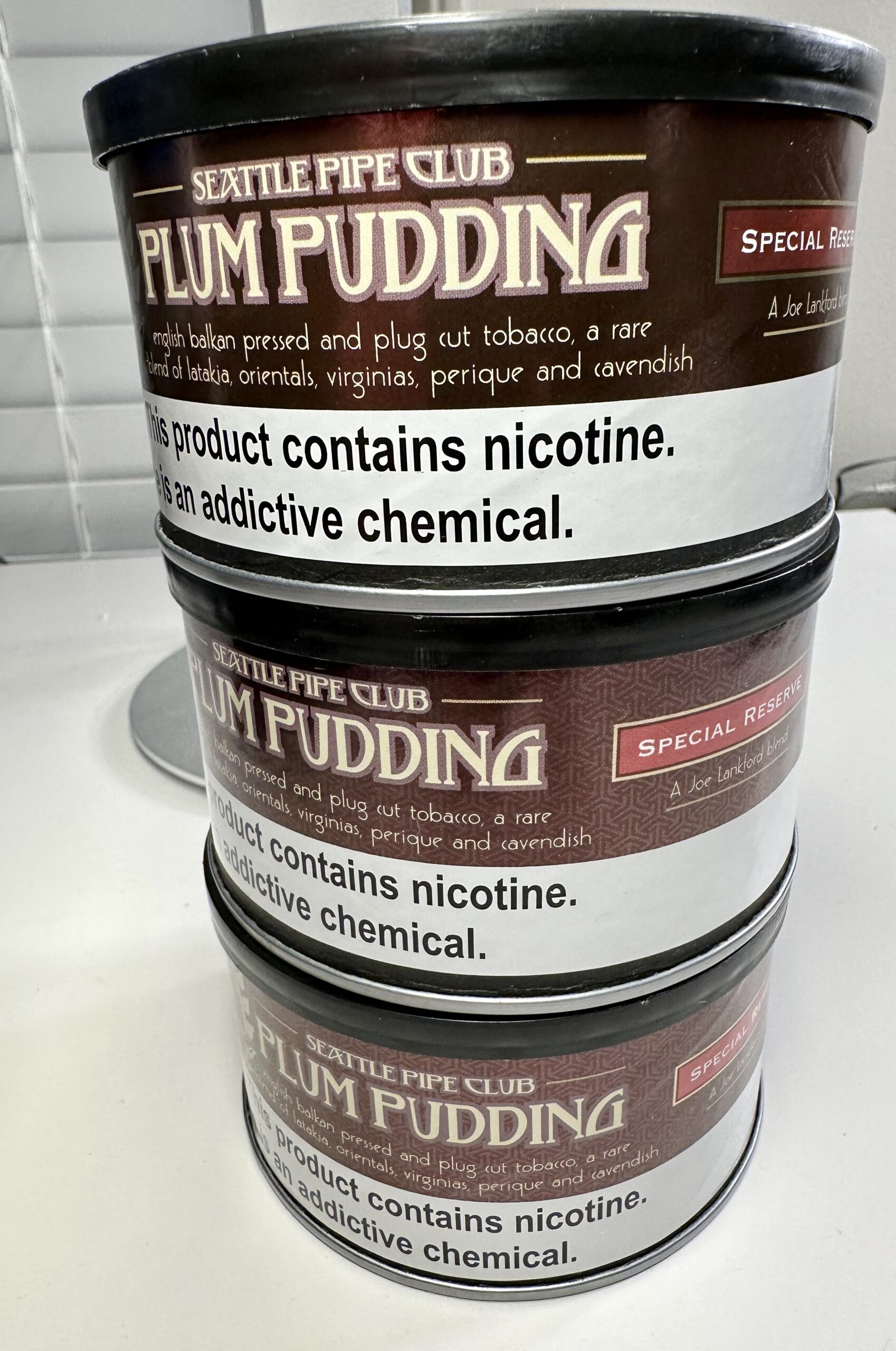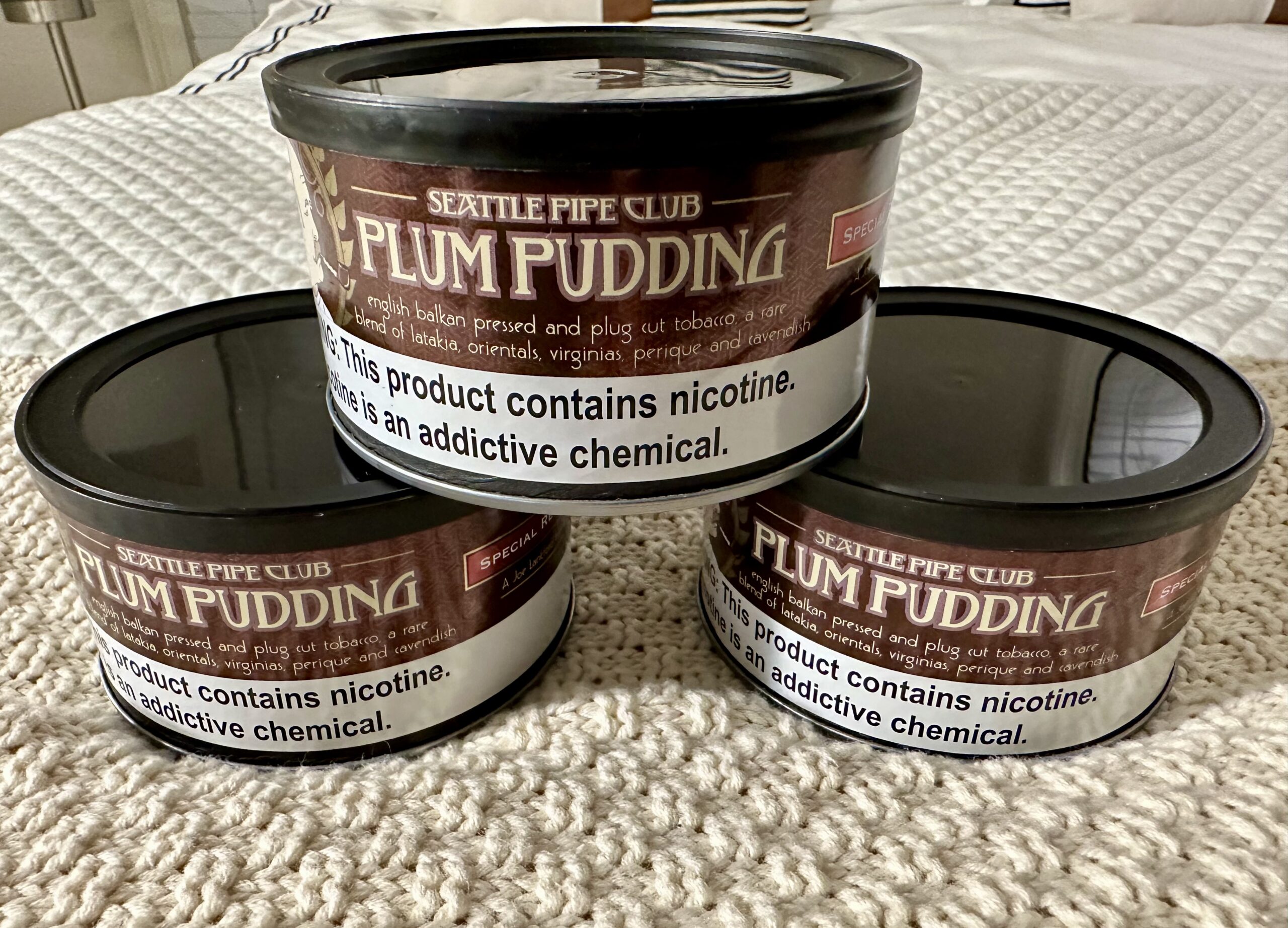 This auction is for three (3) sealed 4.0 ounce tins of Seattle Pipe Club Plum Pudding Special Reserve, 2019 production. Buy it Now for $80 (all 3 tins).