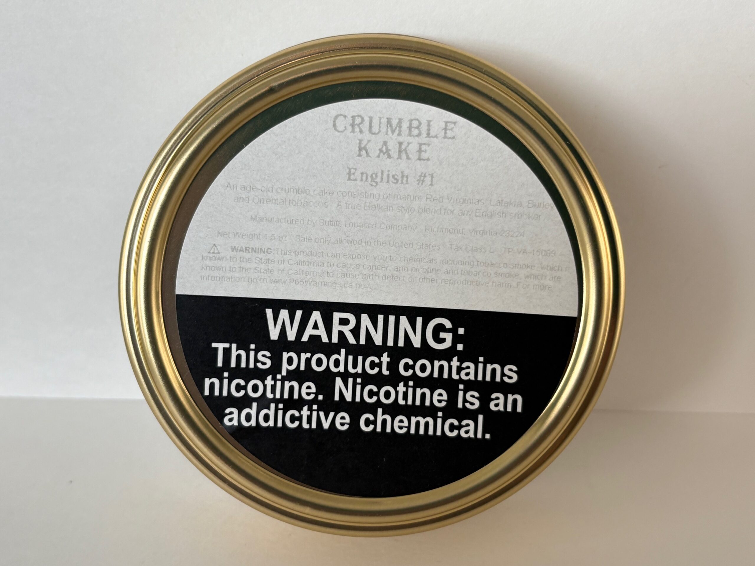 Unopened 1.5 ounce tin of 2020 Sutliff Crumble Kake English #1.