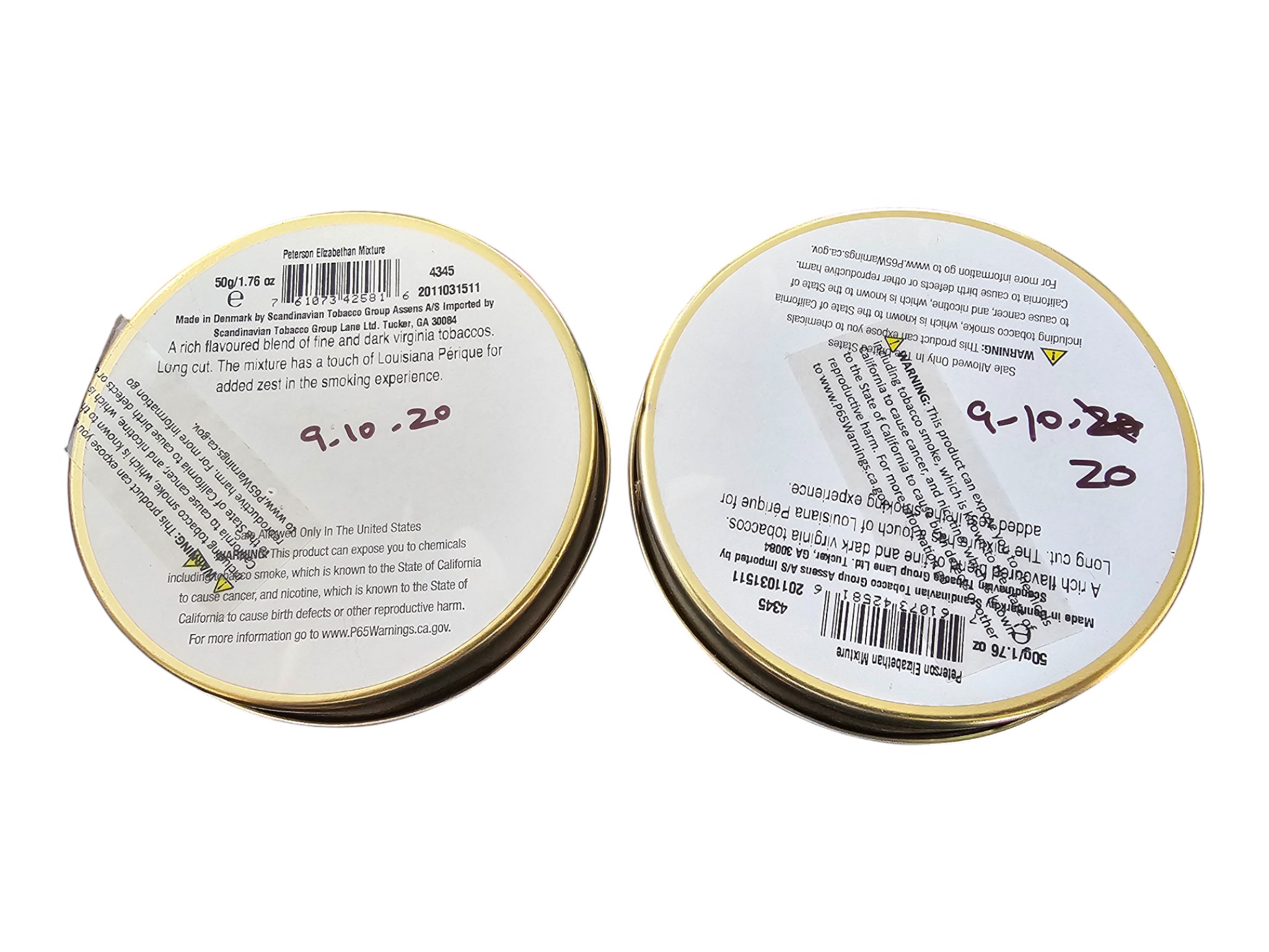 This is for two tins of Peterson Elizabethan Mixture with a production date of March 2020 and a put-in-cellar date of September 2020. These have been stored in a temperature-controlled environment.