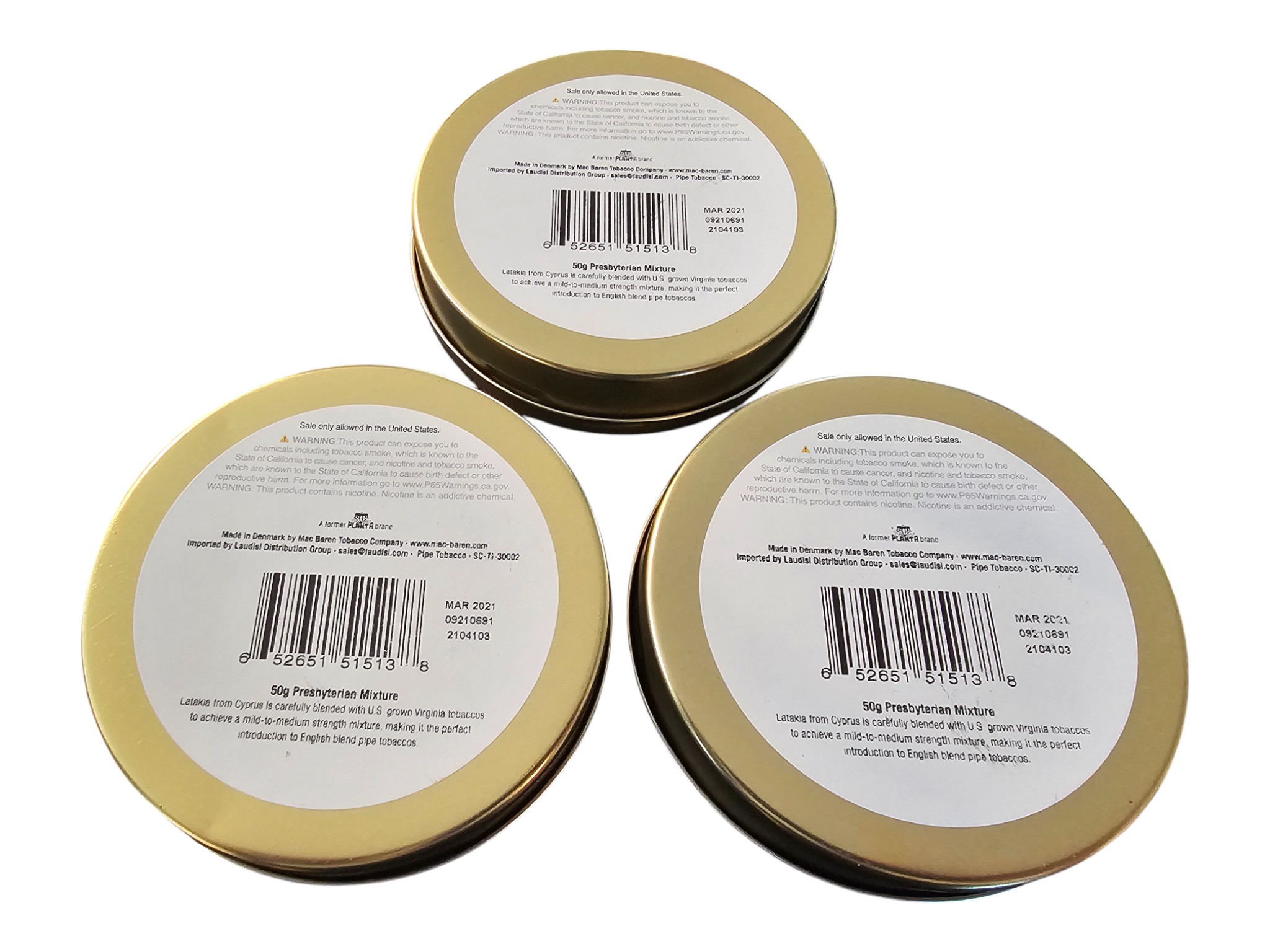 This is for three tins of Presbyterian Mixture with a production date of March 2021. These have been stored in a temperature-controlled environment.