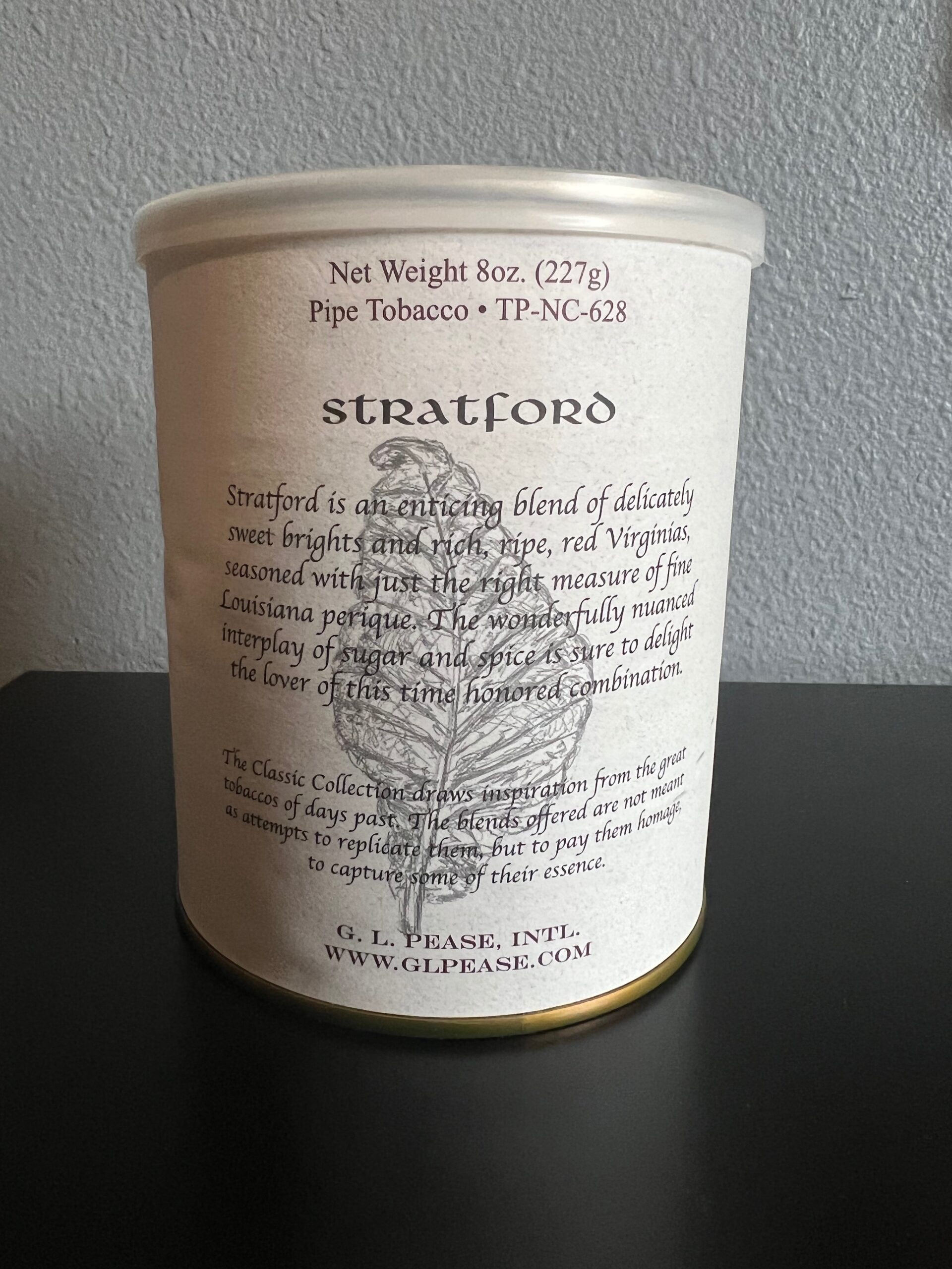 "Stratford is an enticing blend of delicately sweet brights and rich, ripe, red Virginia tobaccos, seasoned with just the right measure of fine Louisiana perique. The wonderfully nuanced interplay of sugar and spice is sure to delight the lover of this time honored combination. The room note is soft and subtle, the taste zesty and piquant. This is the one for the Virginia/Perique fans."