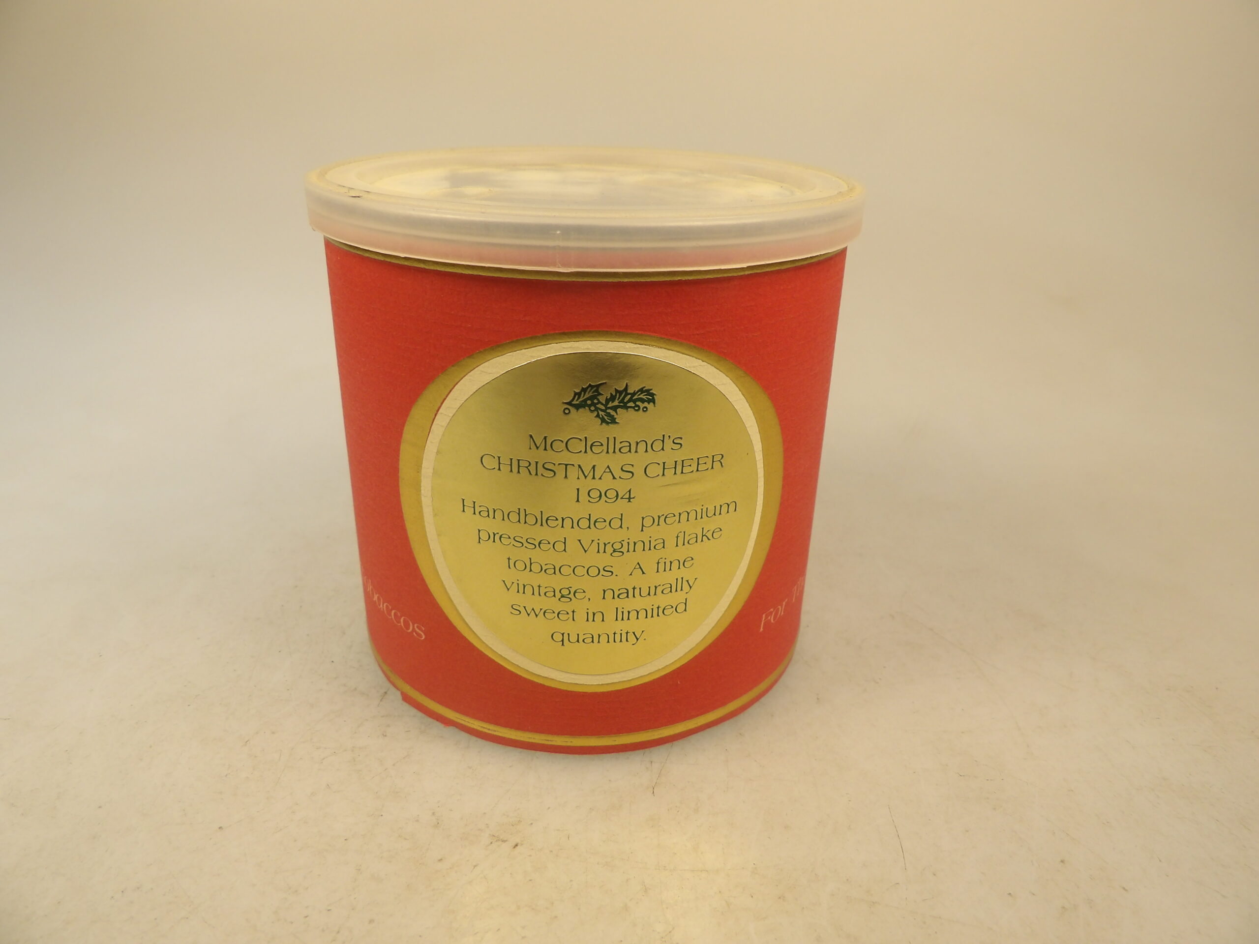 DESCRIPTION: Here is a Vintage Collectible McClelland’s Christmas Cheer 50g Sealed Pipe Tobacco Tin 1994 Edition. This is a gentile smoking blend McClelland Christmas Cheer from 1994 pressed Virginia Broken Flake from a 1993 crop of orange flue-cured Virginia. Sealed and stored indoors. Good Luck Bidding and Thanks for Stopping by.