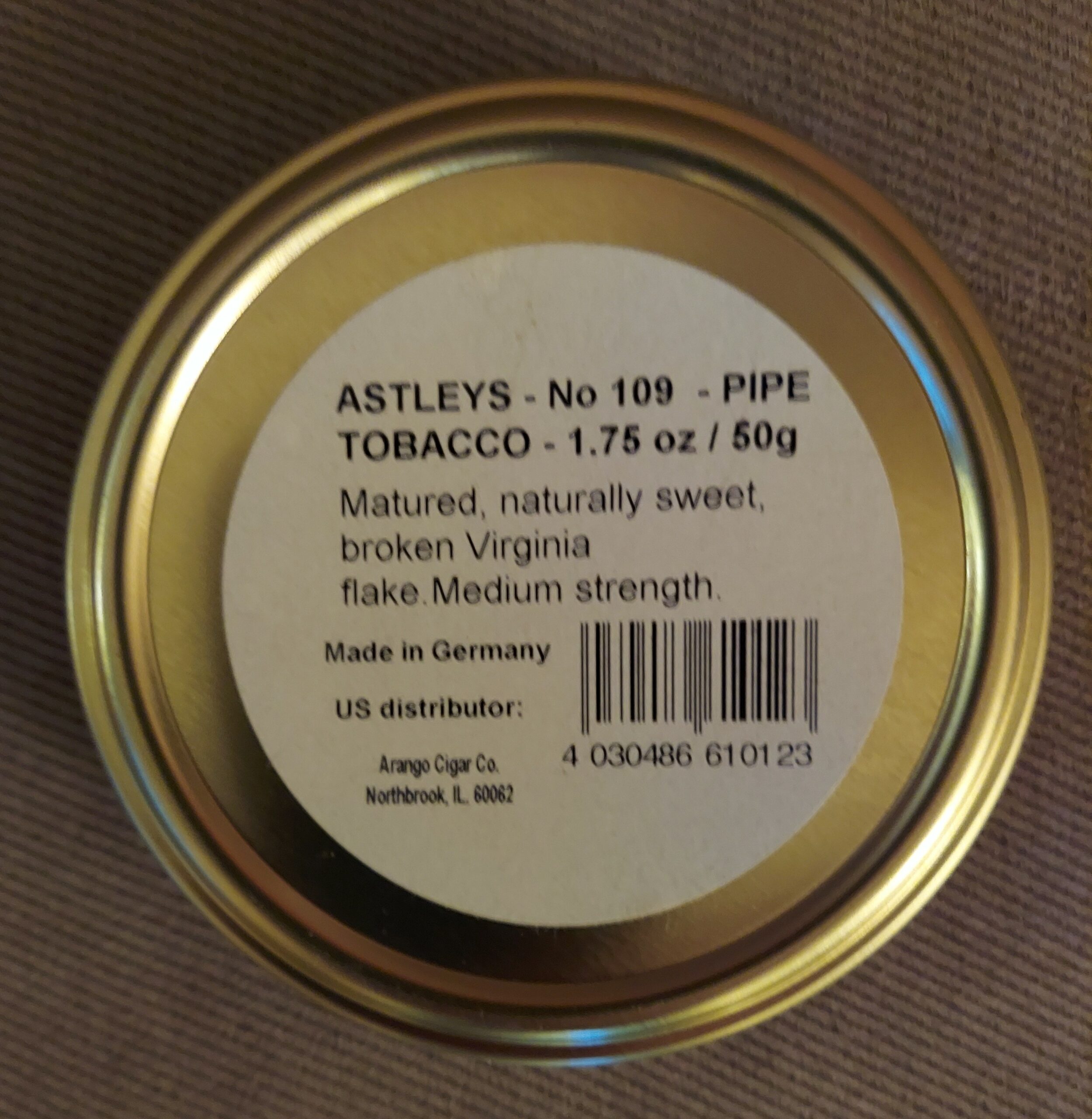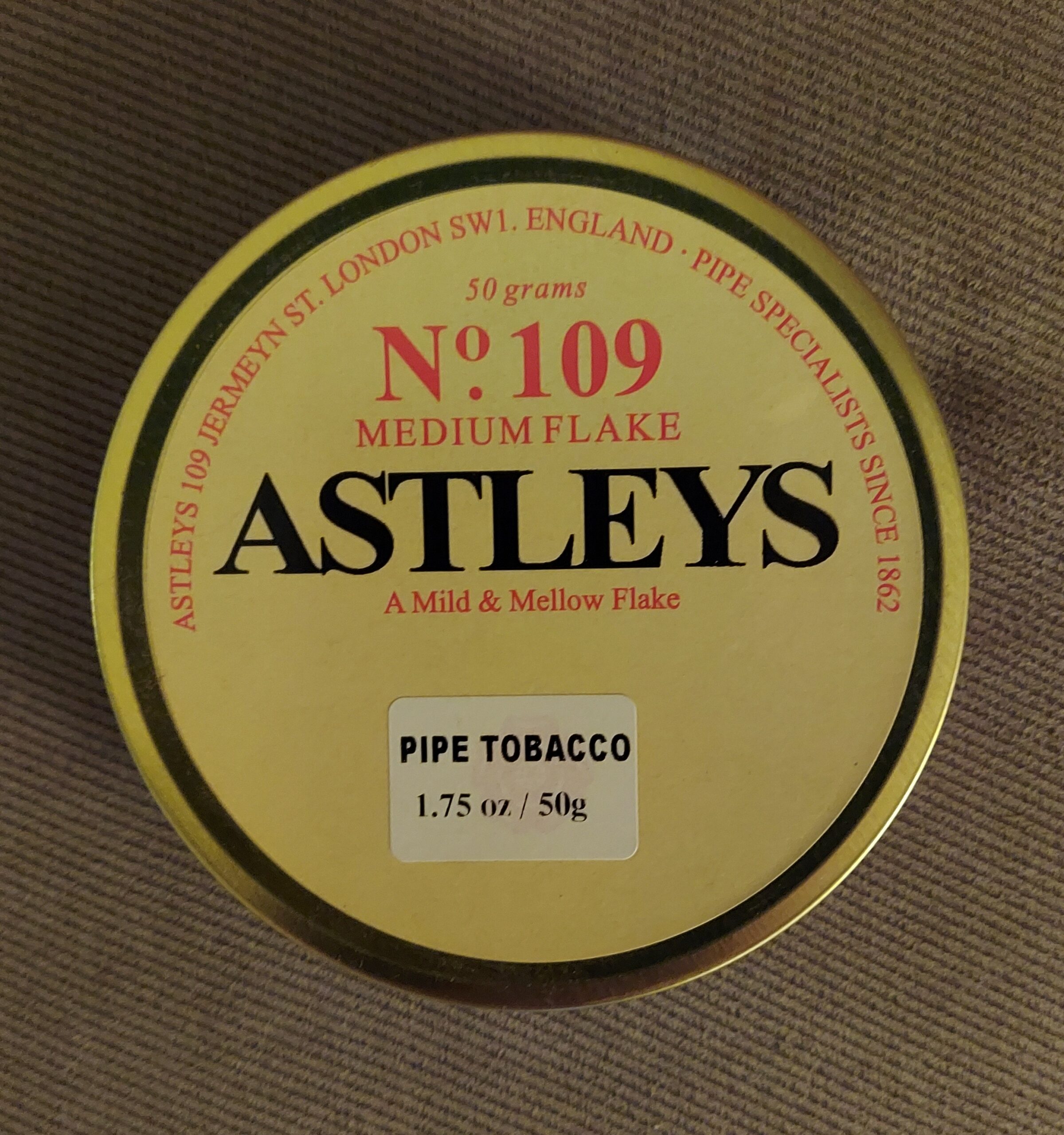 50g tin of Astley No. 109 Medium Flake. This is a great well aged Virginia blend. It does not have a date code but I purchased it in October 2012.