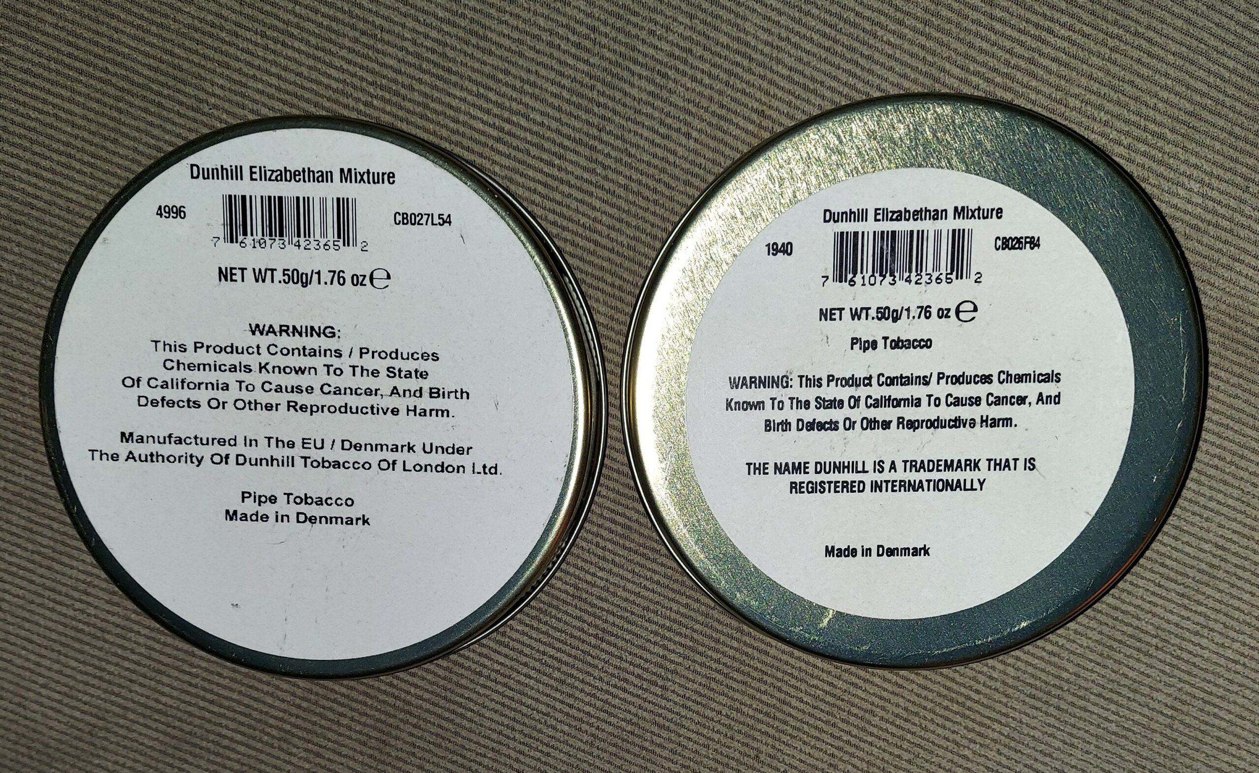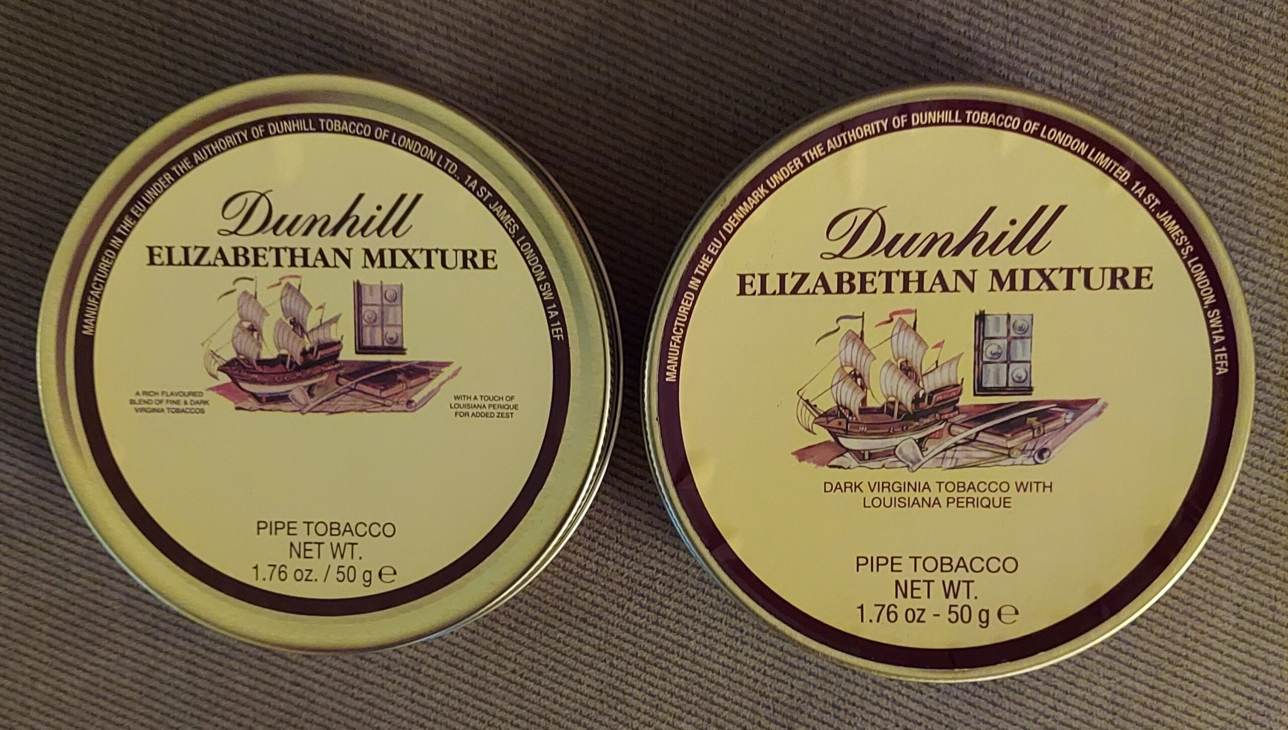 Two 50g tins of Dunhill Elizabethan Mixture. One has date code June 2016, one has date code December 2017.