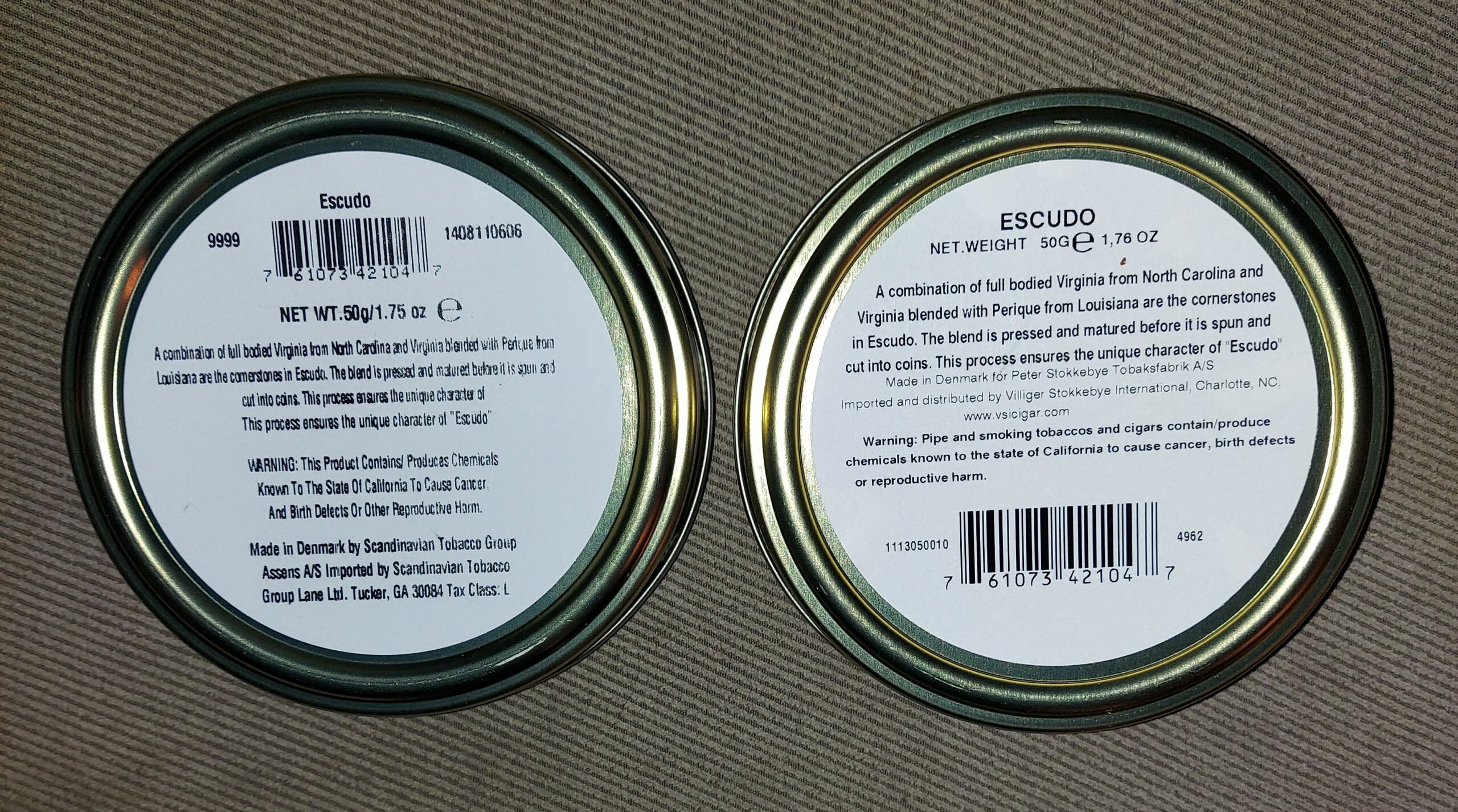 Two 50g tins of Escudo Navy De Luxe. One has date code 2011, one has date code 2014.