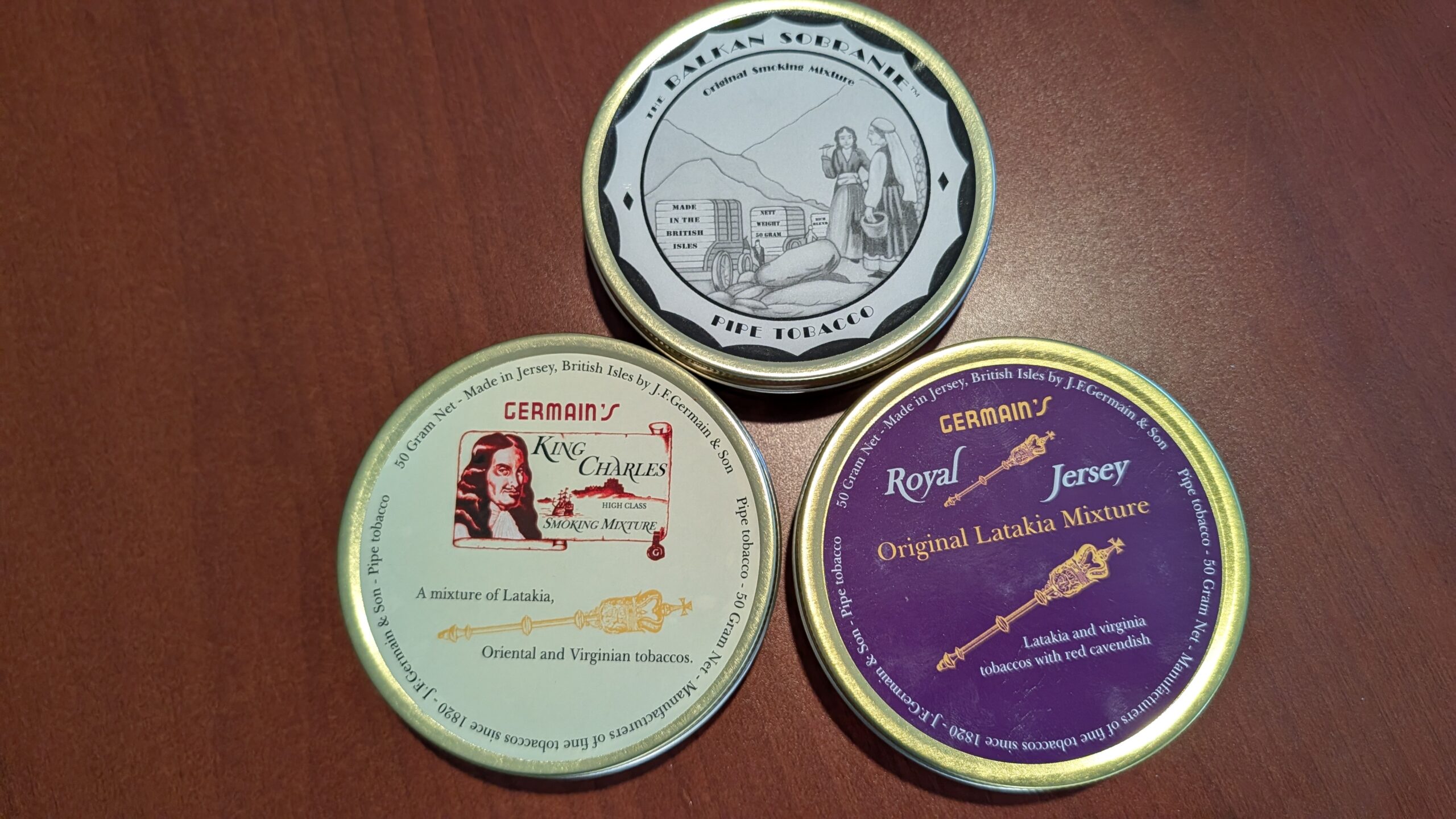 J.F. Germain & Son English Sampler - Balkan Sobranie, Royal Jersey Original Latakia Mixture, and King Charles Smoking Mixture
