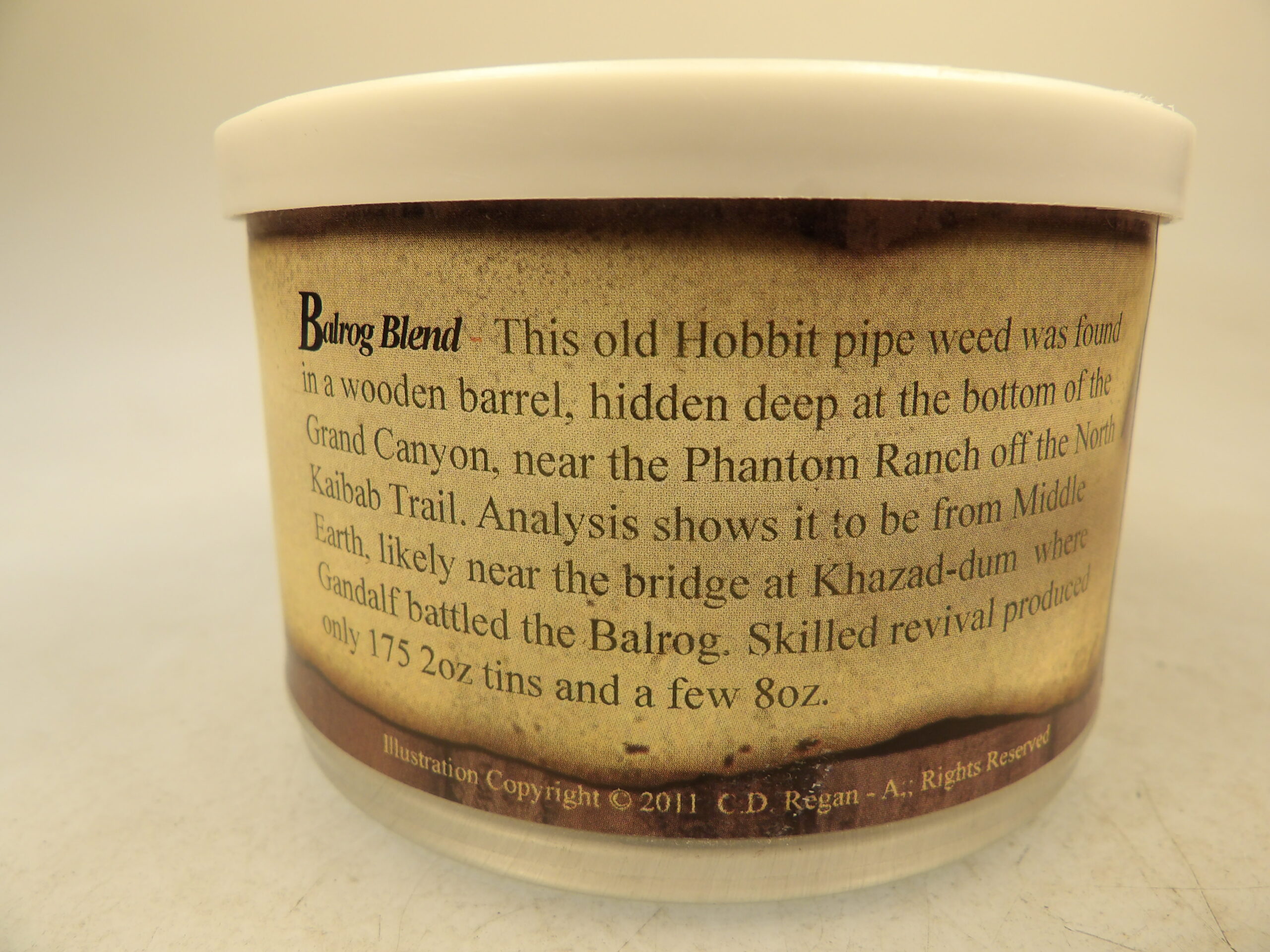 DESCRIPTION: Here is an auction for sale. It is a Vintage Collectible 11 Years Old G.L. Pease NASPC Balrog Blend 2 oz’s Sealed Pipe Tobacco Tin Annual 2011 Show. This tin is sealed and has never been opened. This tin is a limited blend tin produced for this year only during the NASPC annual show. The Tobacco contained within is an English Blend using Latakia, Virginia Mix. This old hobbit pipe weed was found in a wooden barrel, hidden deep at the bottom of the Grand Canyon, near the Phantom Ranch off the North Kaibab Trail. Analysis shows it to be from Middle Earth, Likely near the bridge at Khazad-dum where Gandalf battled the Balrog. Skilled revival produced only 175 2 oz. tins. Notes: One of two 2011 NASPC Blends by GL Pease; the other was Arrakis Spice. Only 175 tins of each blend were produced. Good Luck Bidding and Thanks for Stopping by.