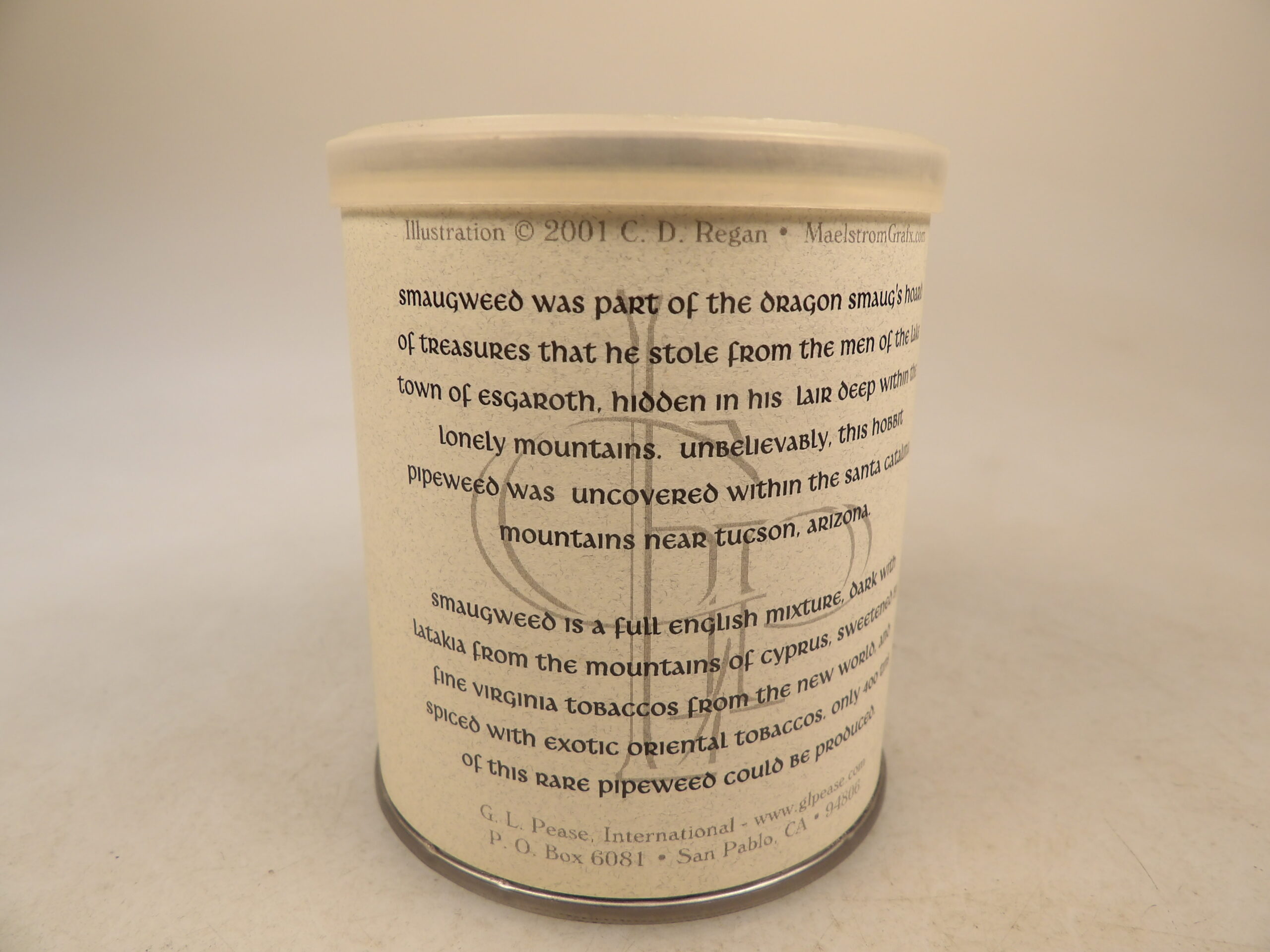 DESCRIPTION: Here is an auction for sale. It is a Vintage Collectible 2001 G.L. Pease NASPC Blend. This very special Hobbit pipe weed, Smaugweed is a full English mixture, dark with Latakia form the mountains of Cyprus, sweetened by fine Virginia tobaccos from the new world, and spiced with exotic Oriental tobaccos. G.L. Pease's Smaugweed (a NASPC special blend) reviews are mixed but lean positive, often described as a well-balanced, flavorful Balkan/English with rich, slightly fruity/spicy notes from Virginias and Latakia, though some find it too mild or lacking definition, needing age to truly shine; it's considered a collector's item from the Lord of the Rings series.} Flavor Profile: Smokers note plumy, licorice, pepper, and even grape-like notes from the natural tobaccos, with a full taste but balanced intensity where no single leaf dominates. Good Luck Bidding and Thanks for Stopping by.